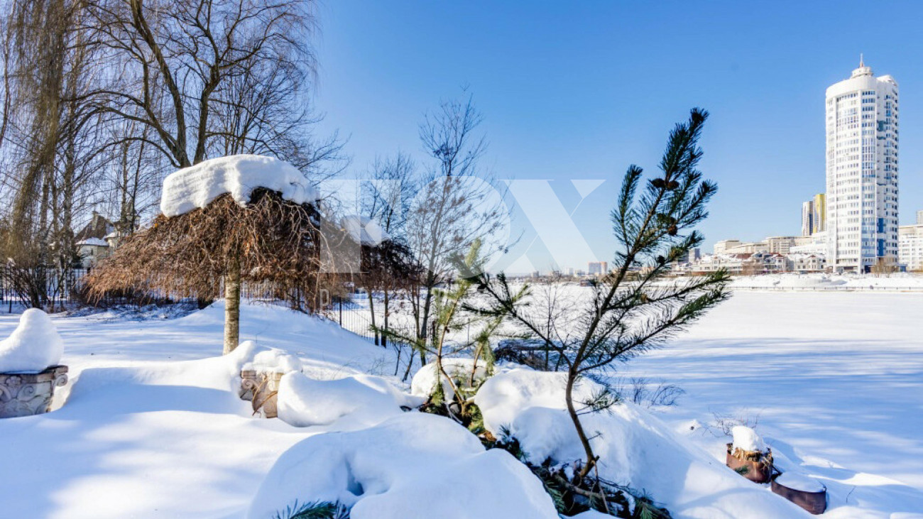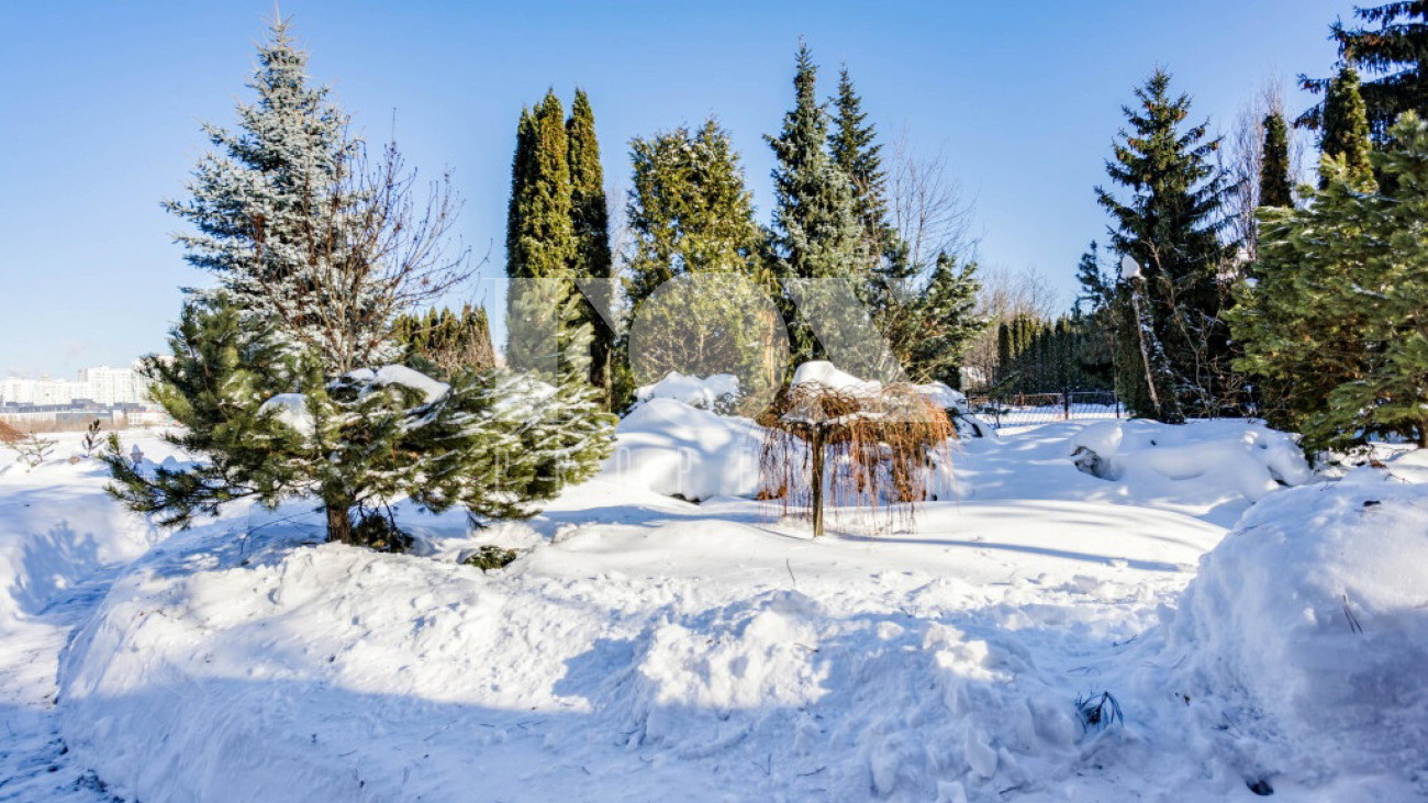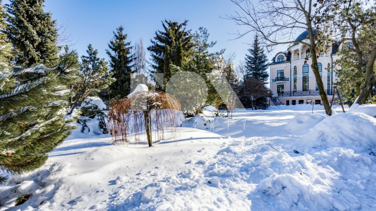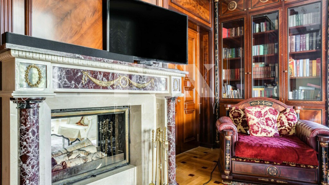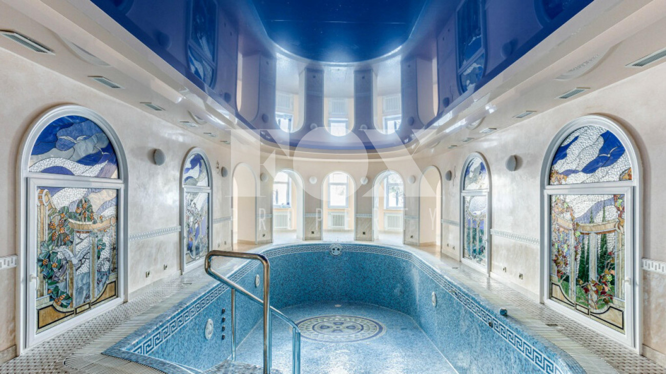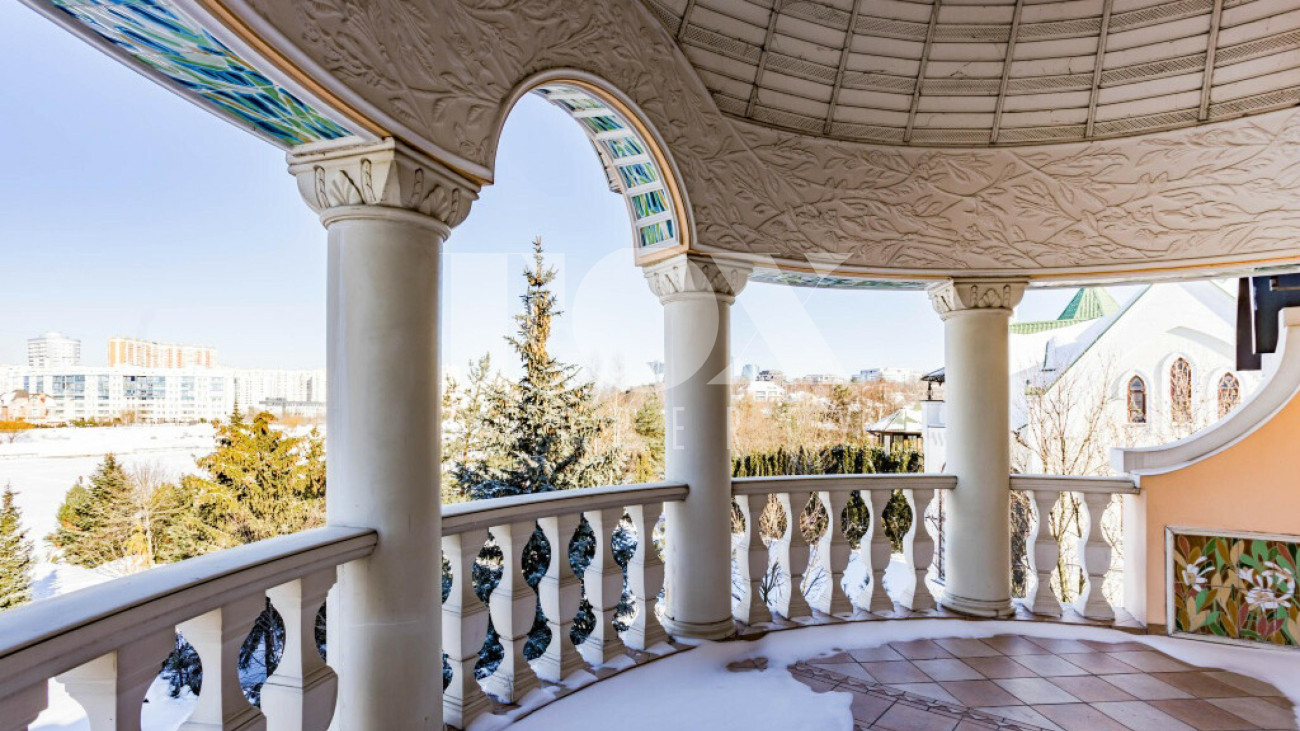 Придомовая территория поражает своей красотой и ухоженностью: среди вывмощенных дорожек возвышаются вечнозеленые ели и сосны, создавая атмосферу приватности в окружении живописного ландшафта. Фасад здания выполнен в классическом стиле с изящной лепниной, колоннами и балюстрадами, что подчеркивает высокий статус объекта.