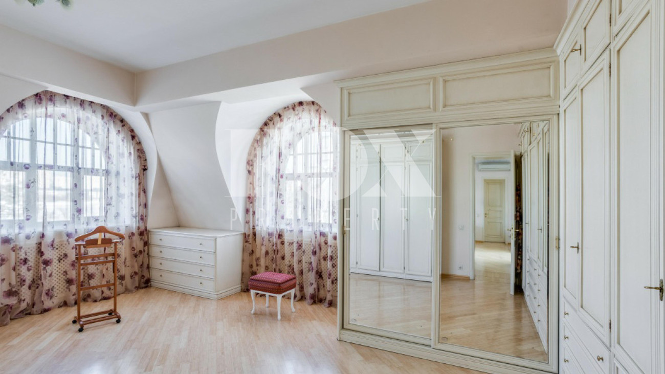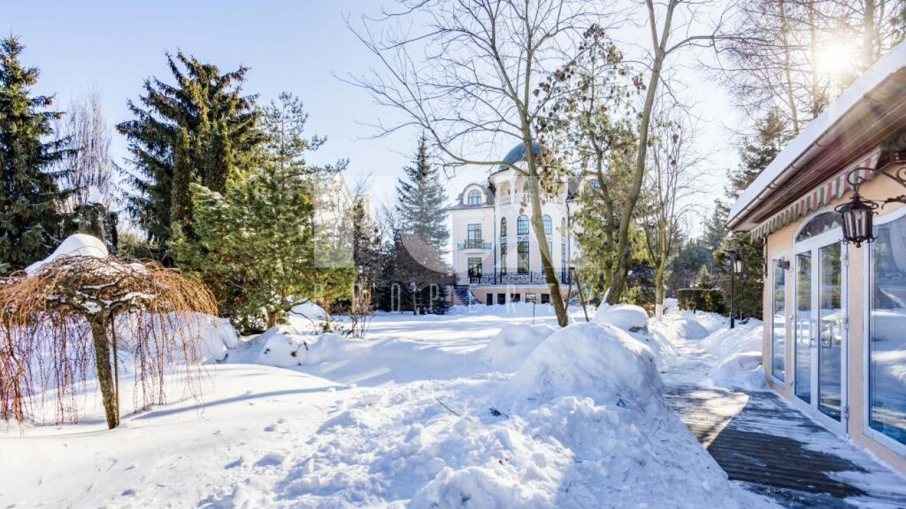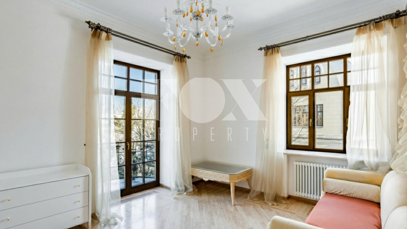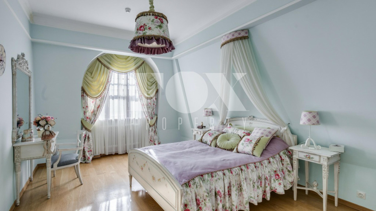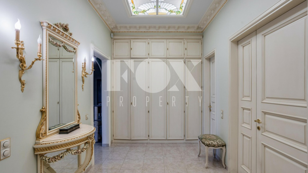 Придомовая территория поражает своей красотой и ухоженностью: среди вывмощенных дорожек возвышаются вечнозеленые ели и сосны, создавая атмосферу приватности в окружении живописного ландшафта. Фасад здания выполнен в классическом стиле с изящной лепниной, колоннами и балюстрадами, что подчеркивает высокий статус объекта.