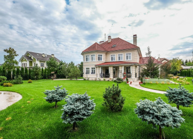Беседка с мангалом, барбекю и мини-кухней спрятана на участке в тени раскидистых елей. Вокруг особняка создан аккуратный ландшафт, проложены прогулочные дорожки с вечерней подсветкой, растут высокие раскидистые ели и густые кустарники.