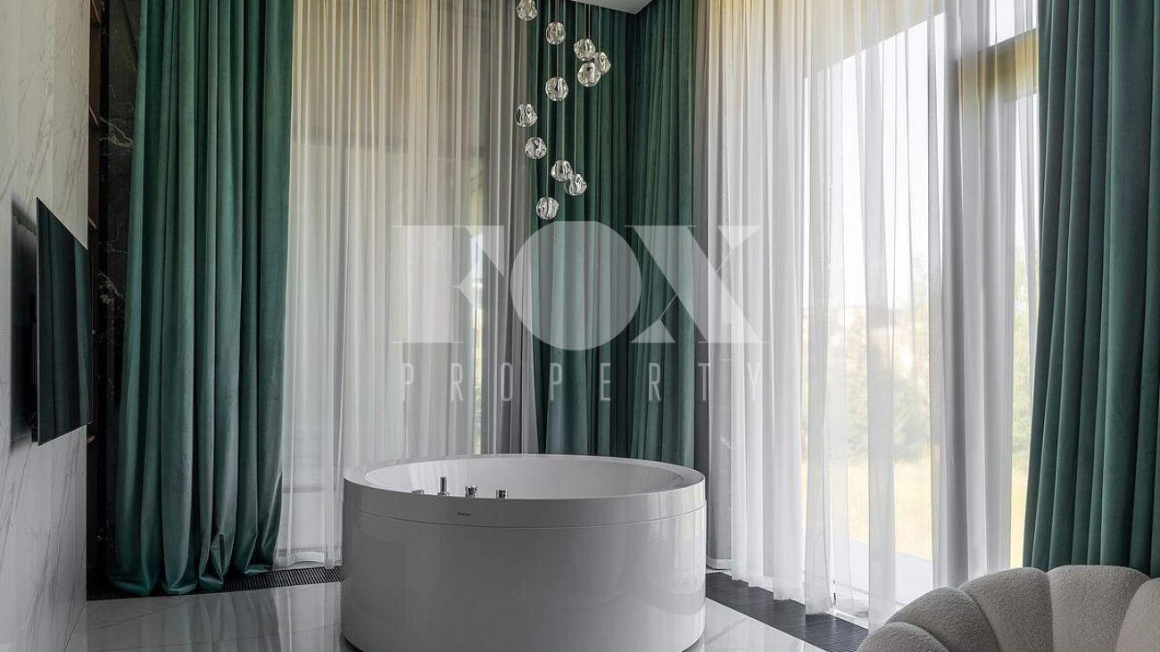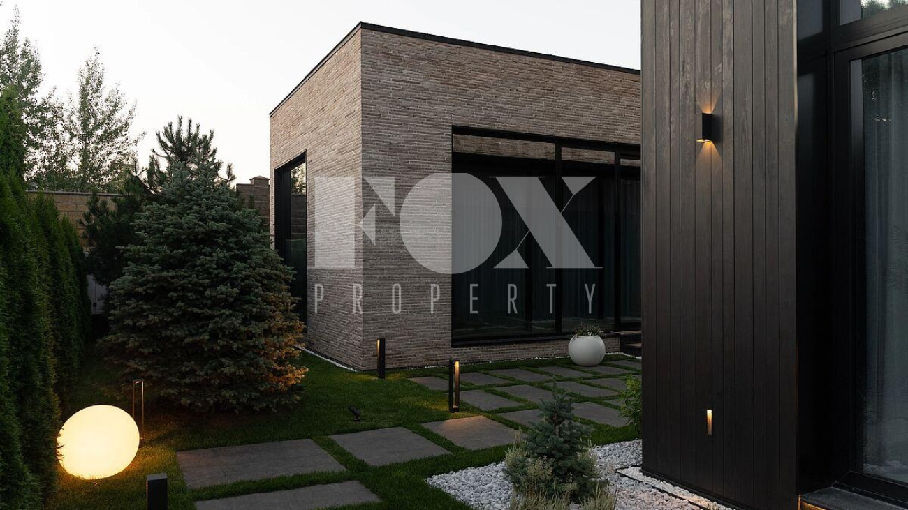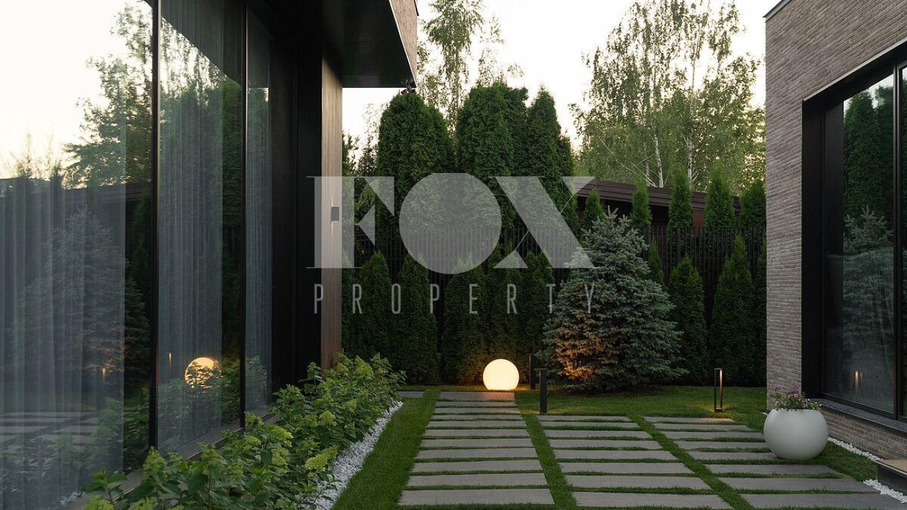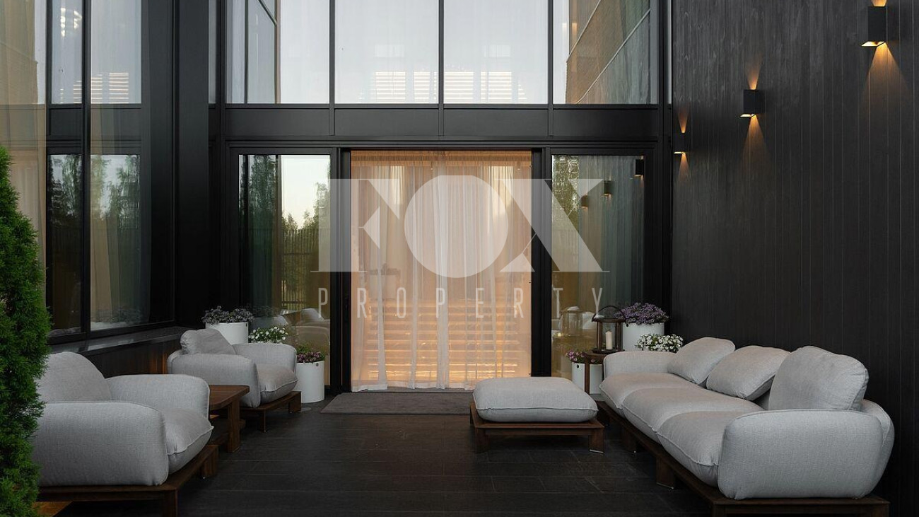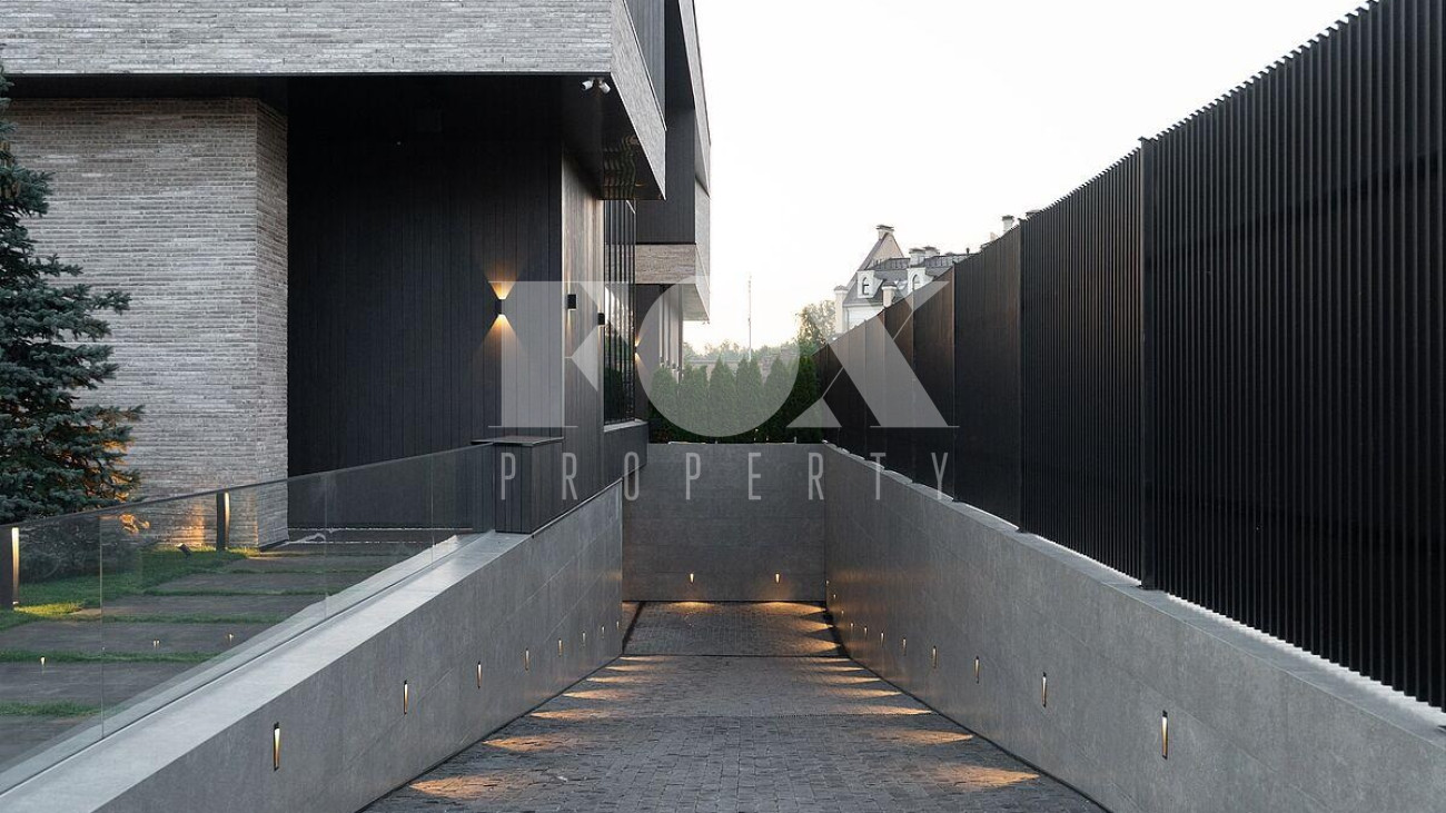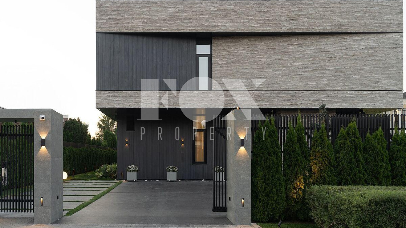 Архитектурный стиль – геометрический хай- тек, отделка фасадов выполнена в бело- коричневых тонах. Главная изюминка дома заключается в оригинальной ориентации боковых стен: у основания они составляют острый угол с отмосткой. В здании 3 этажа, один из них – цокольный. Общая площадь дома составляет 1200 кв. м: идеально подходит для большой семьи ценителей современной архитектуры. Год постройки - 2024. Планировка предусматривает наличие пяти спален; просторной гостиной со вторым светом и камином; бани; крытого бассейна; санузлов, гардеробных; помещения для персонала; просторной кухни-столовой; кабинета и SPA. Дом оборудован лифтом. В цокольном этаже есть спортивный зал с тренажёрами. Панорамное остекление обеспечивает обилие дневного света в помещениях и даёт возможность любоваться живописным ландшафтом элитного посёлка. В тёплое время года для созерцания красоты больше подойдёт просторная терраса. К дому примыкает капитальный гараж. Дом готов к заселению: установлена сантехника, выполнена разводка внутренних инженерных сетей, подключённых к центральным коммуникациям, заведены интернет, телевидение, телефония. Для внутренней отделки использовались материалы класса Deluxe. Интерьер выдержан в лучших традициях хай-тек: минимум декора, максимум функциональности. Главным его украшением служит дорогая добротная мебель от известных зарубежных производителей. Дом построен на участке площадью 16,67 соток с продуманным ландшафтным дизайном, в тихом месте коттеджного посёлка «Гринфилд»