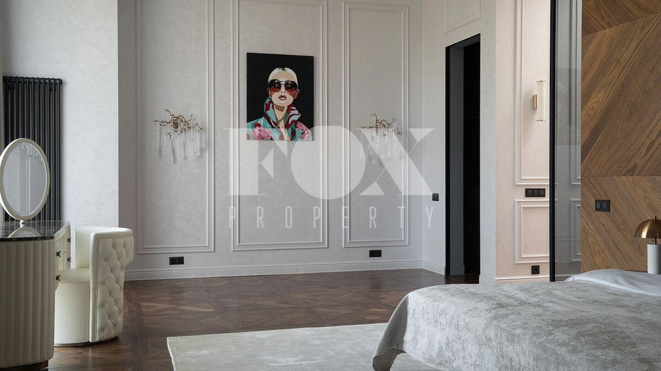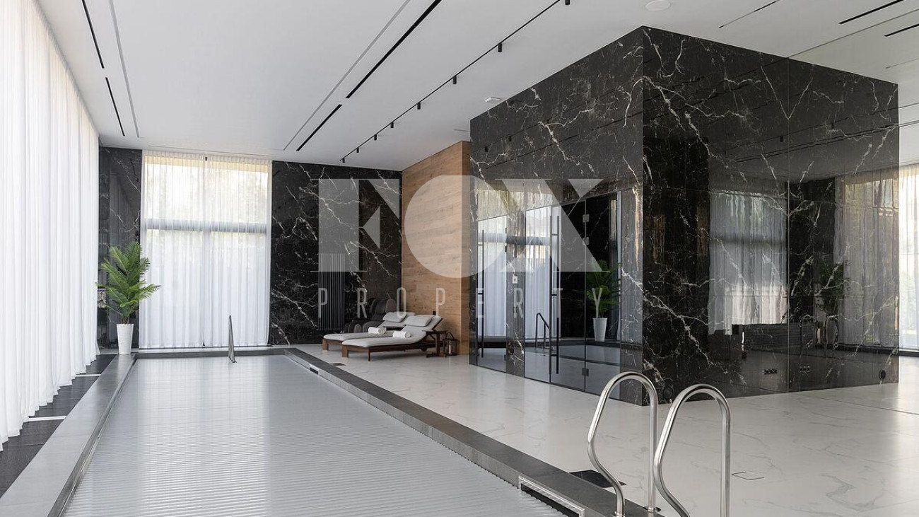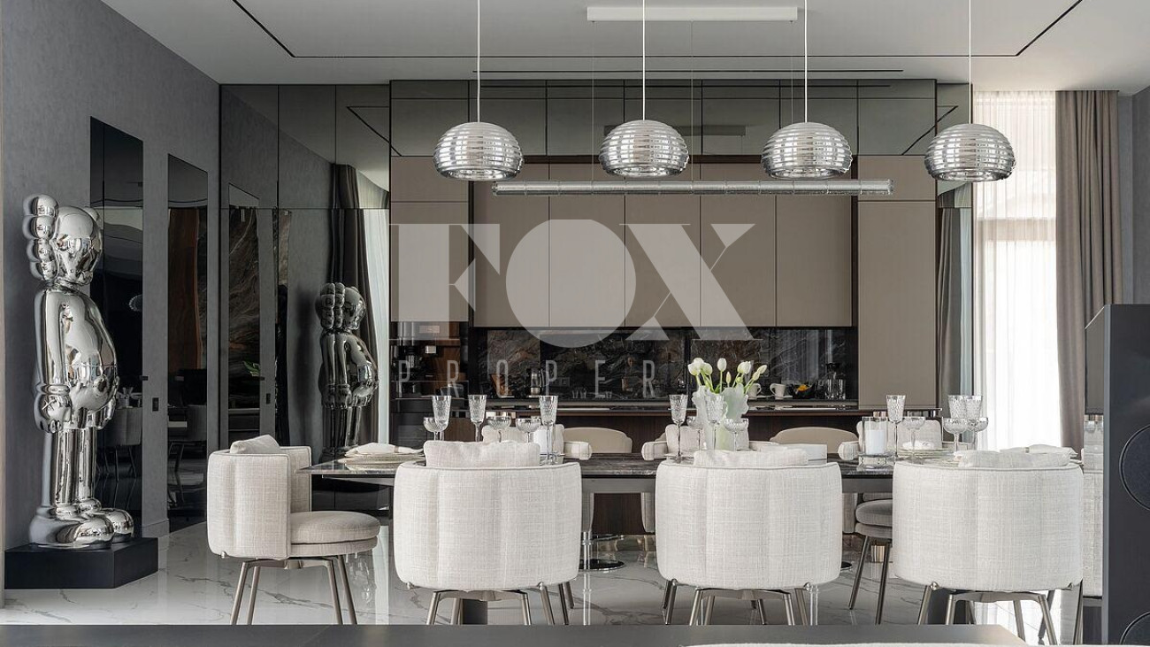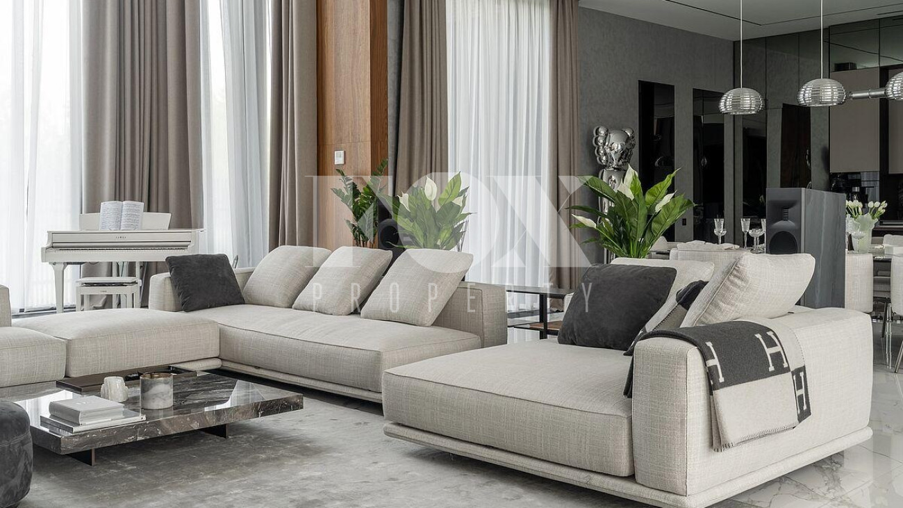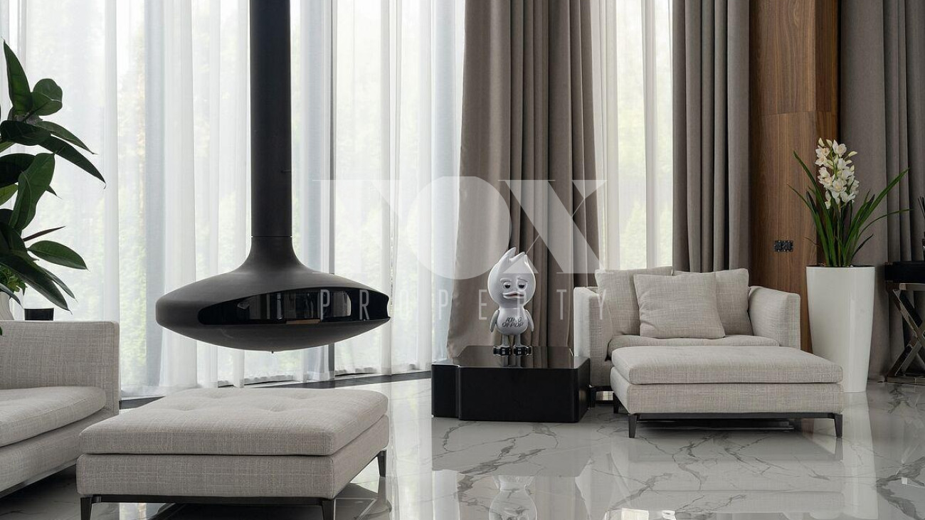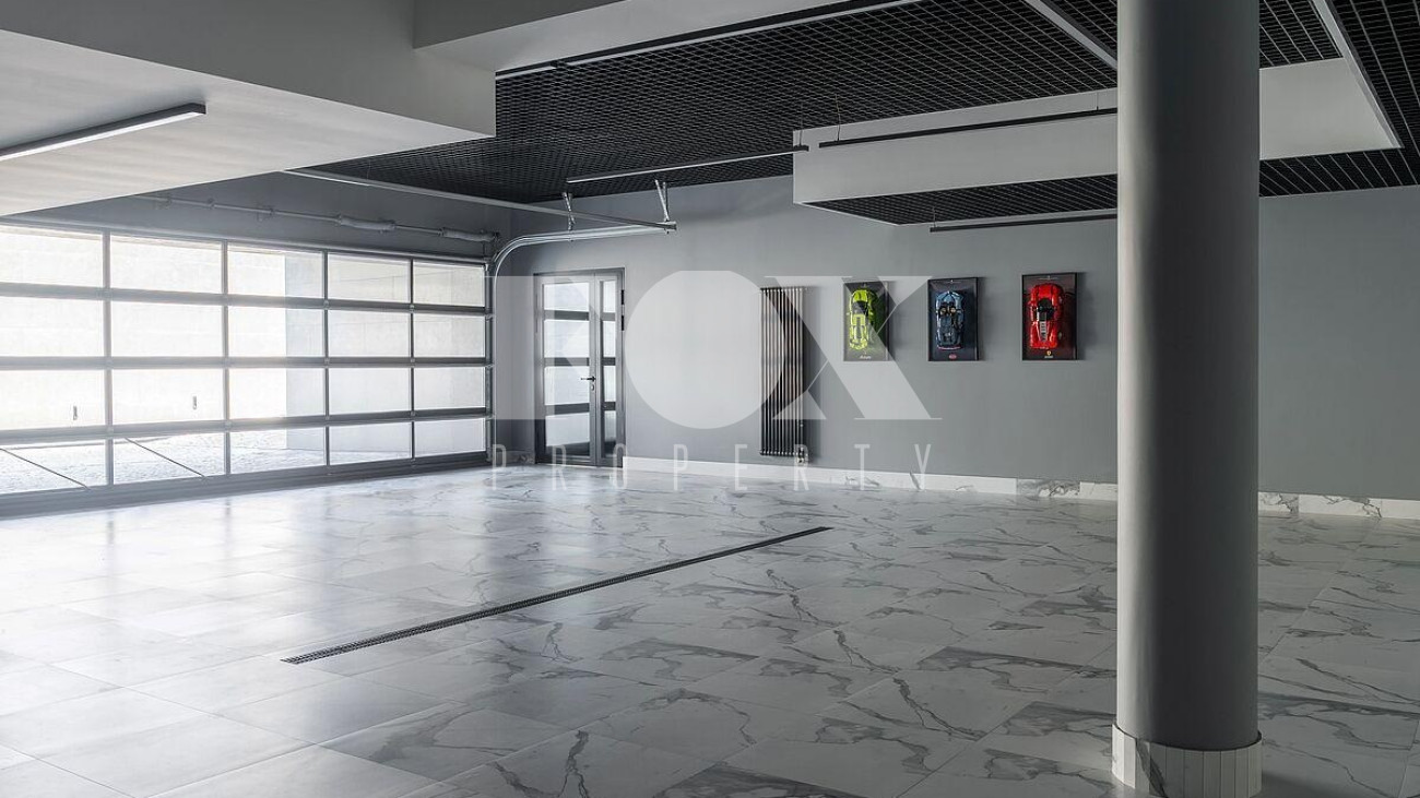 Архитектурный стиль – геометрический хай- тек, отделка фасадов выполнена в бело- коричневых тонах. Главная изюминка дома заключается в оригинальной ориентации боковых стен: у основания они составляют острый угол с отмосткой. В здании 3 этажа, один из них – цокольный. Общая площадь дома составляет 1200 кв. м: идеально подходит для большой семьи ценителей современной архитектуры. Год постройки - 2024. Планировка предусматривает наличие пяти спален; просторной гостиной со вторым светом и камином; бани; крытого бассейна; санузлов, гардеробных; помещения для персонала; просторной кухни-столовой; кабинета и SPA. Дом оборудован лифтом. В цокольном этаже есть спортивный зал с тренажёрами. Панорамное остекление обеспечивает обилие дневного света в помещениях и даёт возможность любоваться живописным ландшафтом элитного посёлка. В тёплое время года для созерцания красоты больше подойдёт просторная терраса. К дому примыкает капитальный гараж. Дом готов к заселению: установлена сантехника, выполнена разводка внутренних инженерных сетей, подключённых к центральным коммуникациям, заведены интернет, телевидение, телефония. Для внутренней отделки использовались материалы класса Deluxe. Интерьер выдержан в лучших традициях хай-тек: минимум декора, максимум функциональности. Главным его украшением служит дорогая добротная мебель от известных зарубежных производителей. Дом построен на участке площадью 16,67 соток с продуманным ландшафтным дизайном, в тихом месте коттеджного посёлка «Гринфилд»