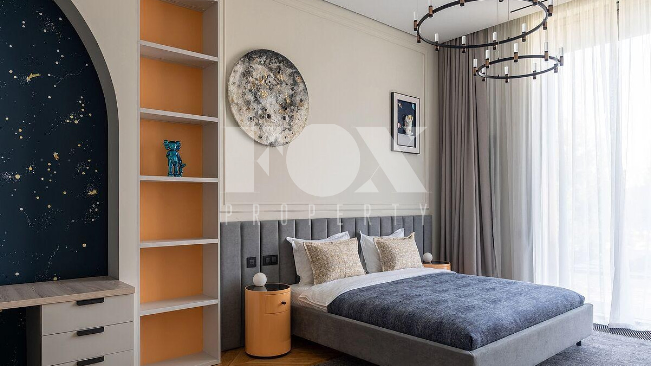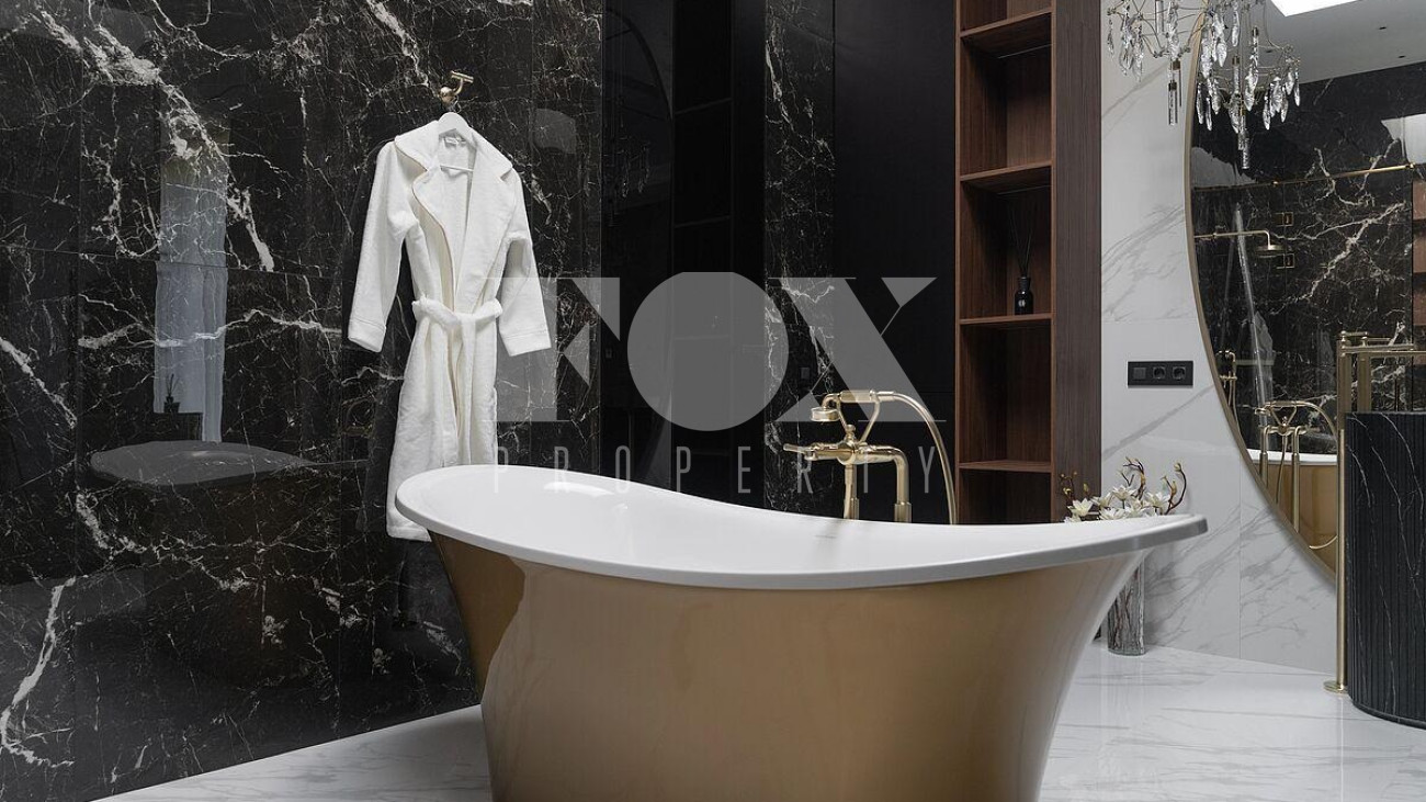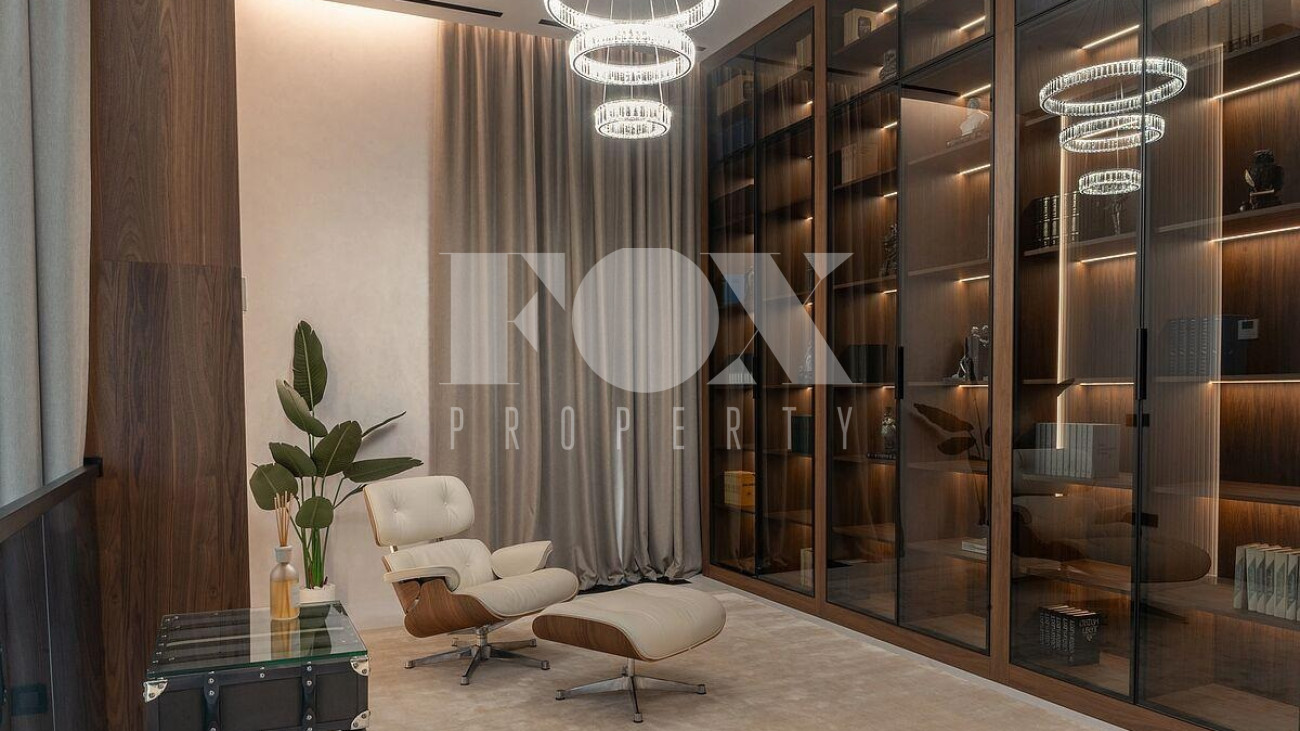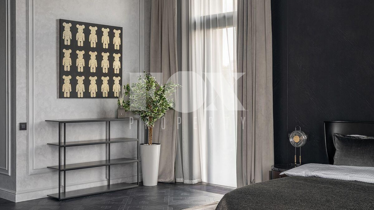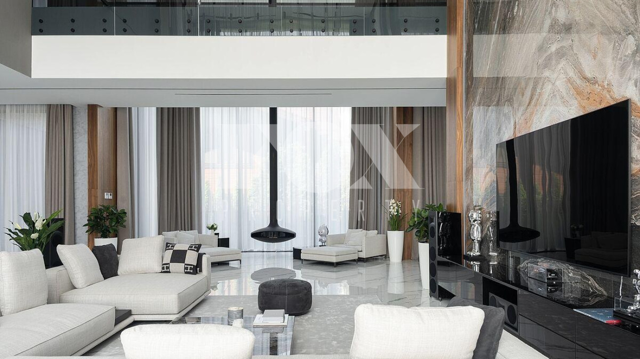 Архитектурный стиль – геометрический хай- тек, отделка фасадов выполнена в бело- коричневых тонах. Главная изюминка дома заключается в оригинальной ориентации боковых стен: у основания они составляют острый угол с отмосткой. В здании 3 этажа, один из них – цокольный. Общая площадь дома составляет 1200 кв. м: идеально подходит для большой семьи ценителей современной архитектуры. Год постройки - 2024. Планировка предусматривает наличие пяти спален; просторной гостиной со вторым светом и камином; бани; крытого бассейна; санузлов, гардеробных; помещения для персонала; просторной кухни-столовой; кабинета и SPA. Дом оборудован лифтом. В цокольном этаже есть спортивный зал с тренажёрами. Панорамное остекление обеспечивает обилие дневного света в помещениях и даёт возможность любоваться живописным ландшафтом элитного посёлка. В тёплое время года для созерцания красоты больше подойдёт просторная терраса. К дому примыкает капитальный гараж. Дом готов к заселению: установлена сантехника, выполнена разводка внутренних инженерных сетей, подключённых к центральным коммуникациям, заведены интернет, телевидение, телефония. Для внутренней отделки использовались материалы класса Deluxe. Интерьер выдержан в лучших традициях хай-тек: минимум декора, максимум функциональности. Главным его украшением служит дорогая добротная мебель от известных зарубежных производителей. Дом построен на участке площадью 16,67 соток с продуманным ландшафтным дизайном, в тихом месте коттеджного посёлка «Гринфилд»