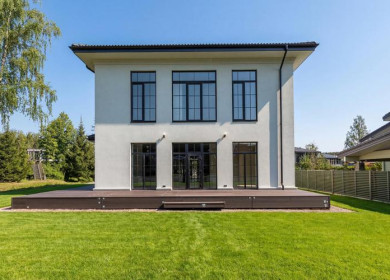 Это просторный дом площадью 429,9 кв. м идеально подойдет для проживания большой семьи. На первом этаже помимо вестибюльной группы с тамбуром и холлом, расположены кабинет, гостиная и столовая, плавно перетекающая в каминную залу. Из неё можно попасть на застеклённую террасу, с которой открывается живописный вид на участок площадью 25 соток. Кроме того, на первом этаже находятся гараж на две машины, гостевая спальня и топочная. На втором этаже расположены три спальни с двумя гардеробными, детская и игровая комнаты, большой холл.