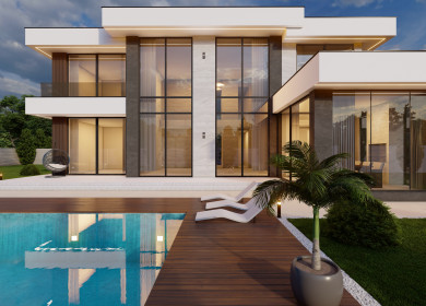 На участке расположена спа зона с бассейном, зона барбекю и отдельностоящий гараж на 2 м.м. с помещением для персонала.
