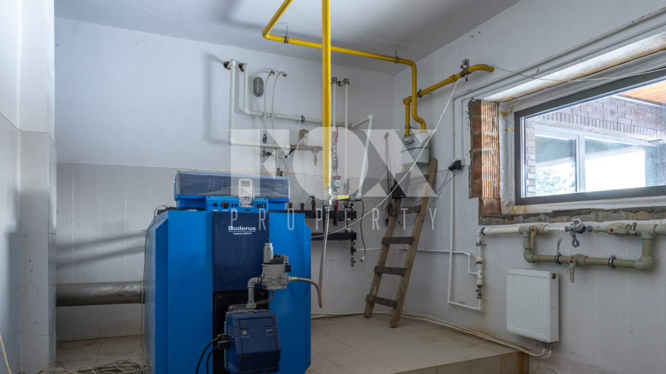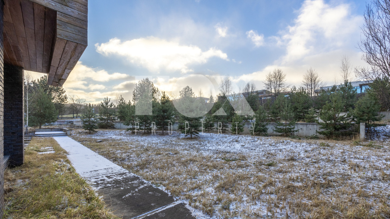 На благоустроенном участке выполнен ландшафтный дизайн с террасированием и подпорными стенами, где гармонично интегрированы большие камни, разбит парк из более чем двадцати крупных деревьев, проложено множество прогулочных дорожек и подготовлен фундамент под летнюю веранду или беседку, оборудован гараж на 4 автомобиля.