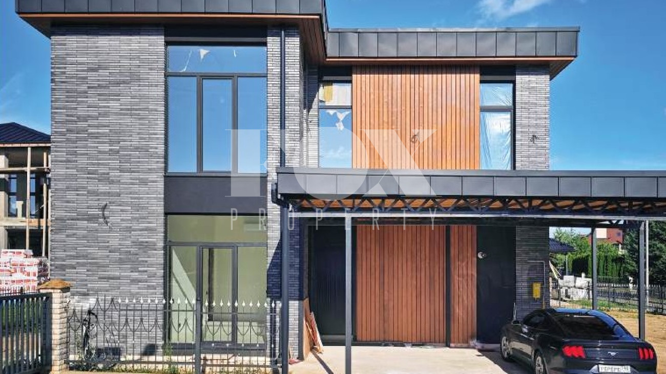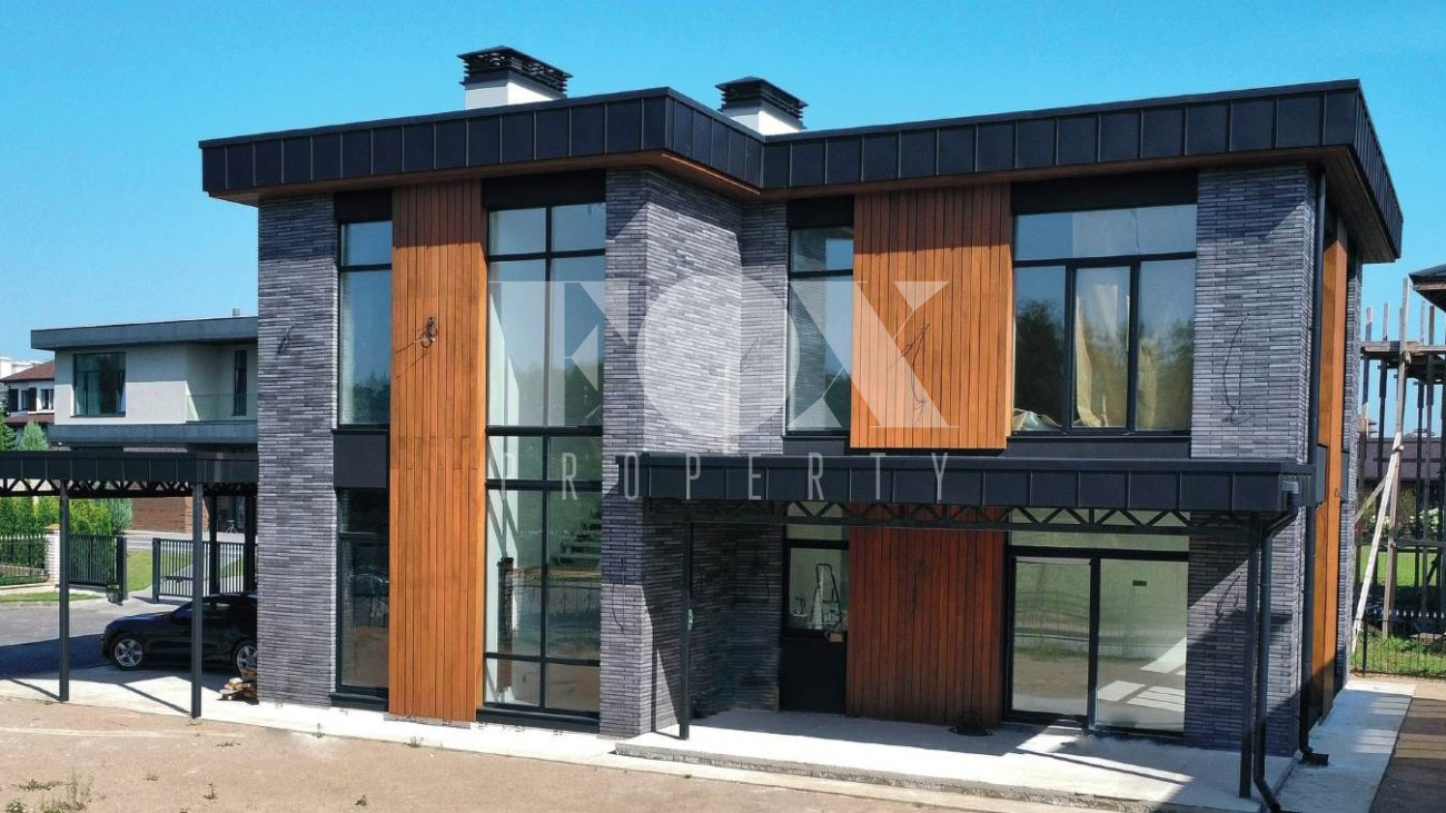 Новый современный дом под ключ в поселке бизнес класса. В отделке использованы только качественные и дорогие материалы. В доме высокие потолки 3,4 метра и масштабное панорамное остекление. Интерьер выполнен в светлых тонах и оформлен дизайнерским освещением. Просторная кухня - гостиная с выходом на крытую террасу площадью 26 кв.м. Кухня оснащена бытовой техникой. Рядом с кухней предусмотрено помещение для хранения и установки дополнительного оборудования. На первом этаже есть большая спальня со свой гардеробной и ванной комнатой. Все спальни второго этажа также со своими гардеробными и ванными комнатами. Установлена приточно - вытяжная система вентиляции и теплые полы. Фасад отделан натуральным деревом лиственницы и декоративным камнем. В доме ведутся окончательные отделочные работы под ключ.