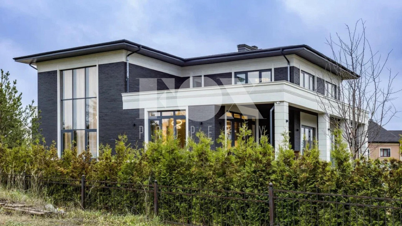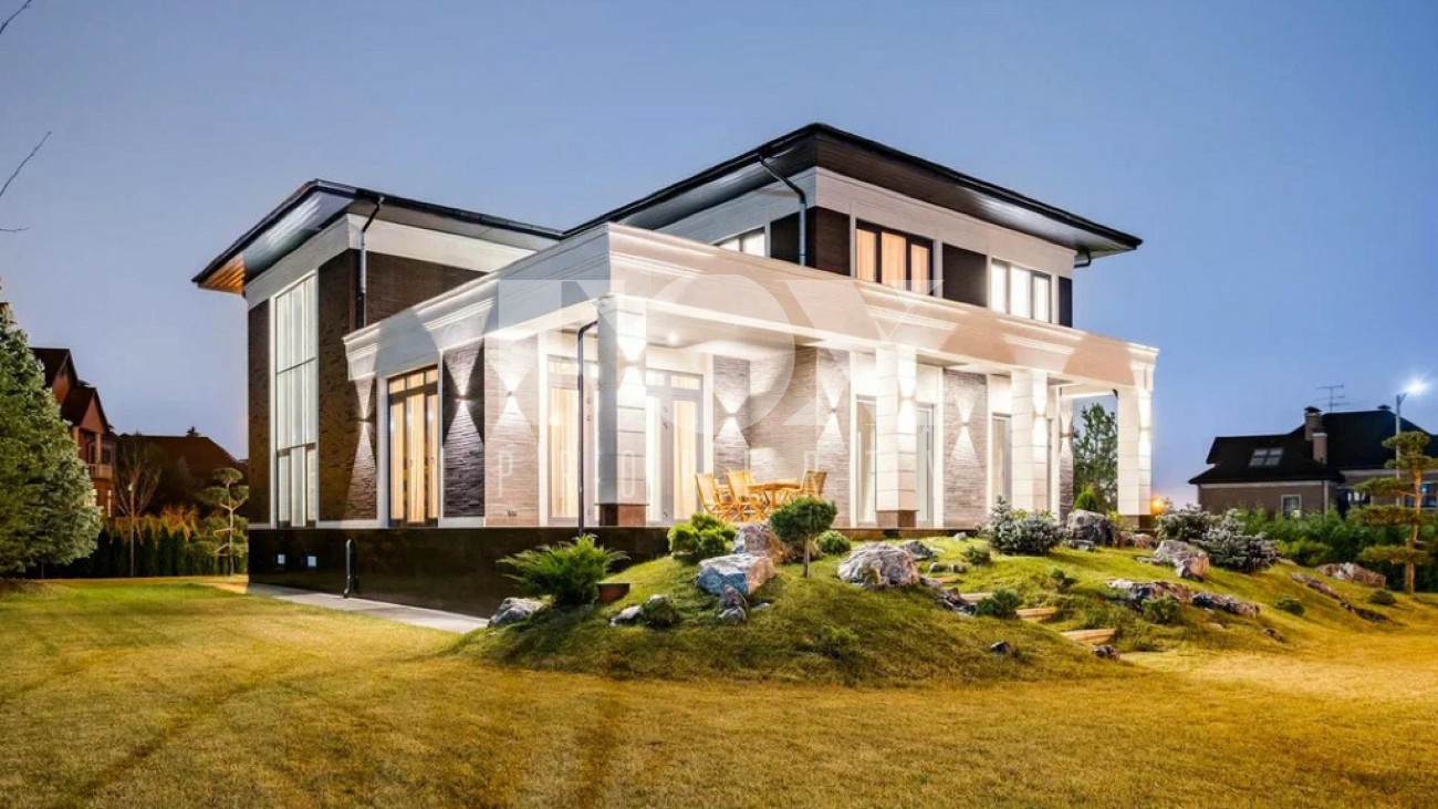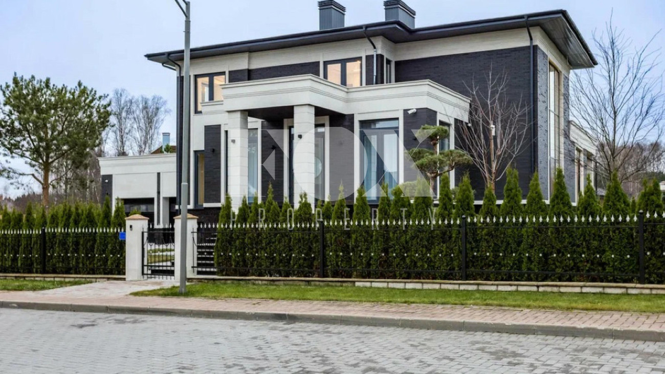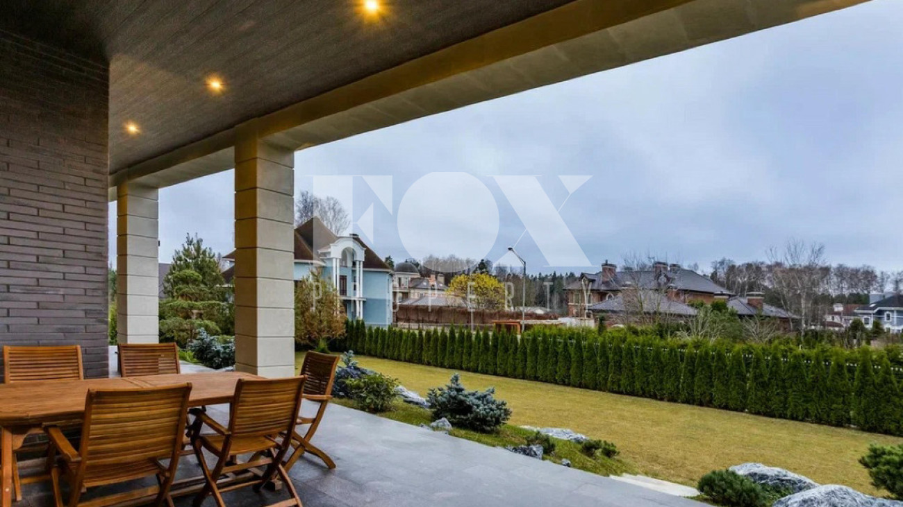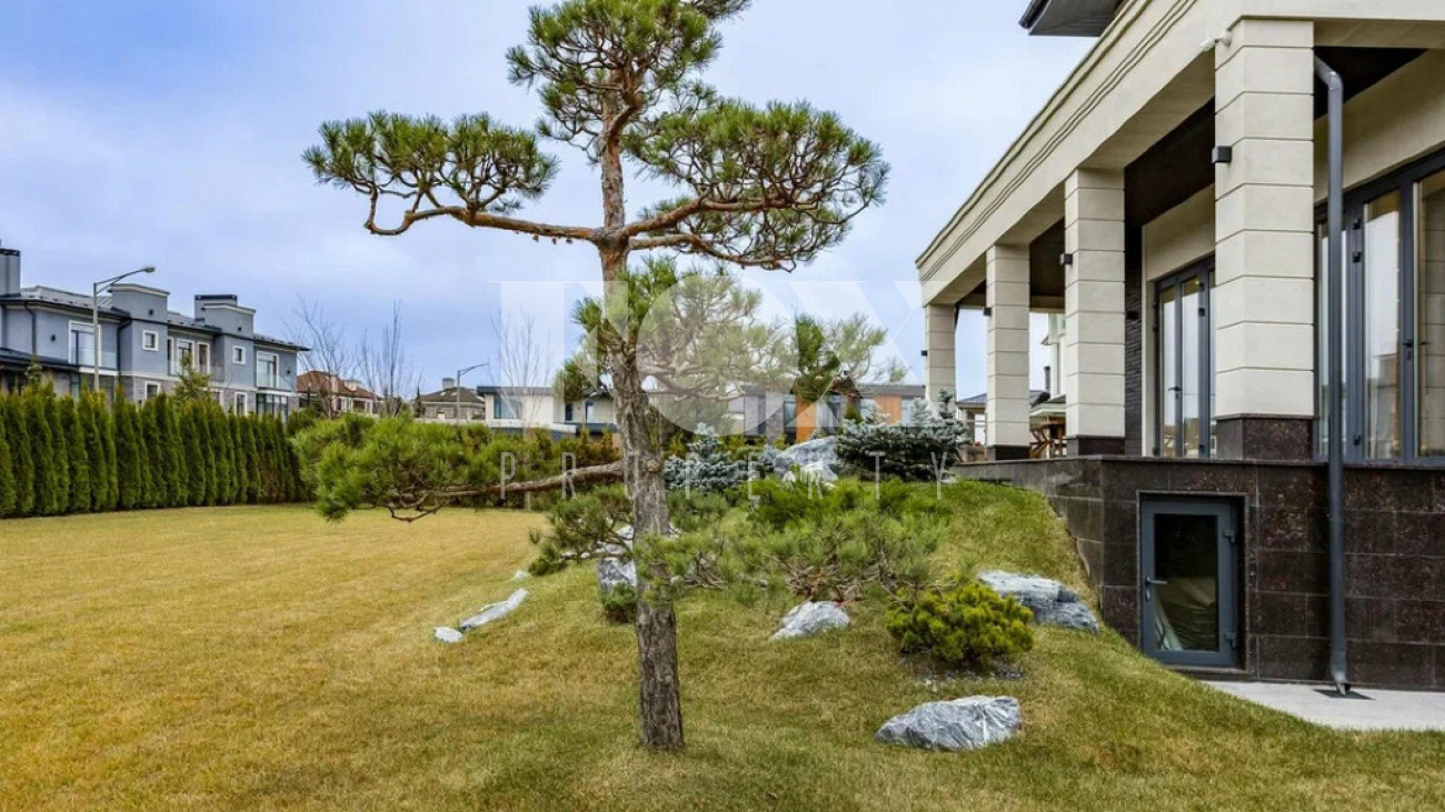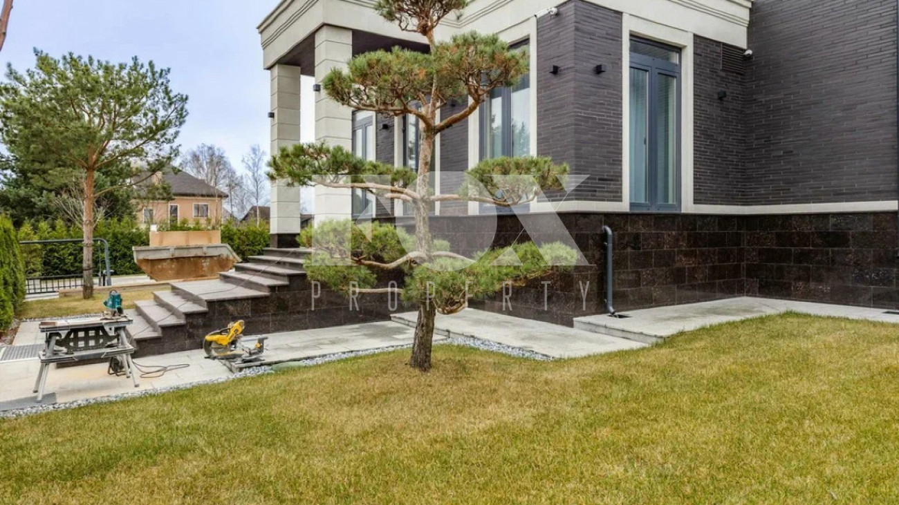 На участке газон, бонсай, туи, деревья, голубые ели, можжевельник. Установлен автоматический полив. Забор по периметру участка. Ворота с электроприводом, откатные.