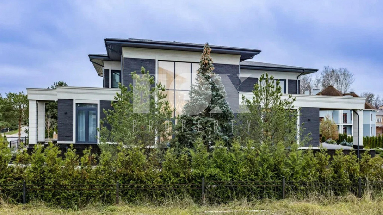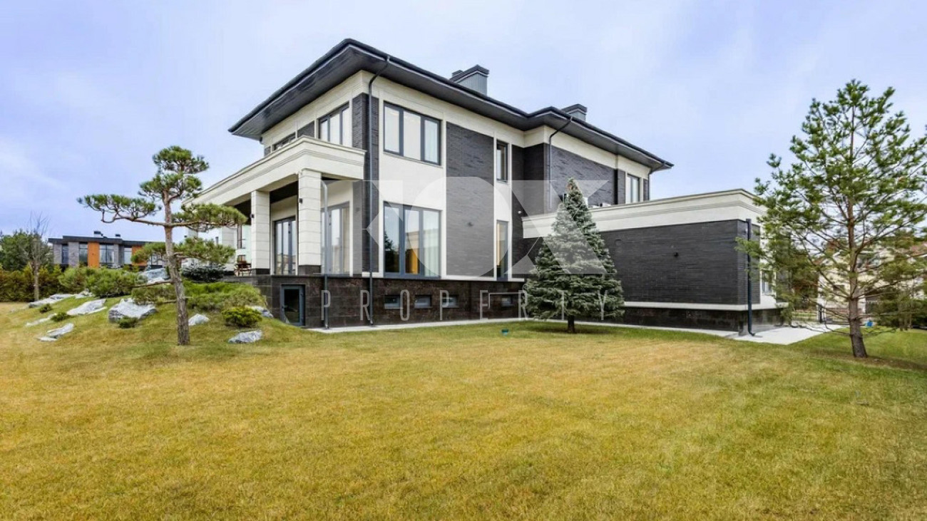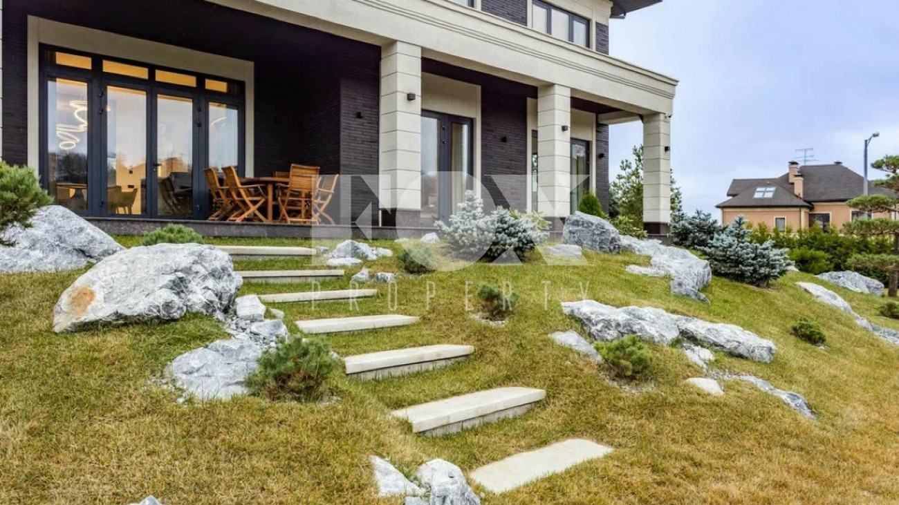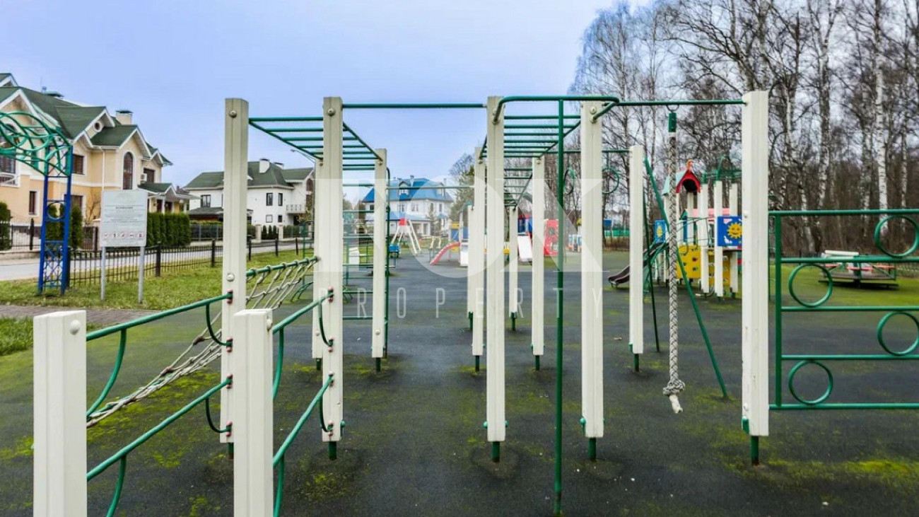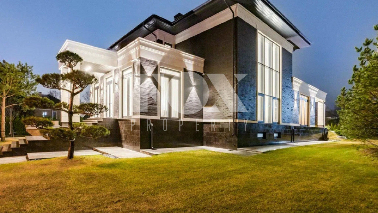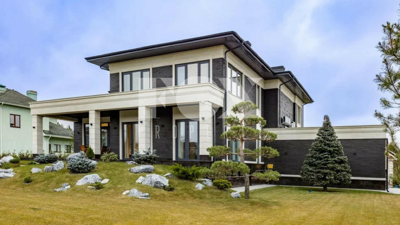 На участке газон, бонсай, туи, деревья, голубые ели, можжевельник. Установлен автоматический полив. Забор по периметру участка. Ворота с электроприводом, откатные.