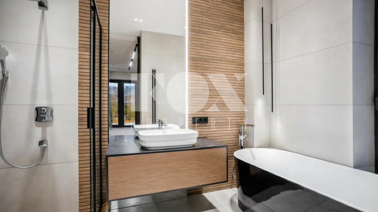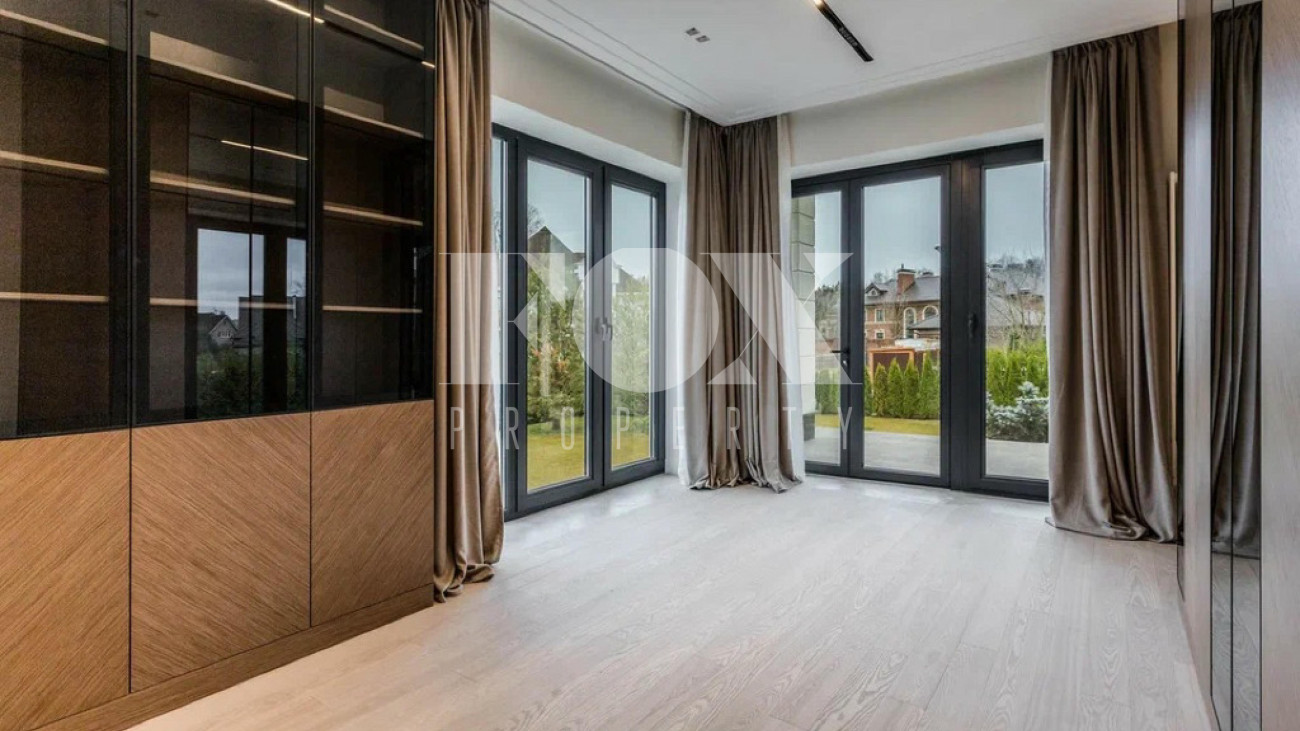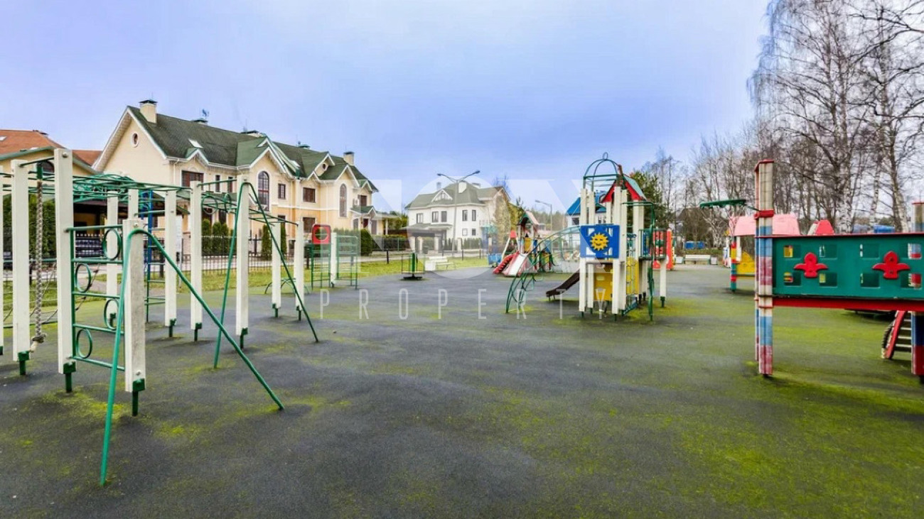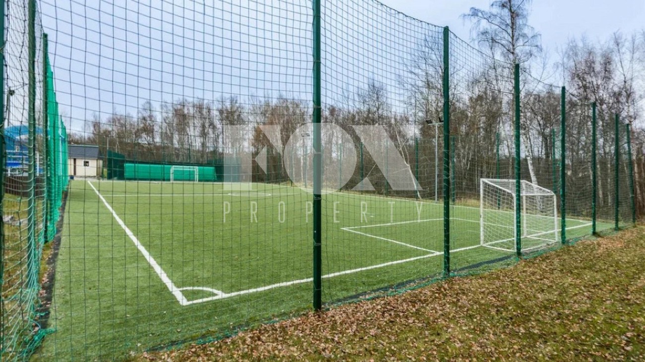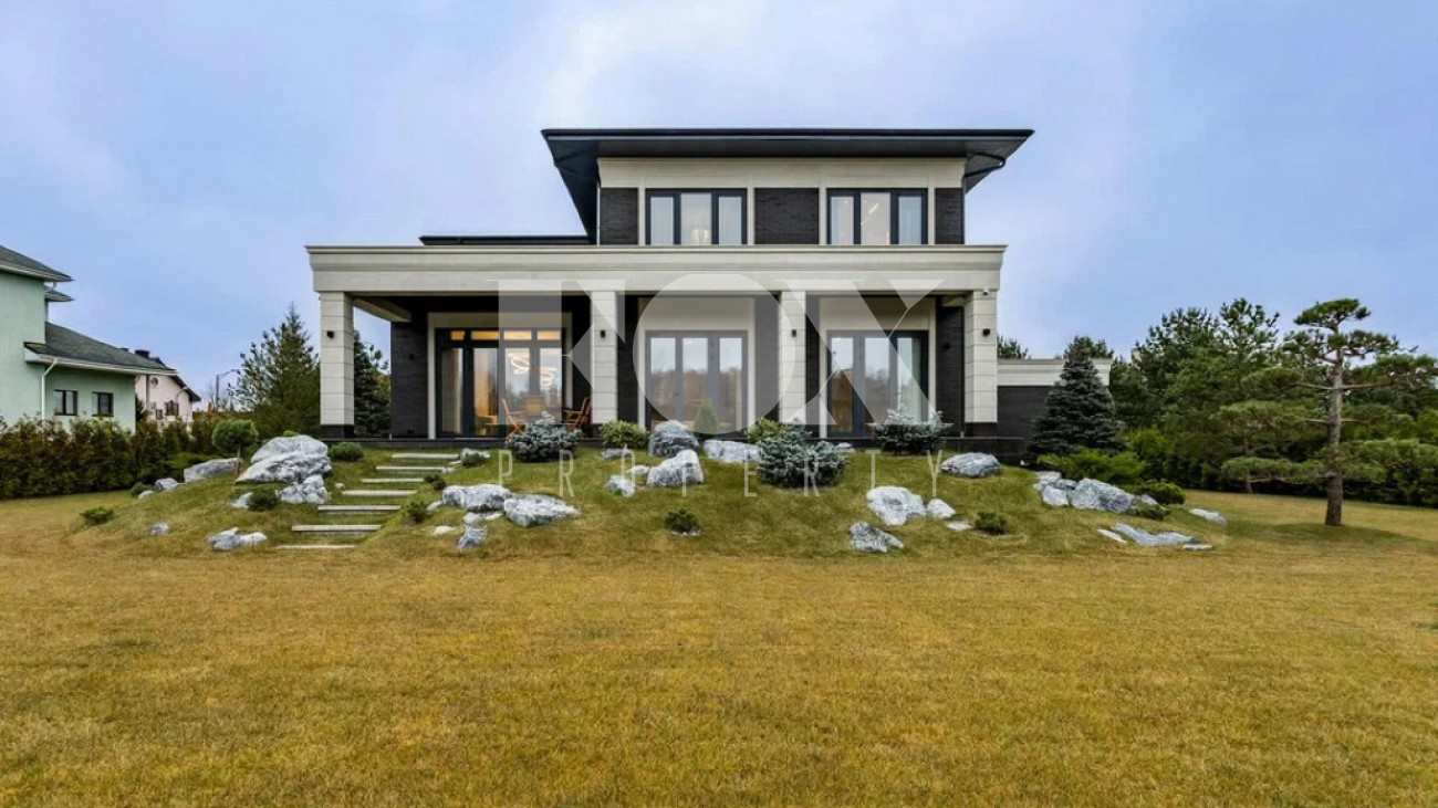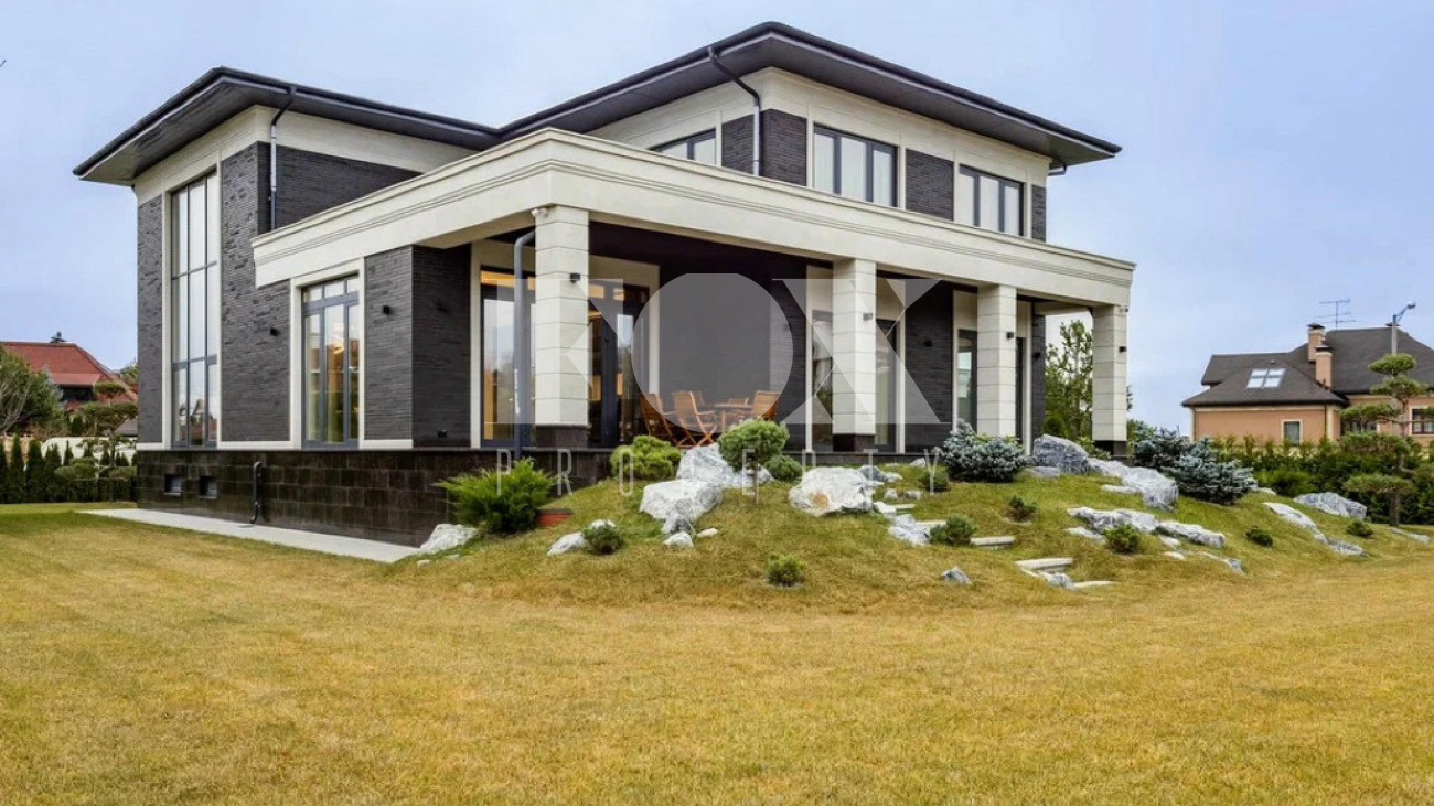 На участке газон, бонсай, туи, деревья, голубые ели, можжевельник. Установлен автоматический полив. Забор по периметру участка. Ворота с электроприводом, откатные.