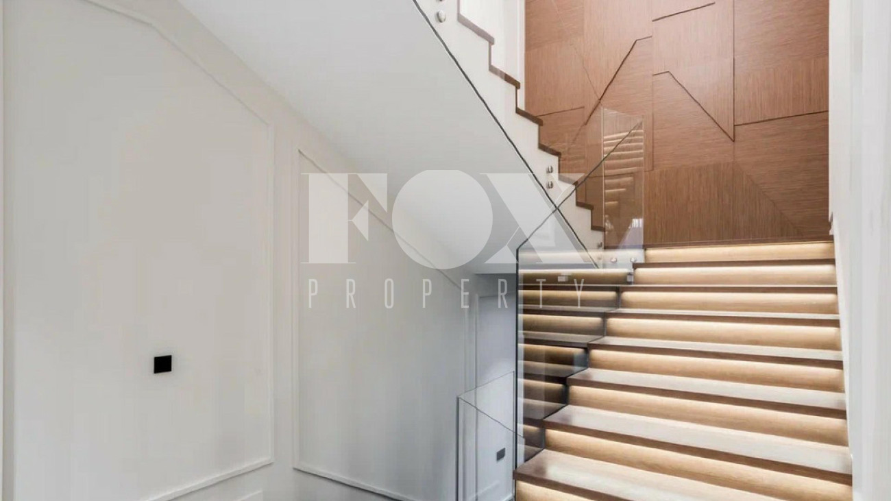 Керамогранит крупного формата Italon Metropolis и инженерная доска Coswick Lab Arte. Лестница отделана натуральным дубом. На стенах декоративные шпонированные панели.