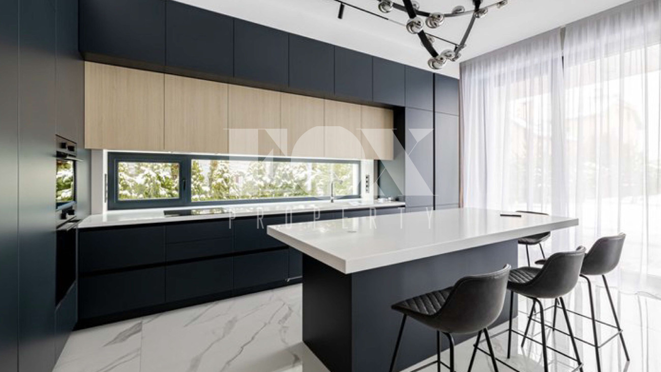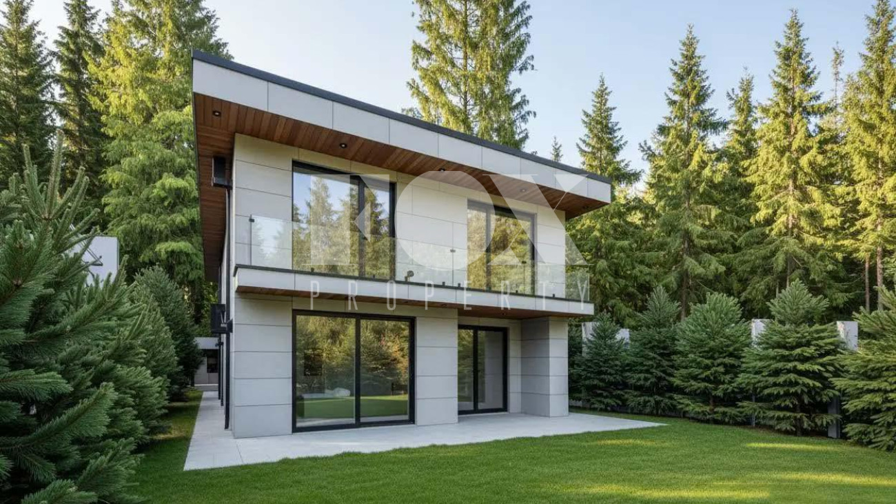 Строящийся дом в коттеджном поселке Лесные Зори. Современная архитектура, большая площадь остекления. Готовность - июнь 2026 г.