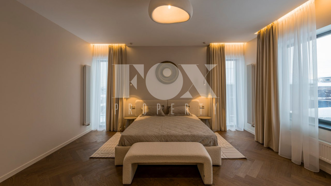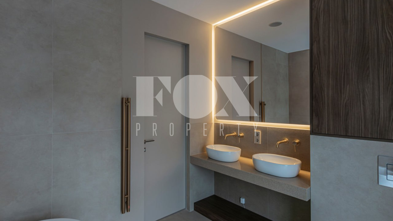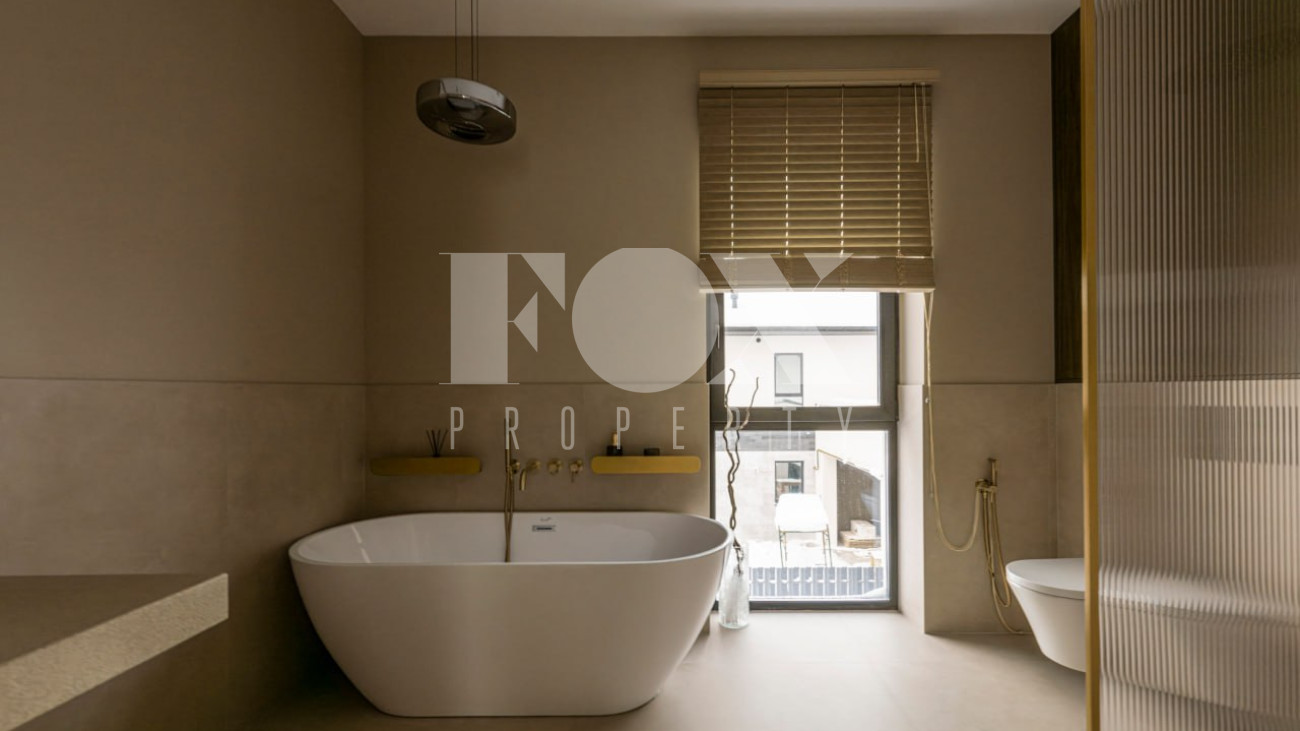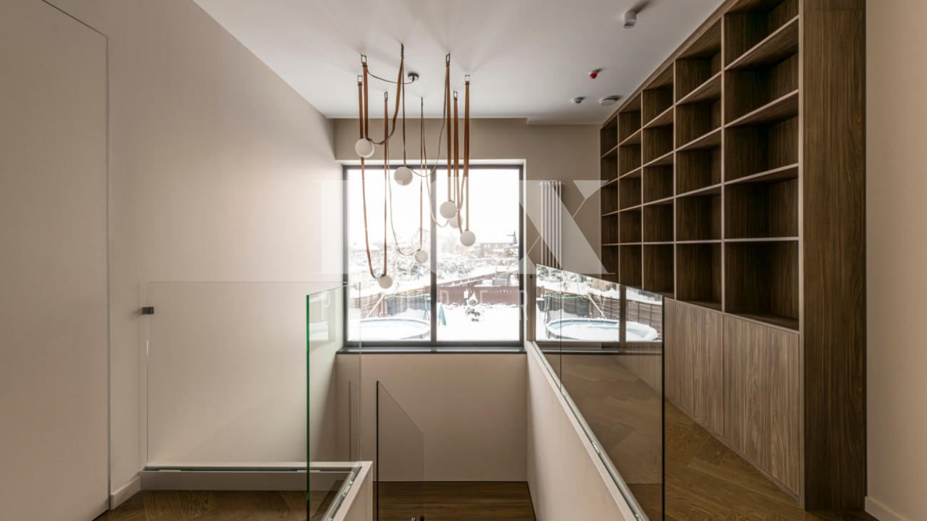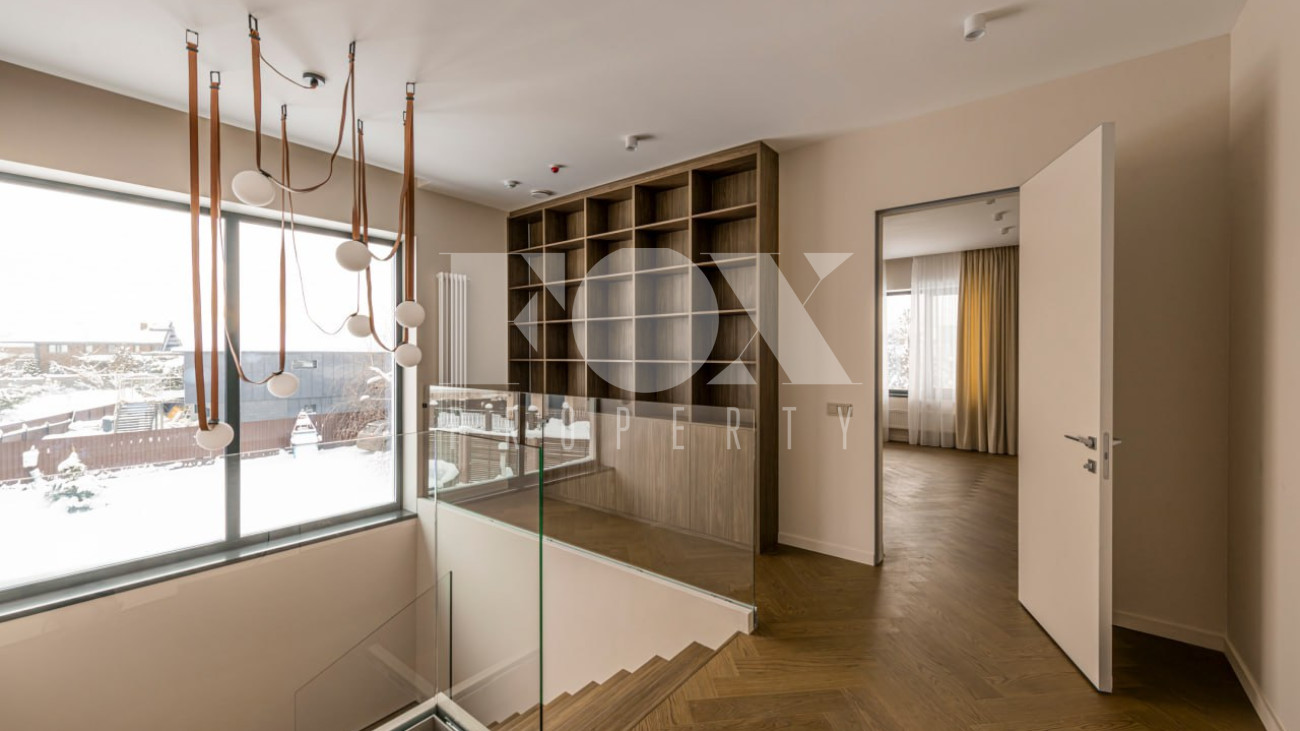 Большие панорамные окна обеспечивают хорошее естественное освещение, из гостиной есть выход на террасу и участок. В доме тёплые водяные полы, большие спальни и гардеробные, современные системы инсталляции в санузлах и мебель и освещение хорошего качества.