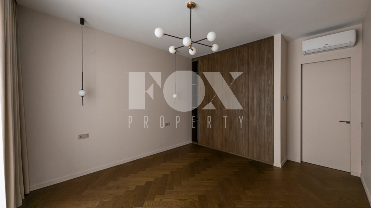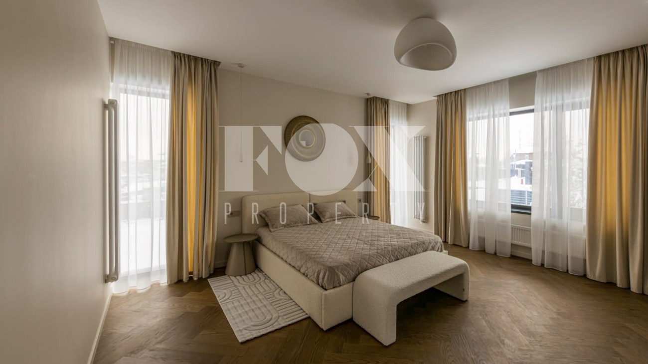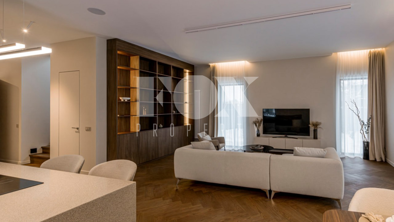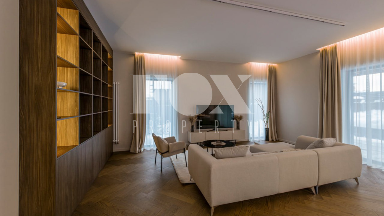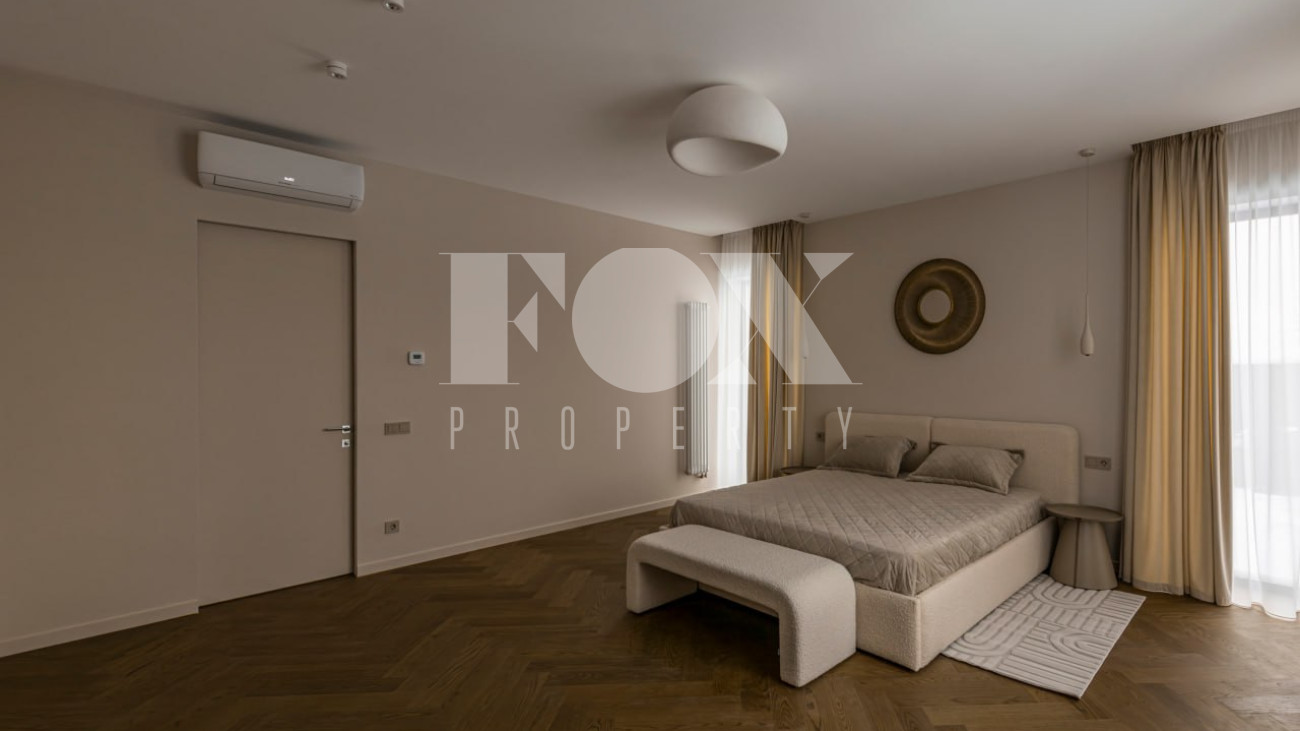 Большие панорамные окна обеспечивают хорошее естественное освещение, из гостиной есть выход на террасу и участок. В доме тёплые водяные полы, большие спальни и гардеробные, современные системы инсталляции в санузлах и мебель и освещение хорошего качества.