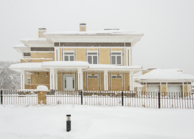 гардеробными. Мастер-спальня в полукруглой комнате с выходом на террасу. Гараж на два авто вынесен в отдельное крыло дома. Благодаря премиальному качеству строительства, в особняке всегда комфортно и безопасно. Даже в самые холодные и дождливые дни! Стены из натурального кирпича, монолитные перекрытия и фасады из травертина берегут уют и тепло в доме от шума, холода и капризов природы. Все коммуникации заведены в дом. Полностью готовы встроенные мансардные окна. Заезд к дому выполнен из брусчатки. Вокруг особняка много уединённого и приватного личного пространства, так как он возведён на просторном участке площадью 25,07 сотки. А соседи окружают дом только с двух сторон.