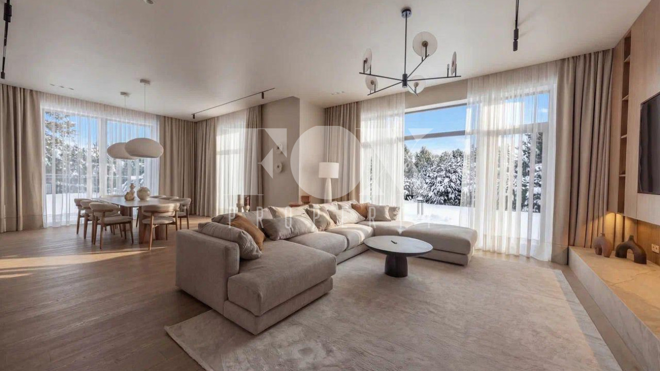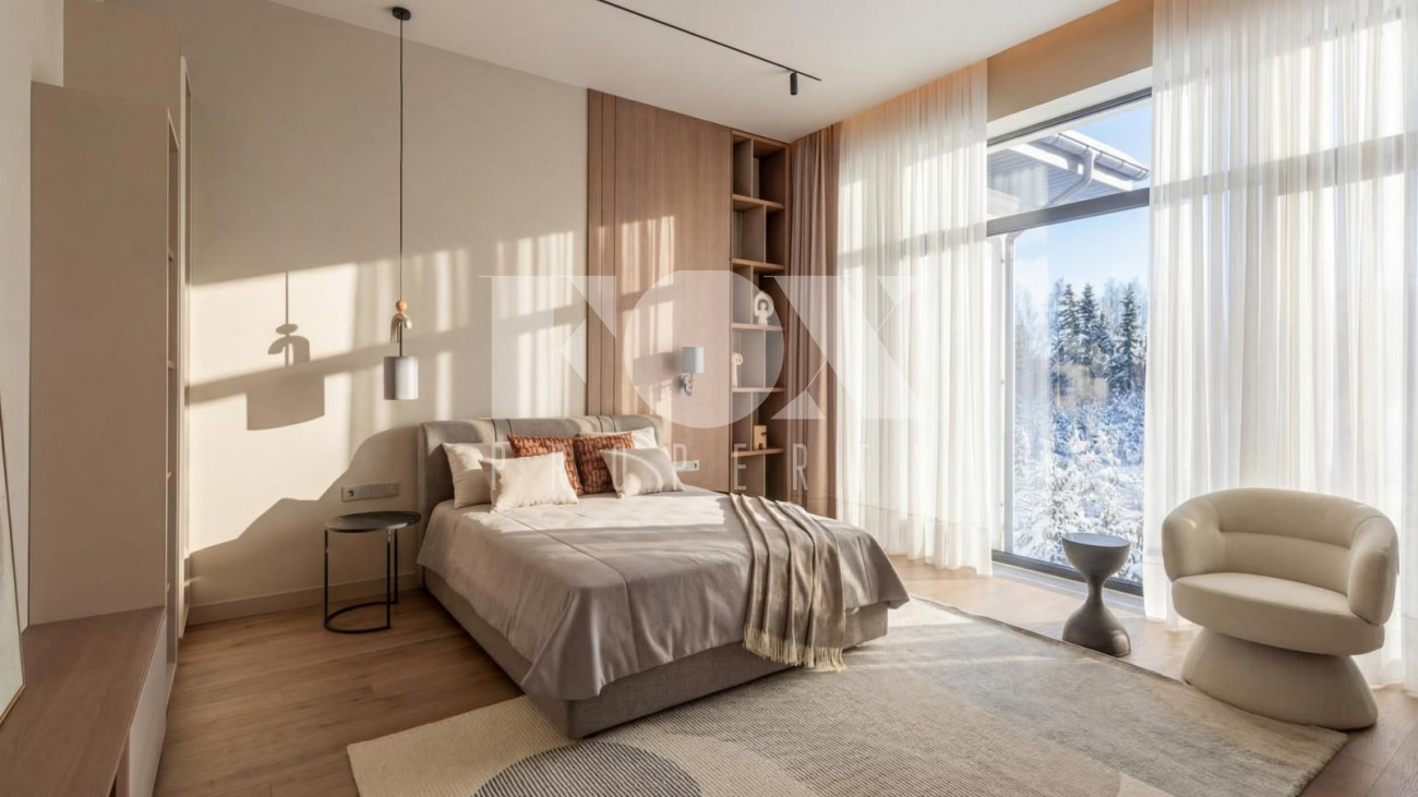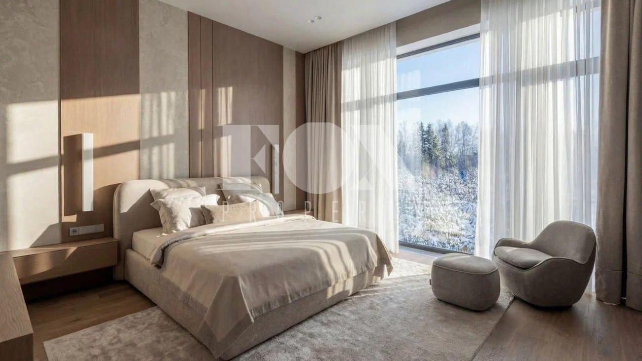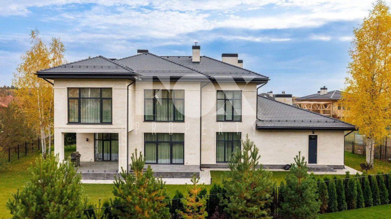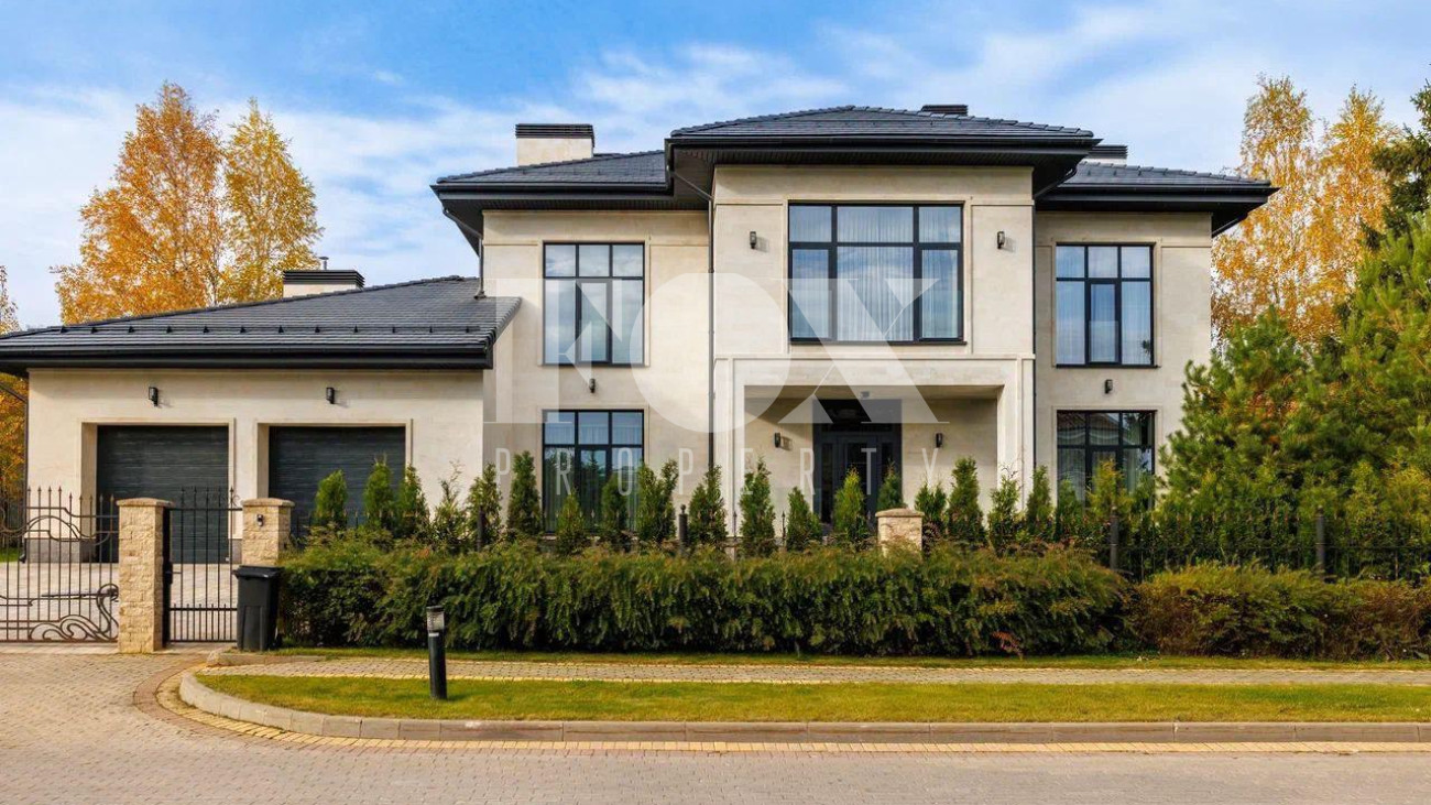 Новый дом в стиле современной классики в коттеджном поселке Мэдисон Парк. Продуманная планировка, качественные отделочные материалы и предметы интерьера. На участке выполнен ландшафтный дизайн, высажены туи, сосны, установлен автополив.