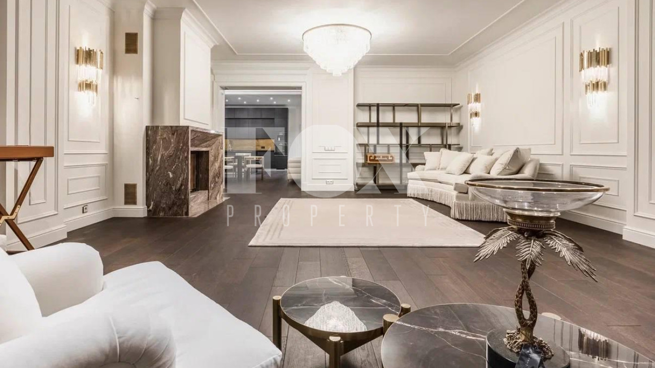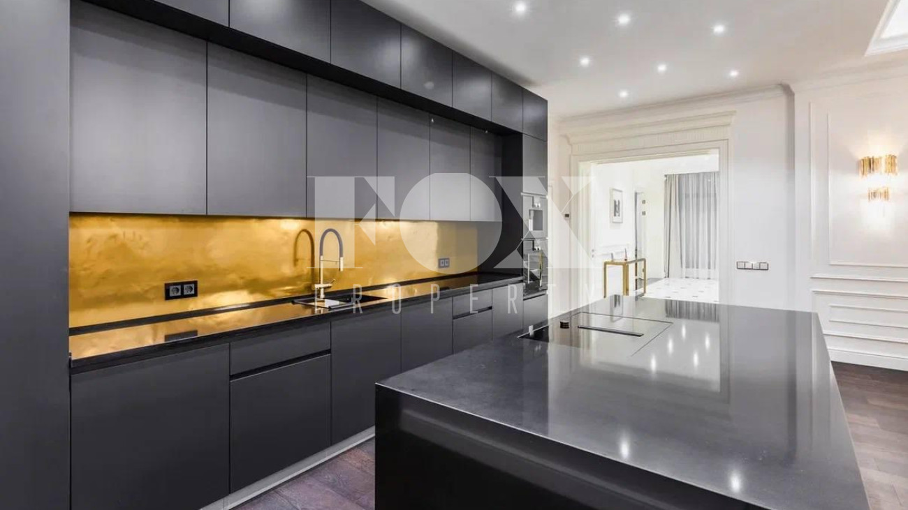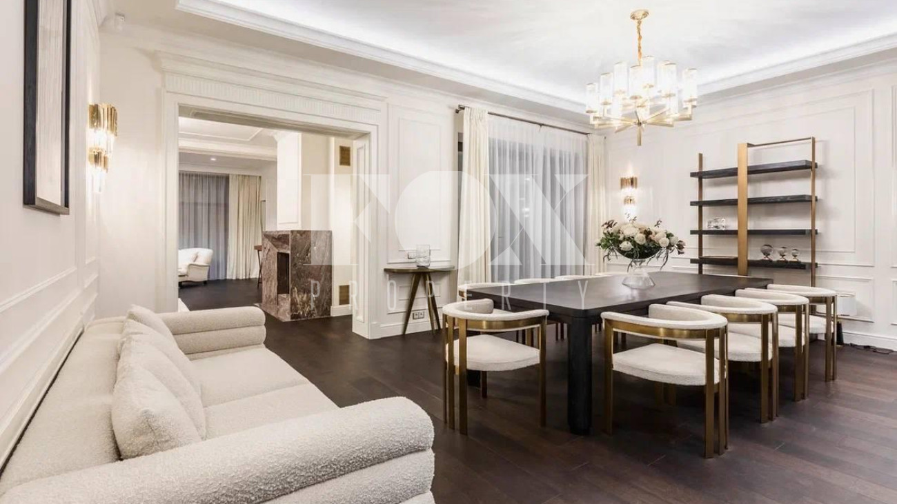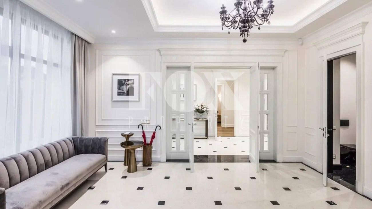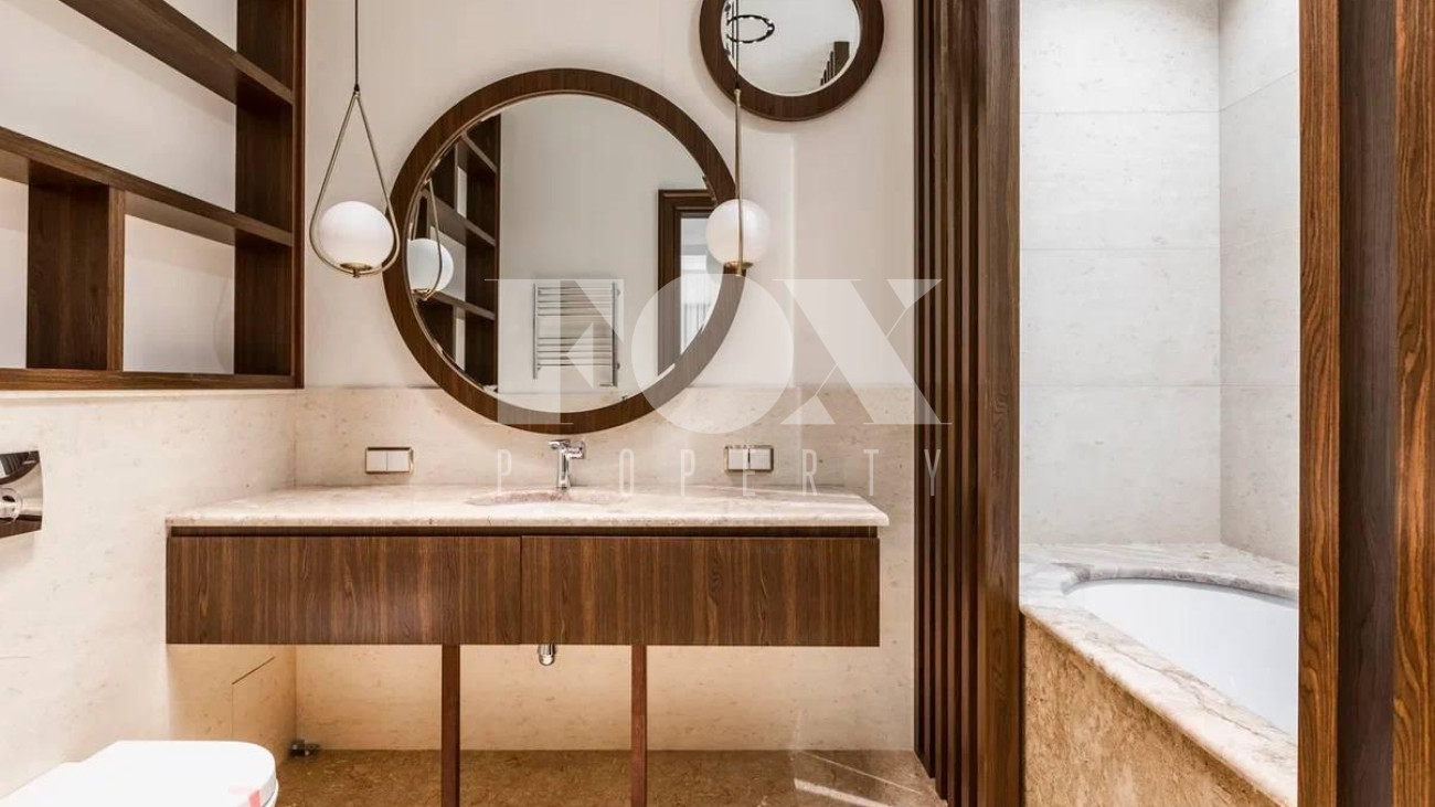 Безупречный стиль резиденции отражается во всем, начиная с пространства холла с большим окном, выполненного в светлых тонах, продуманного до мелочей и украшенного мрамором со спокойным рисунком.