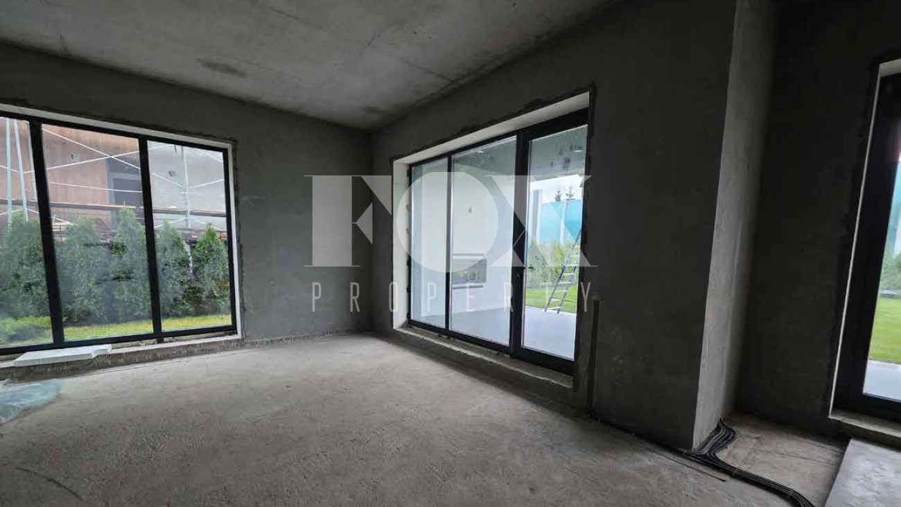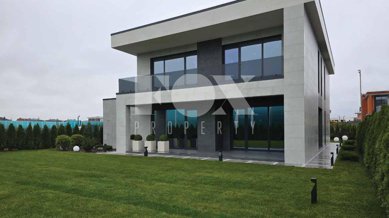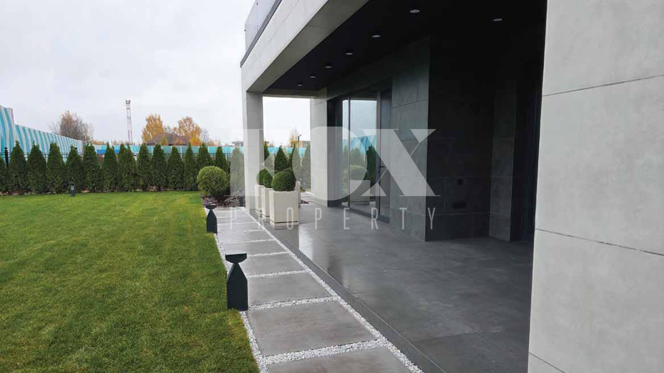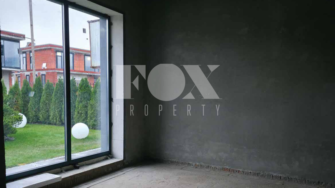 Дом продаётся готовым под чистовую отделку, выложены перегородки, оштукатурины стены и откосы, залита монолитная парящая лестница, сделана частично электрика к существующим электроприборам, в котельной выложен керамогранит. Высота потолков 1 и 2 этажа 3.65 м.,  дверные проемы высотой 2.8 м., панорамное остекление.