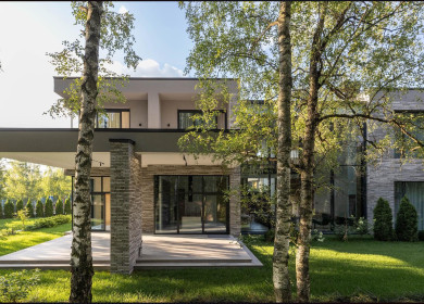 Великолепный загородный дом площадью 800 кв.м. построен в неоклассическом стиле. Внешняя отделка выполнена травертином. Большие французские окна с белым обрамлением создают прекрасный панорамный обзор.