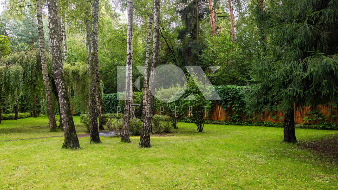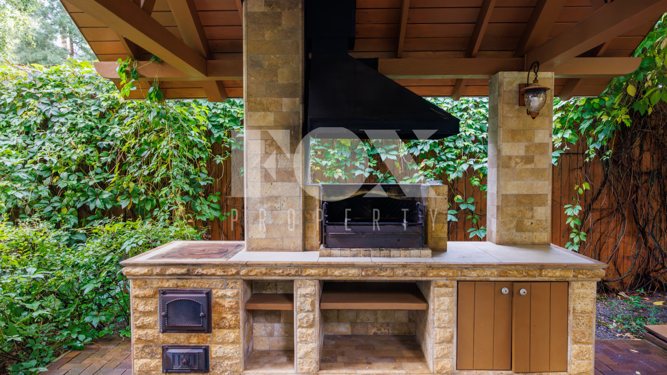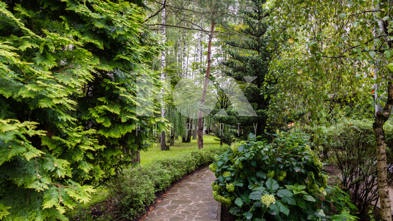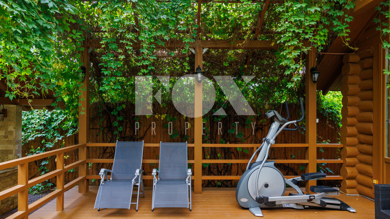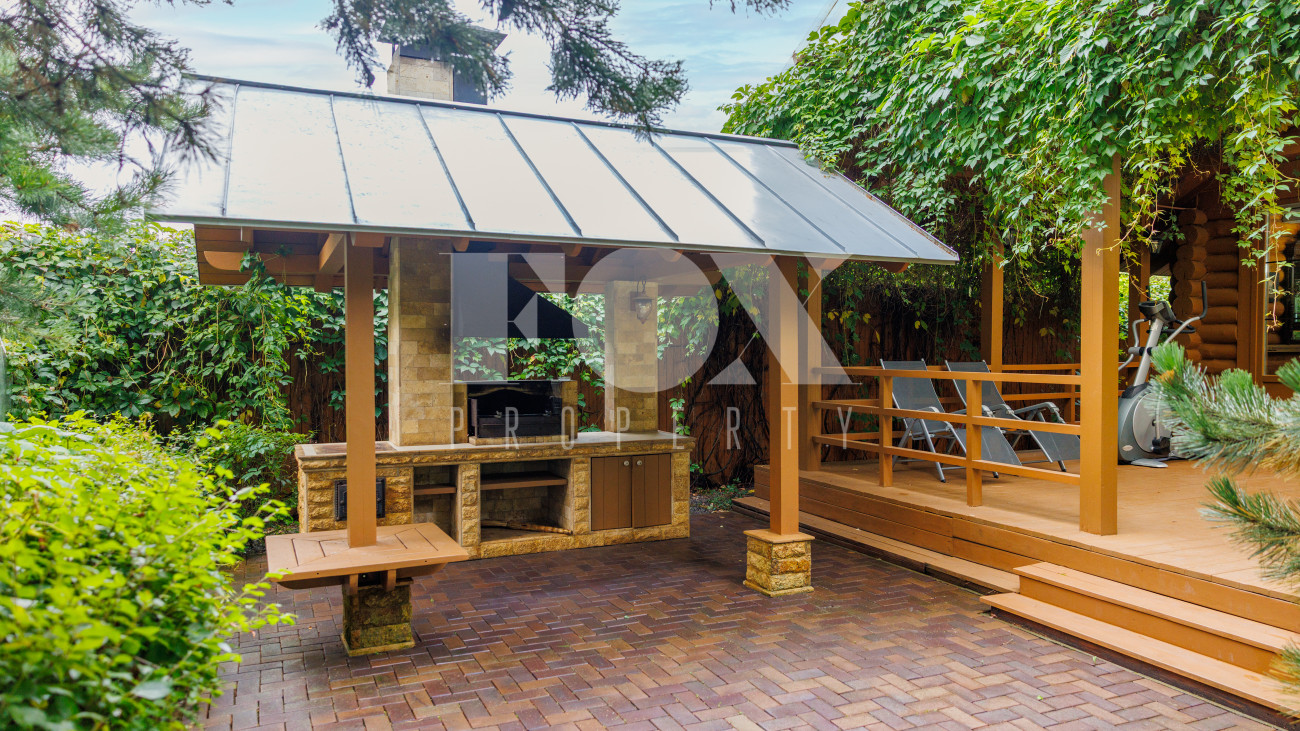 Отдельно расположены дровяная баня площадью 72 кв.м с дубовой бочкой, гараж площадью 105 кв.м с блоком для персонала на втором этаже. Оборудована зона барбекю.