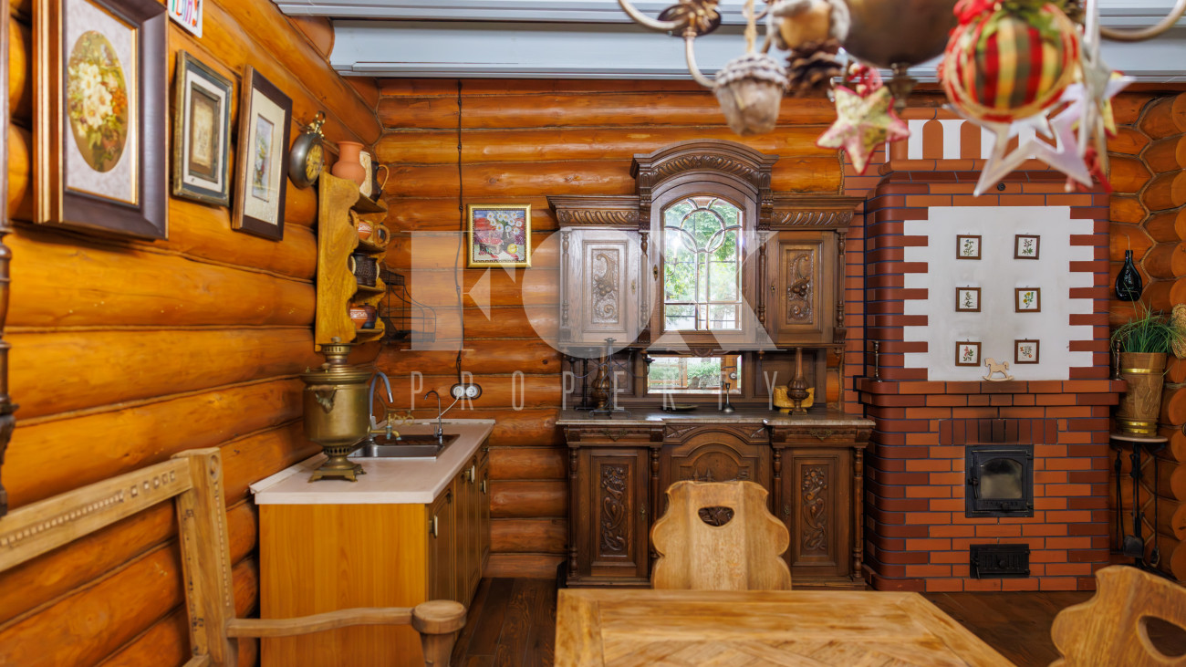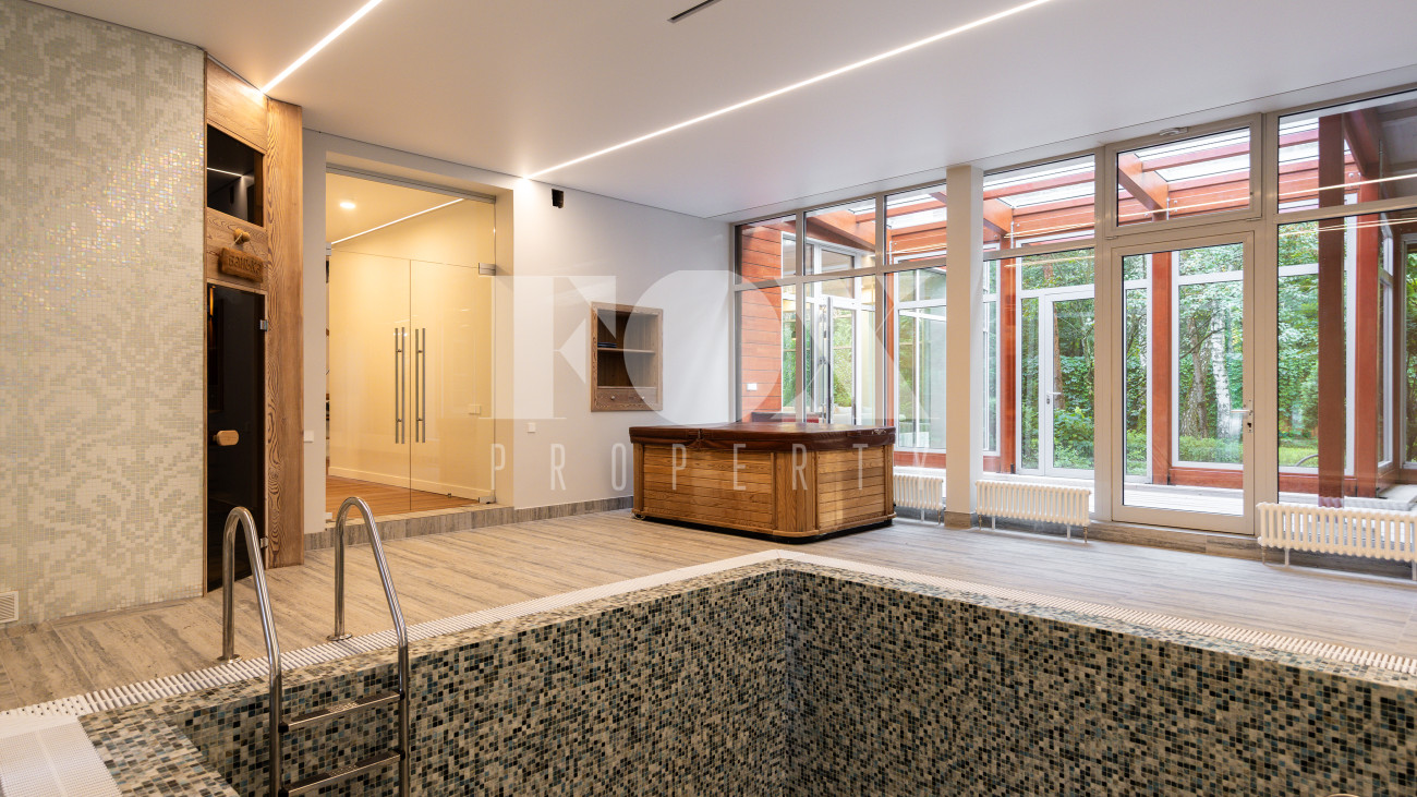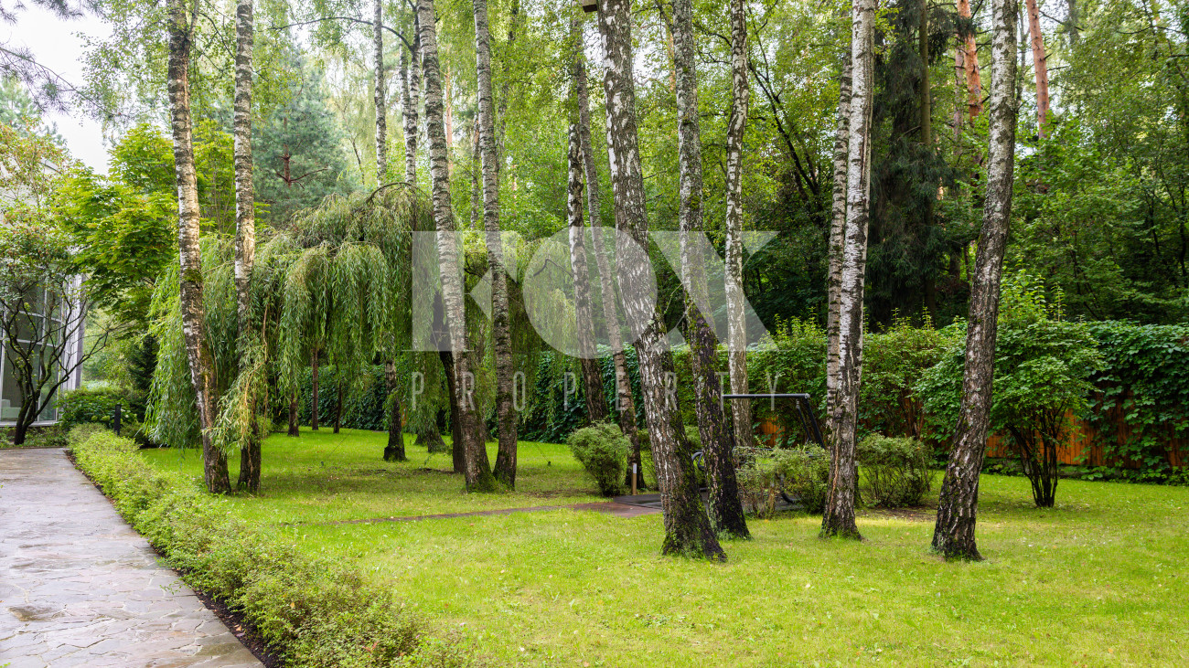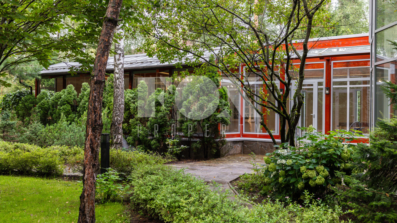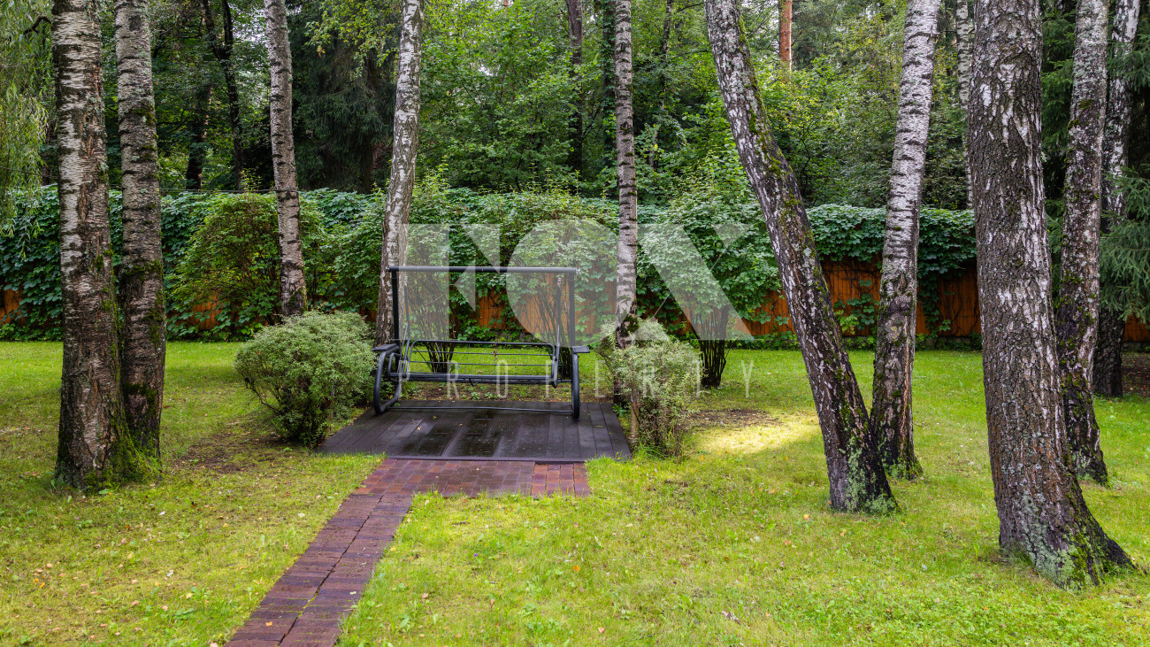 Отдельно расположены дровяная баня площадью 72 кв.м с дубовой бочкой, гараж площадью 105 кв.м с блоком для персонала на втором этаже. Оборудована зона барбекю.