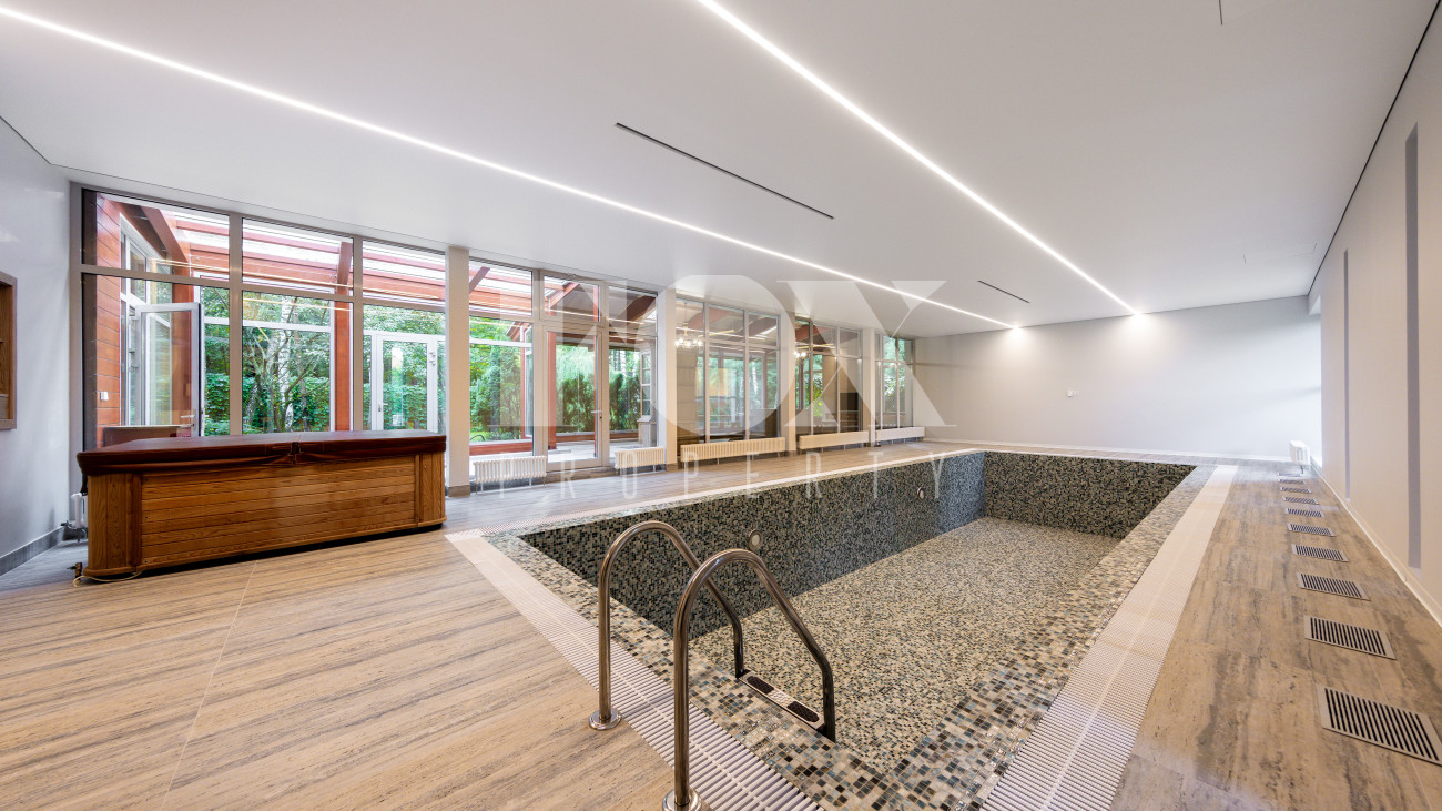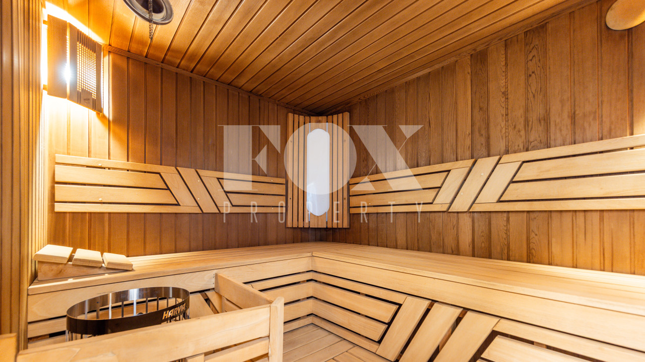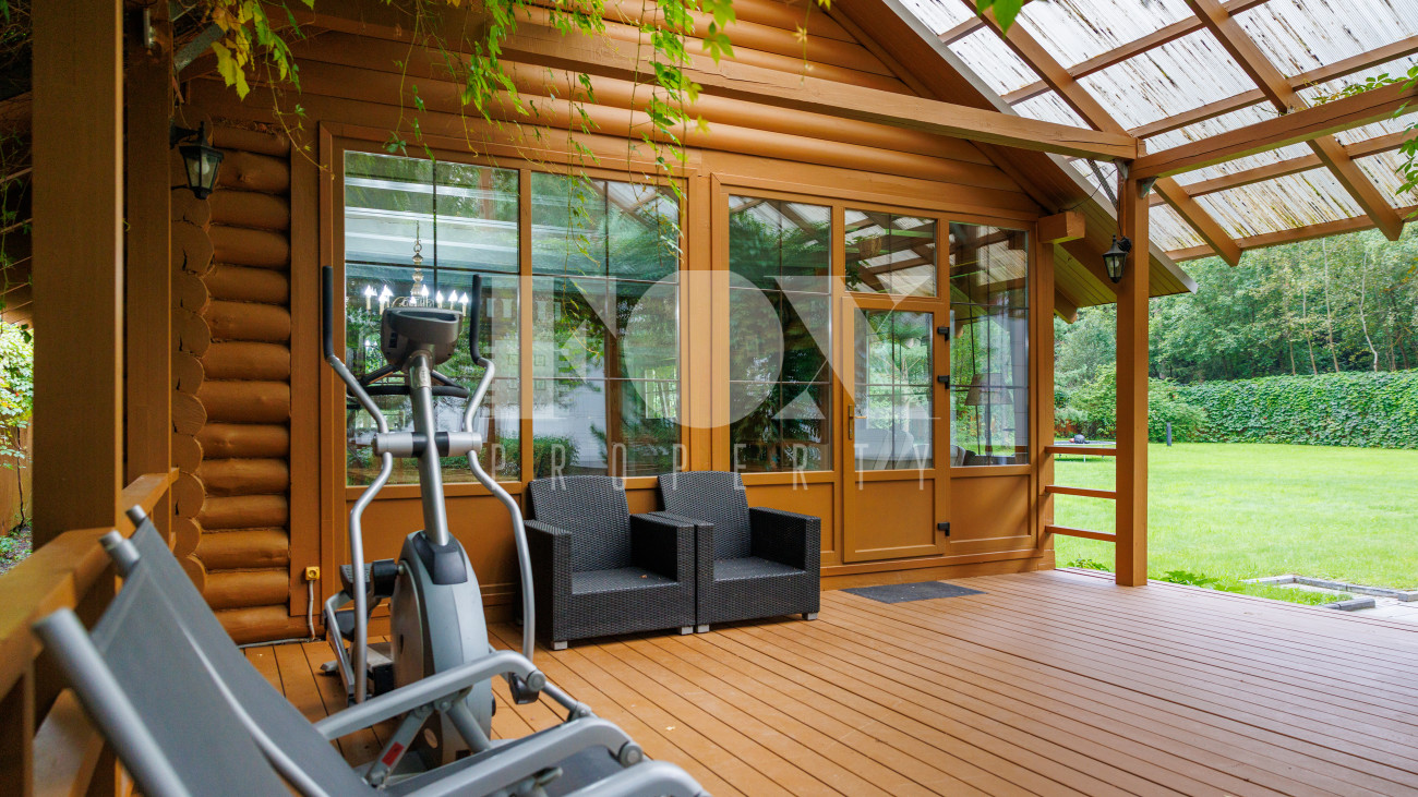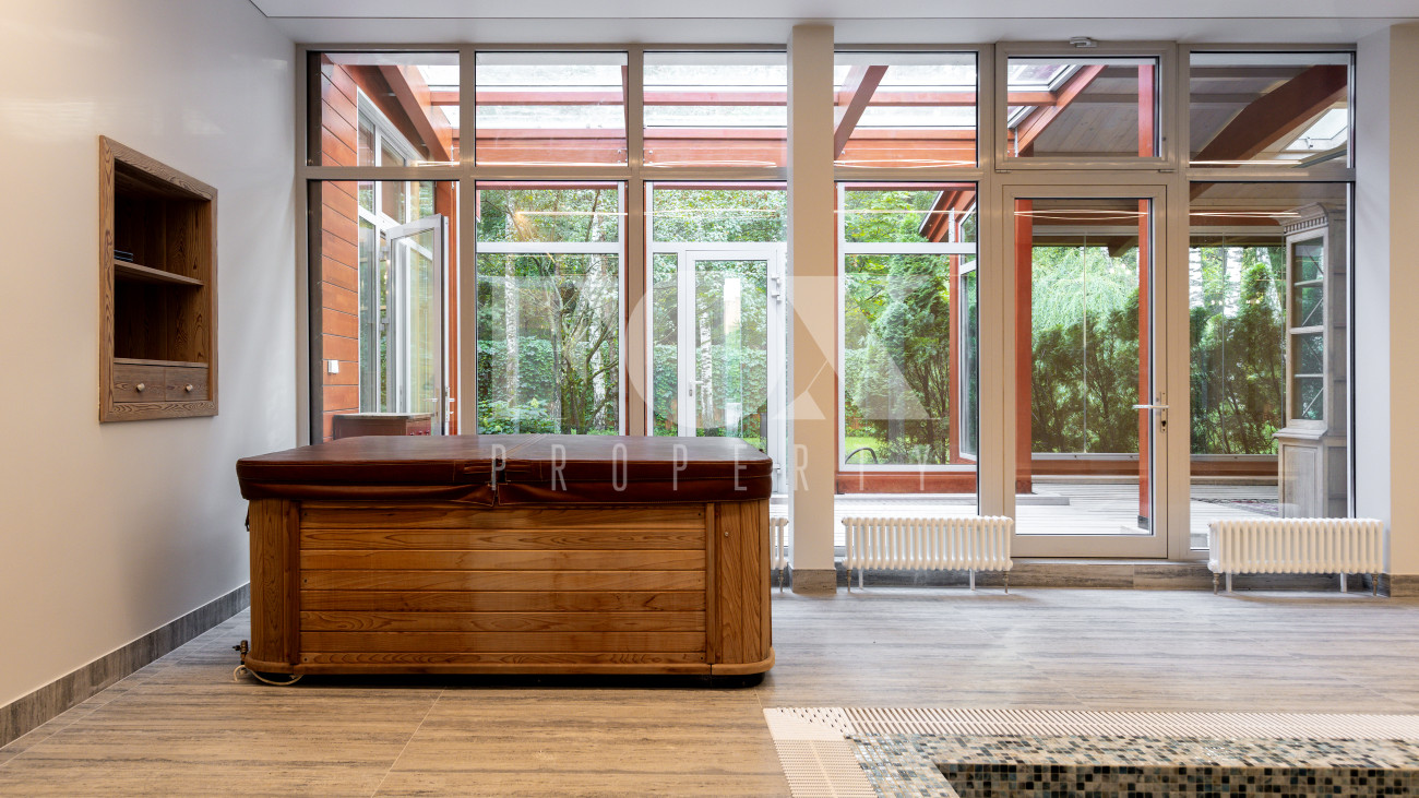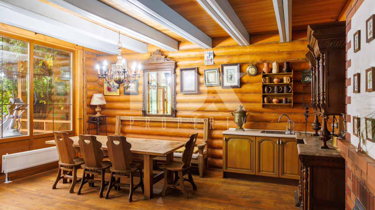 Отдельно расположены дровяная баня площадью 72 кв.м с дубовой бочкой, гараж площадью 105 кв.м с блоком для персонала на втором этаже. Оборудована зона барбекю.