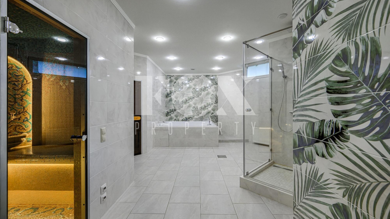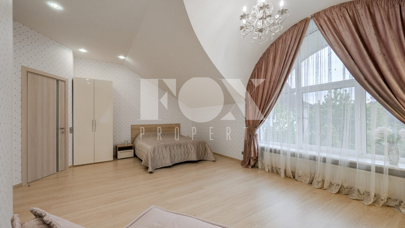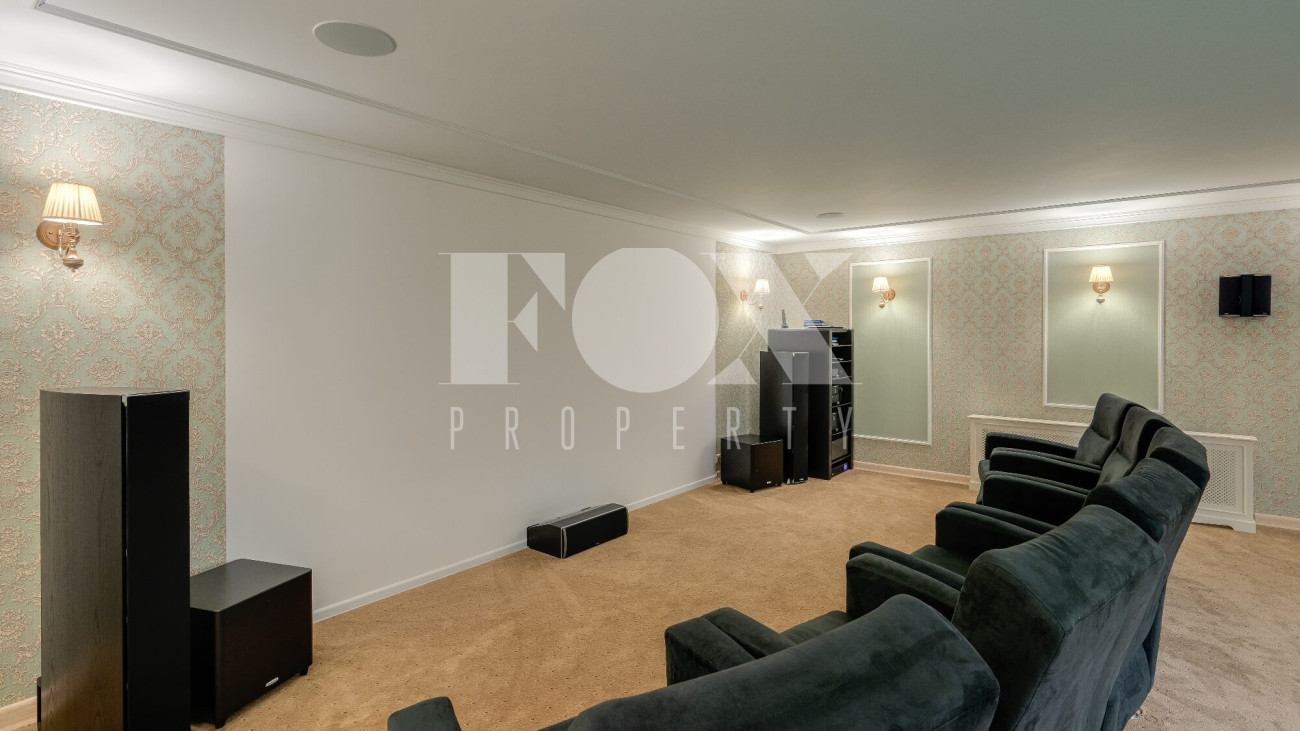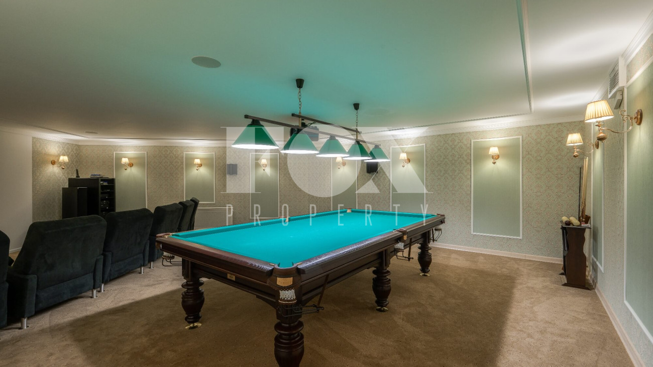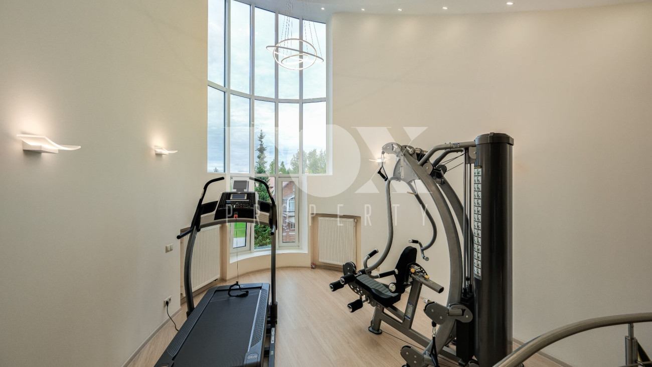 В доме: 3 спальни, холл с парадной винтовой лестницей и панорамными окнами высотой 9,1 м (“тройной свет”), кухня-столовая с выходом на террасу, гостиная с круговым дровяным камином в центре зала, кинотеатр с бильярдной, спа зона с сауной и хаммамом, спортивный зал на третьем этаже с панорамным видом на участок, постирочная, гараж на 2 машиноместа.