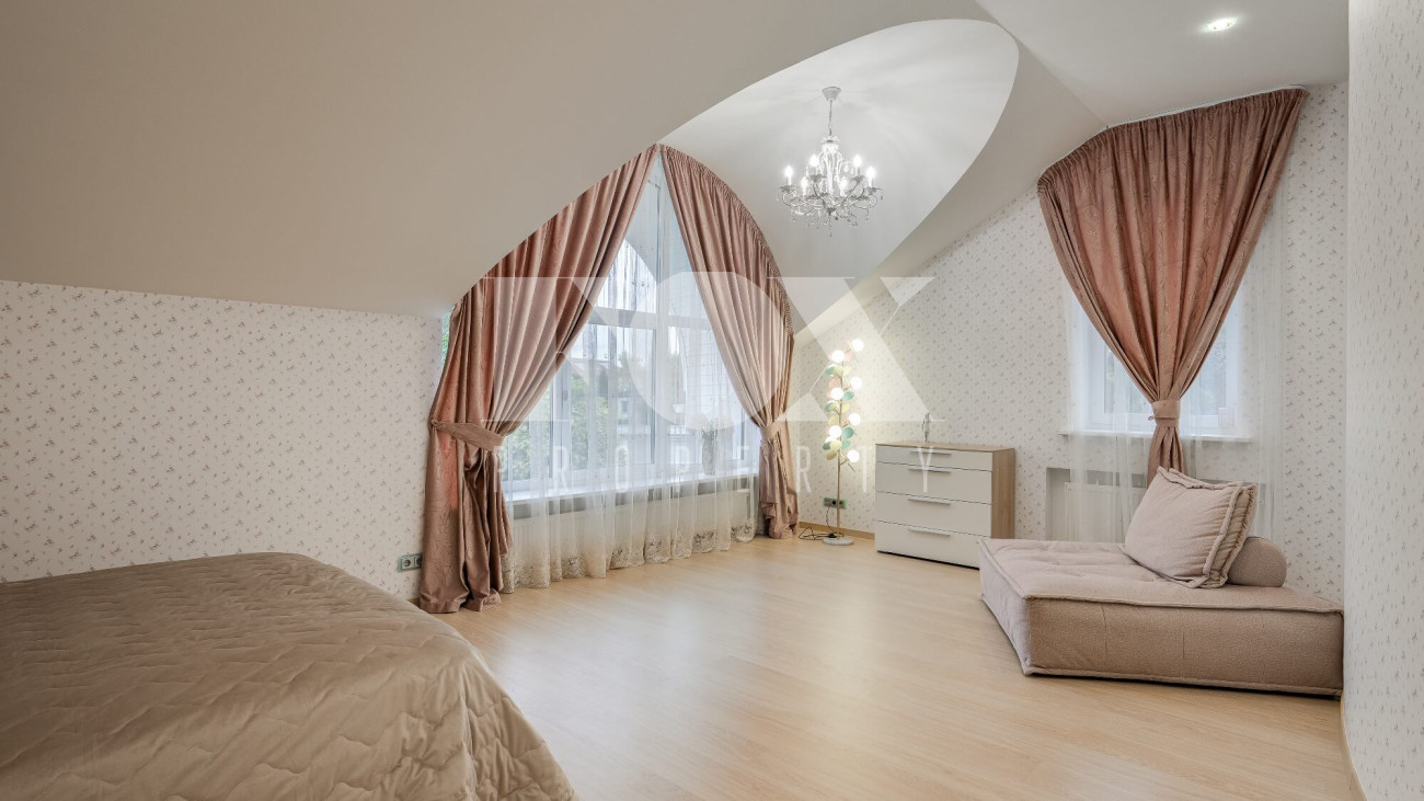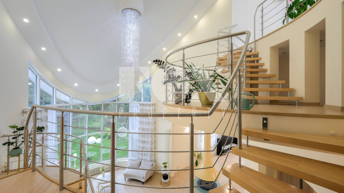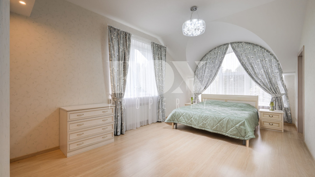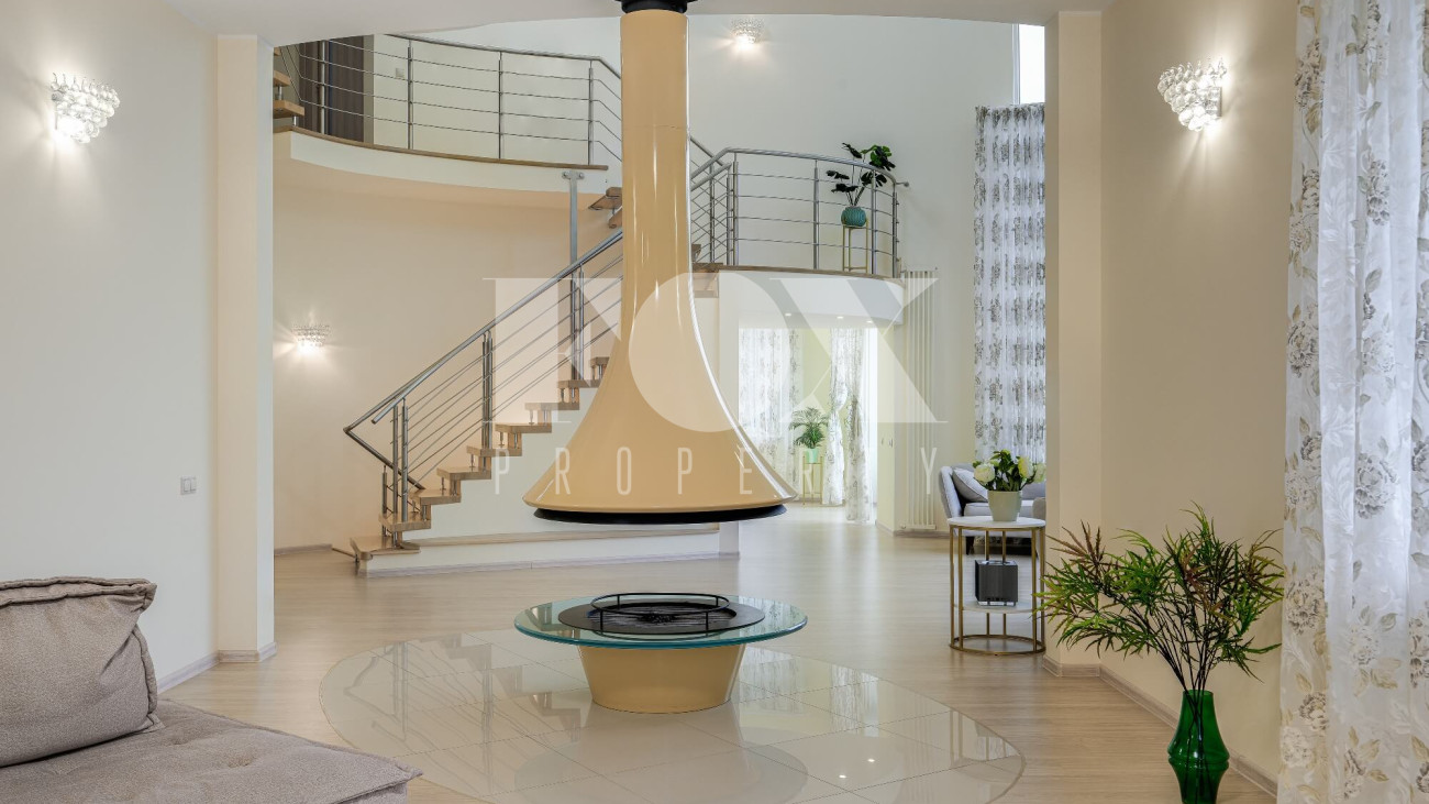 В доме: 3 спальни, холл с парадной винтовой лестницей и панорамными окнами высотой 9,1 м (“тройной свет”), кухня-столовая с выходом на террасу, гостиная с круговым дровяным камином в центре зала, кинотеатр с бильярдной, спа зона с сауной и хаммамом, спортивный зал на третьем этаже с панорамным видом на участок, постирочная, гараж на 2 машиноместа.
