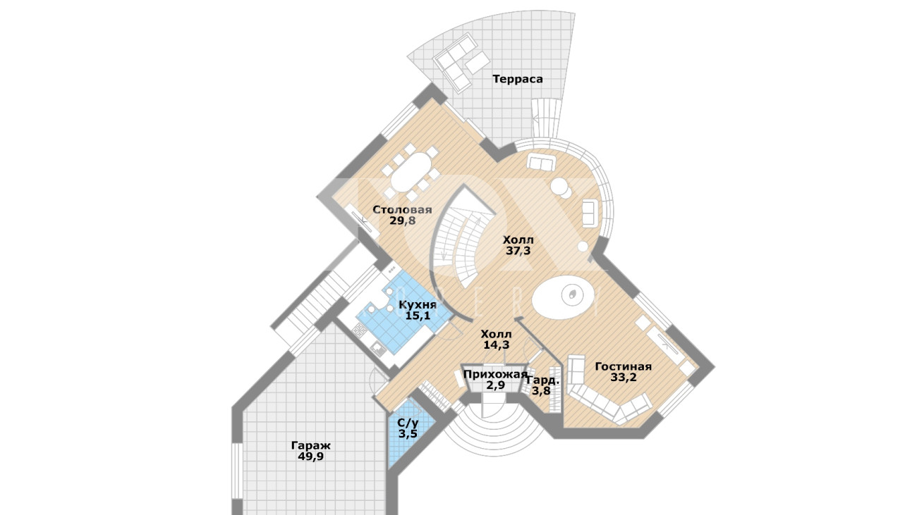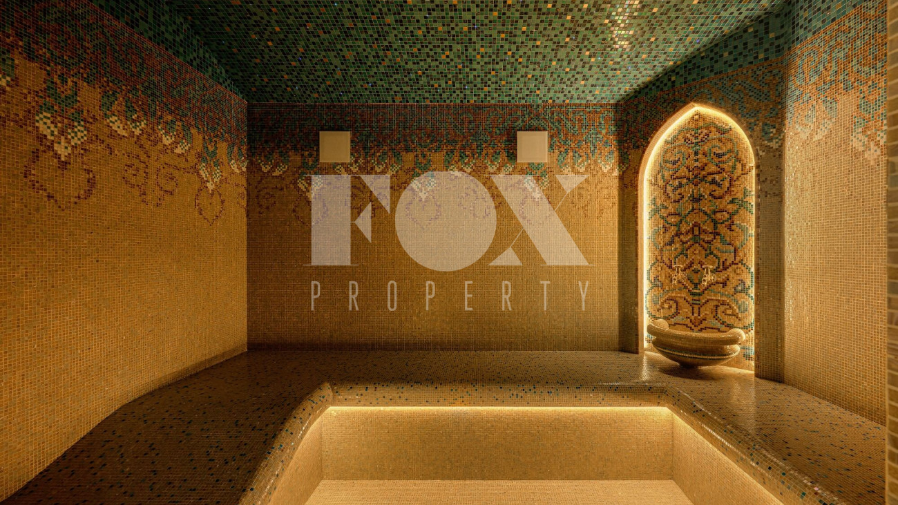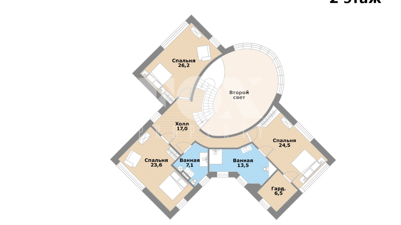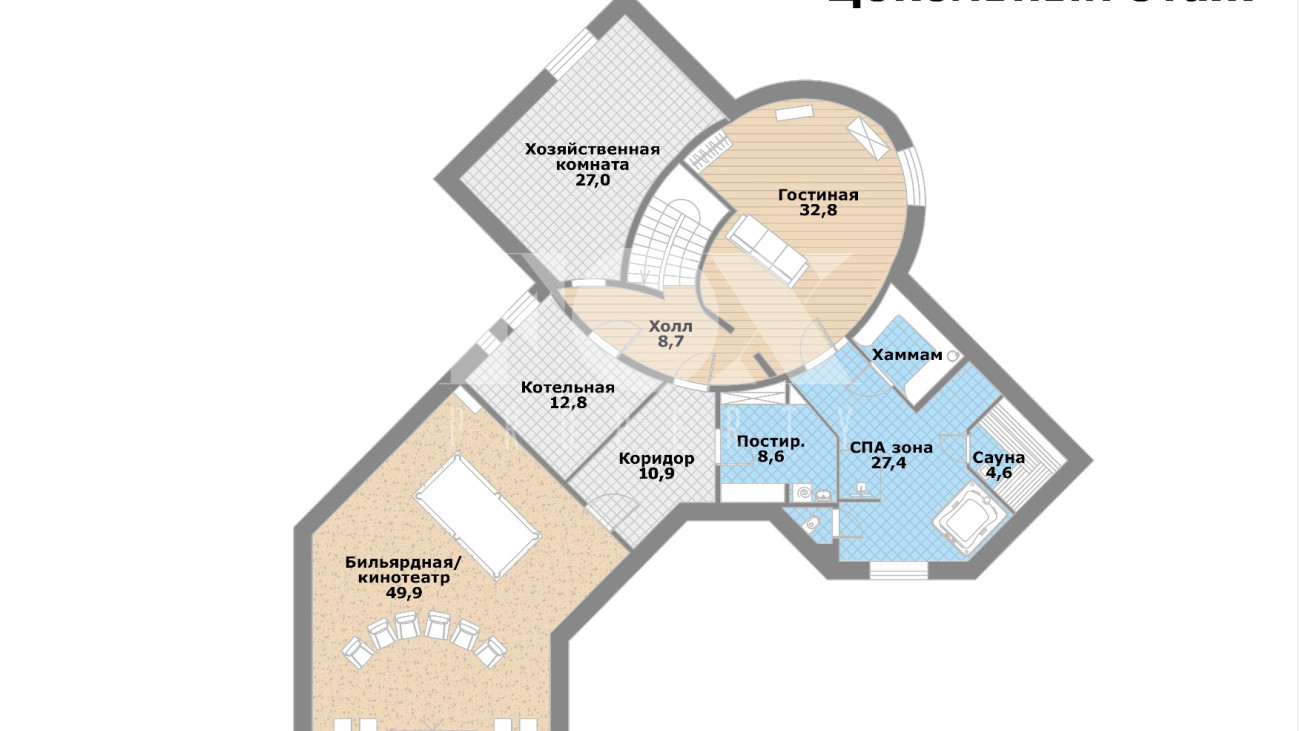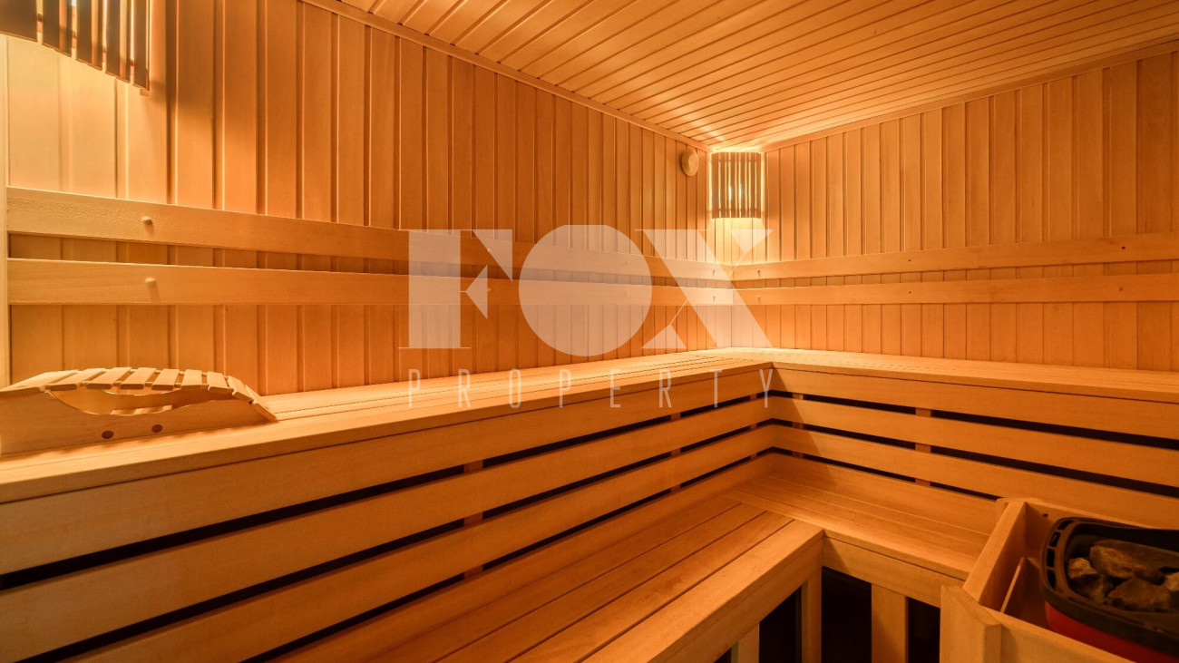 В доме: 3 спальни, холл с парадной винтовой лестницей и панорамными окнами высотой 9,1 м (“тройной свет”), кухня-столовая с выходом на террасу, гостиная с круговым дровяным камином в центре зала, кинотеатр с бильярдной, спа зона с сауной и хаммамом, спортивный зал на третьем этаже с панорамным видом на участок, постирочная, гараж на 2 машиноместа.