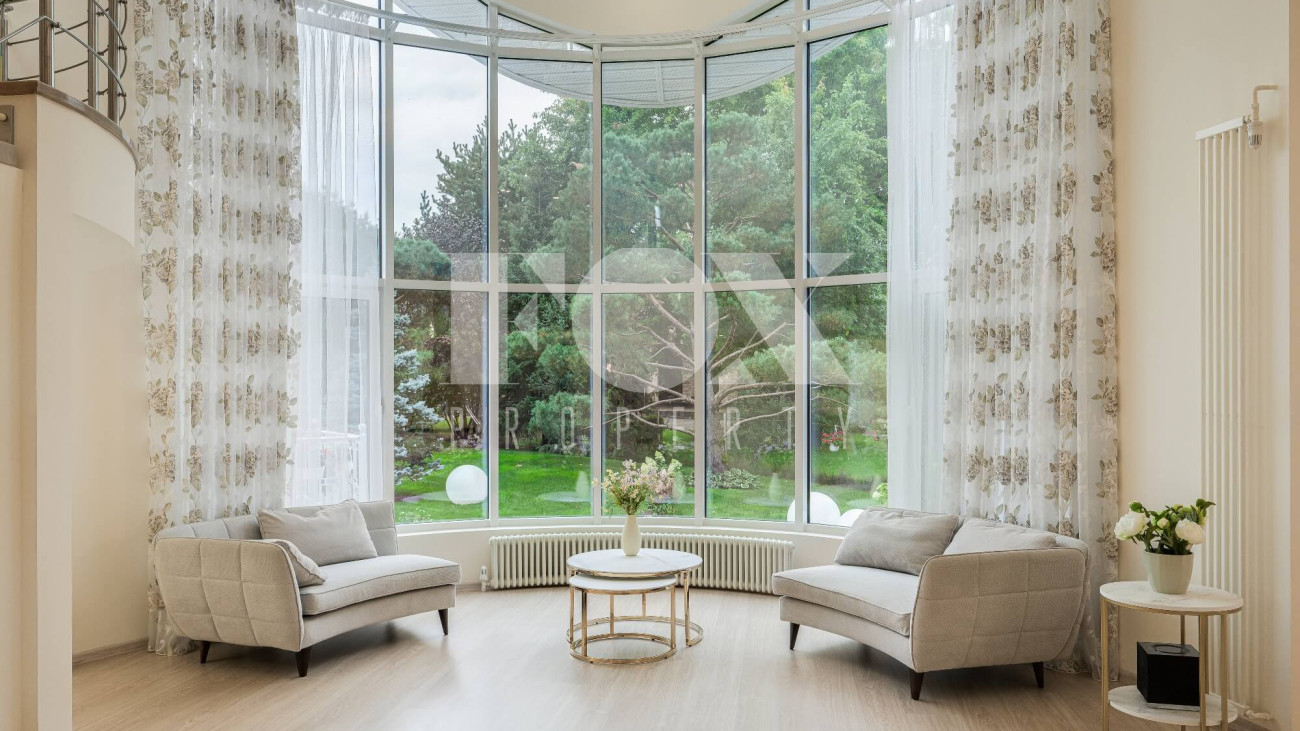Уникальный архитектурный ансамбль сочетает в себе классику, элементы модерна и органической архитектуры. Изящно изогнутые линии фасада подчеркивают индивидуальность проекта. Переменная высота потолков от 3,1 до 9,1 м в зоне второго света создает ощущение простора и легкости. Интерьеры выполнены в светлых, спокойных тонах.