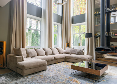Функциональная планировка: 7 спален (5 в основном доме + 2 гостевые в банном комплексе), светлая гостиная, столовая, кухня с островом и кладовой для продуктов, барбекю-зона с террасой, парная с дровяной печью, постирочная, котельная.