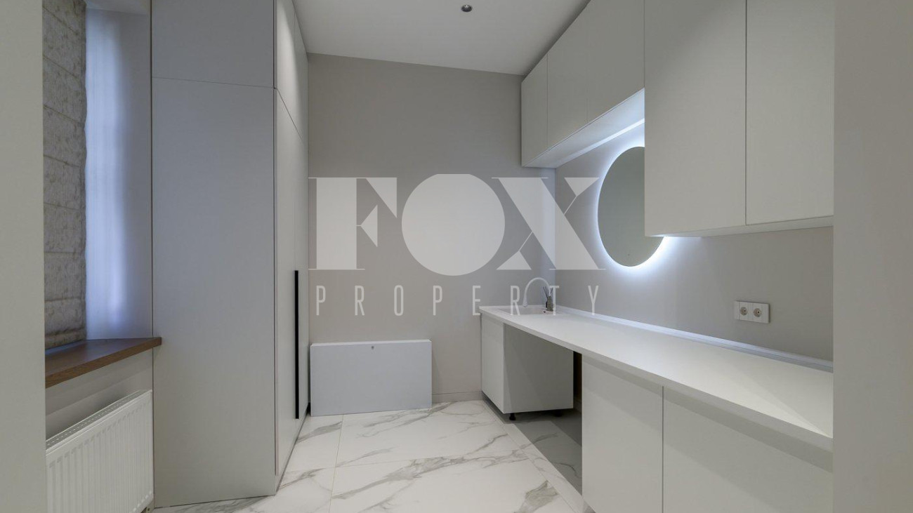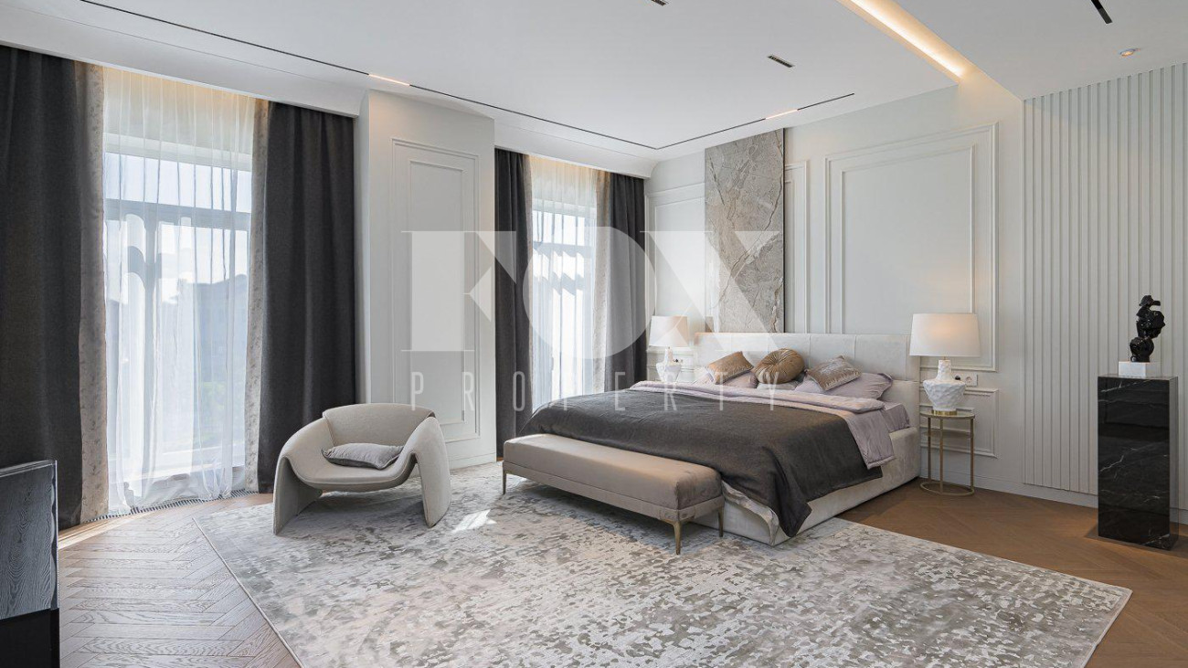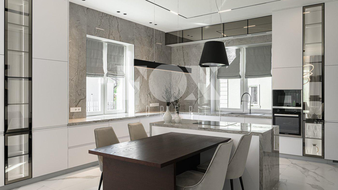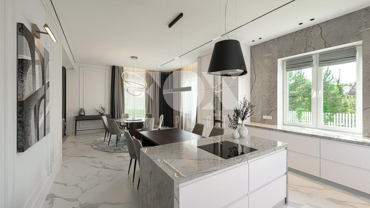 Фасад дома отделан высококачественным светлым натуральным камнем. Кровля из премиальной композитной черепицы. В доме продуманная планировка. На участке расположен вместительный гараж на 2 м/м: 1 этаж: 2 машиноместа, котельная, прихожая; 2 этаж: блок персонала.