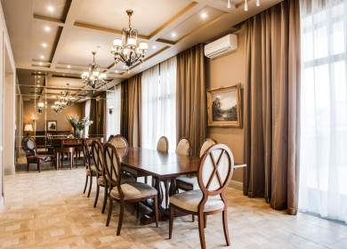 Построен из кирпича, фасад в стиле Райта облицован натуральным камнем и деревом. Во внутренней отделке - современные качественные материалы.
