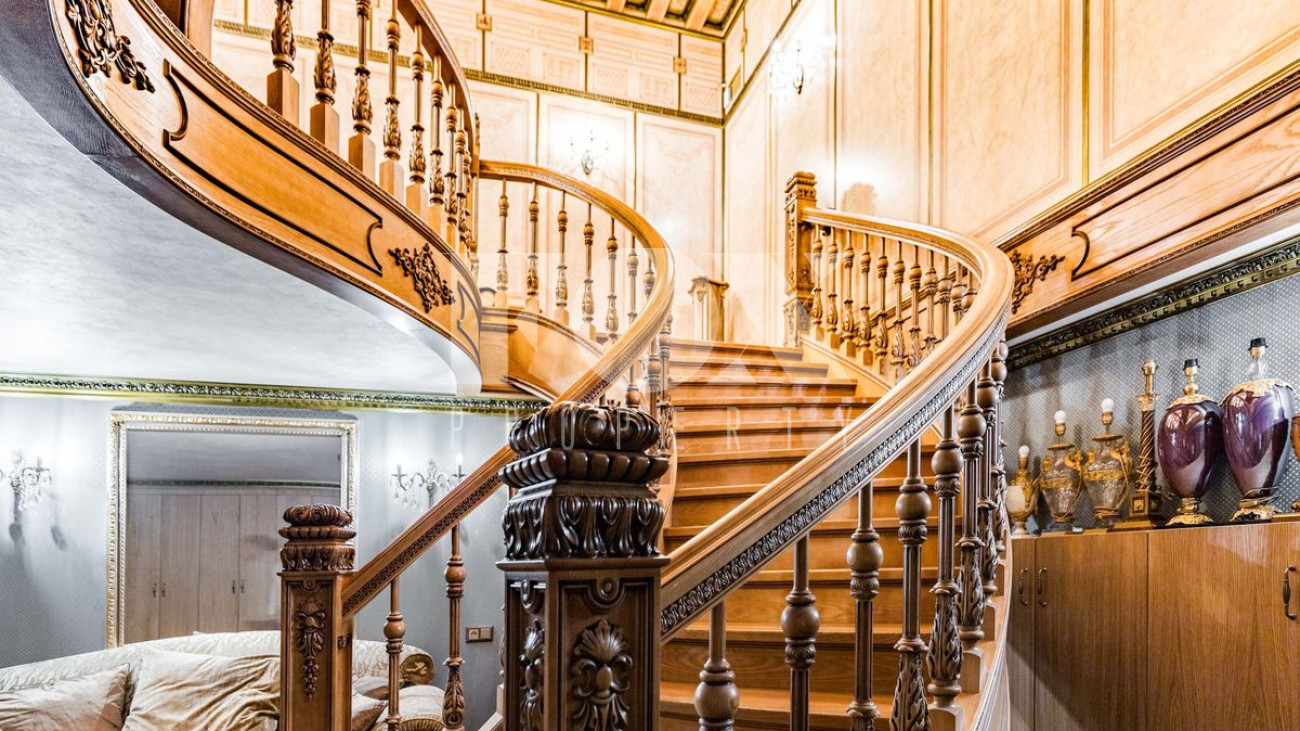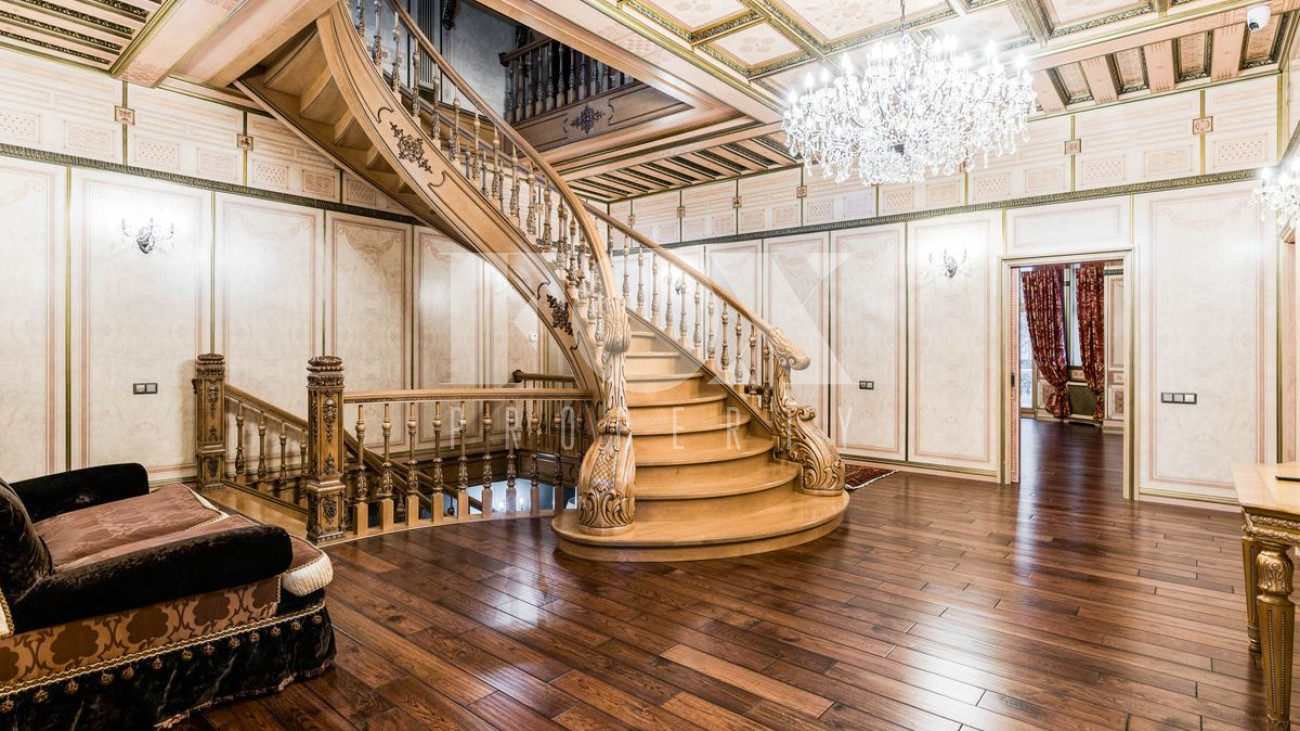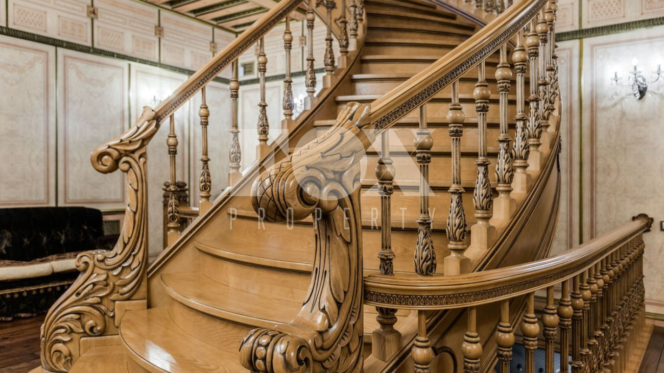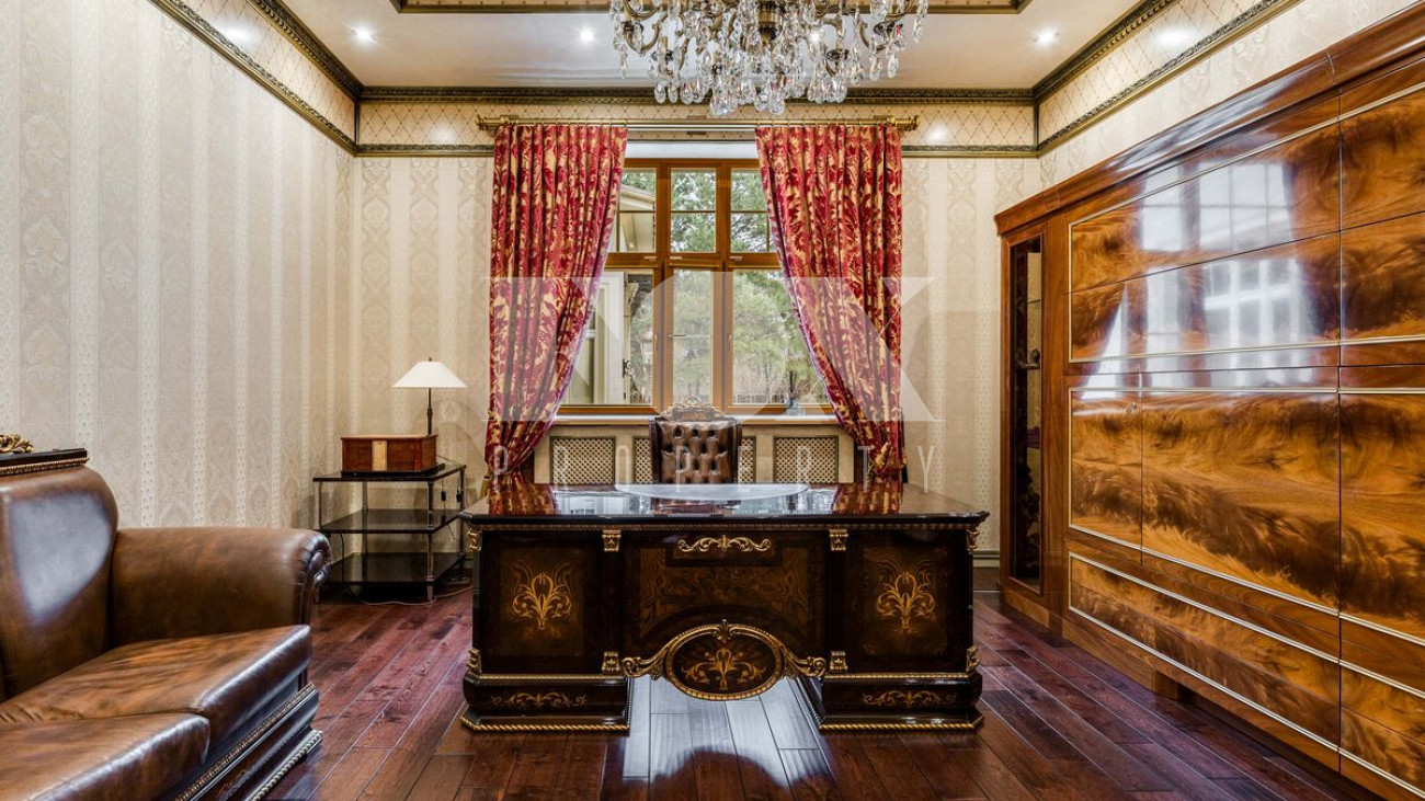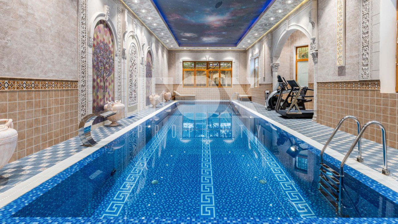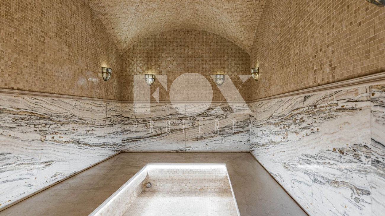Первый этаж — это представительская зона для приема гостей и семейных собраний: просторный парадный холл с высокими потолками и естественным освещением, полностью оборудованная кухня с островом и техникой Miele, смежная столовая на 10–12 человек, уютная гостиная с выходом на террасу, гостевая спальня для посетителей, кабинет для работы или чтения, отдельный санузел, хаммам для расслабляющих процедур и крытый бассейн с подогревом длиной 6–8 метров для ежедневных занятий плаванием.