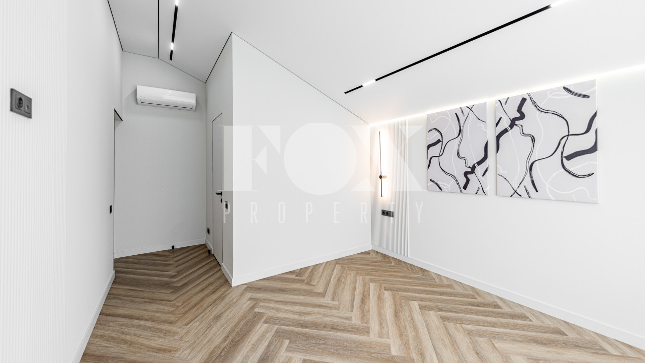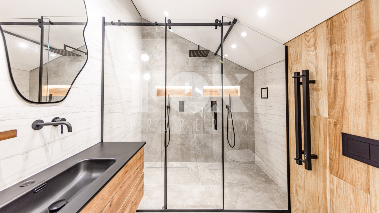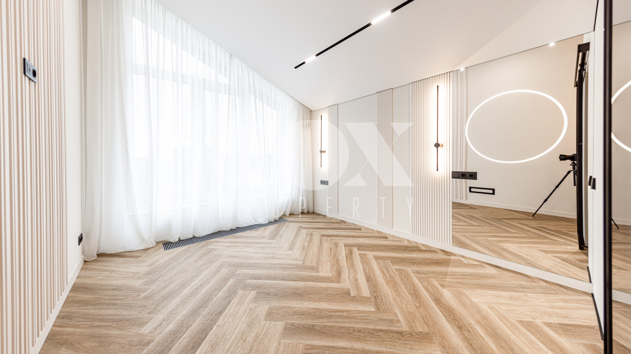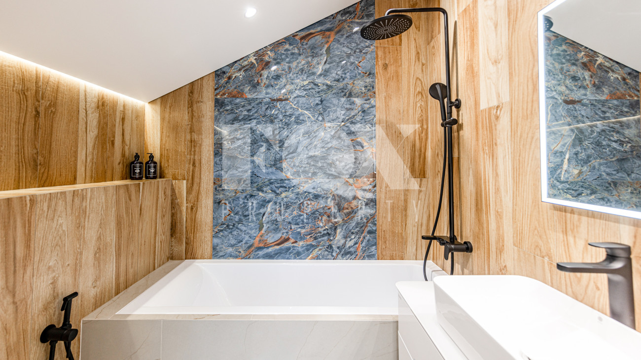 - напольное покрытие: 1-й этаж (зона холла) и все санузлы — керамогранит, все жилые комнаты, игровая зона и гостиная — кварцвинил LVT Tarkett, уложенный по типу "елочка".