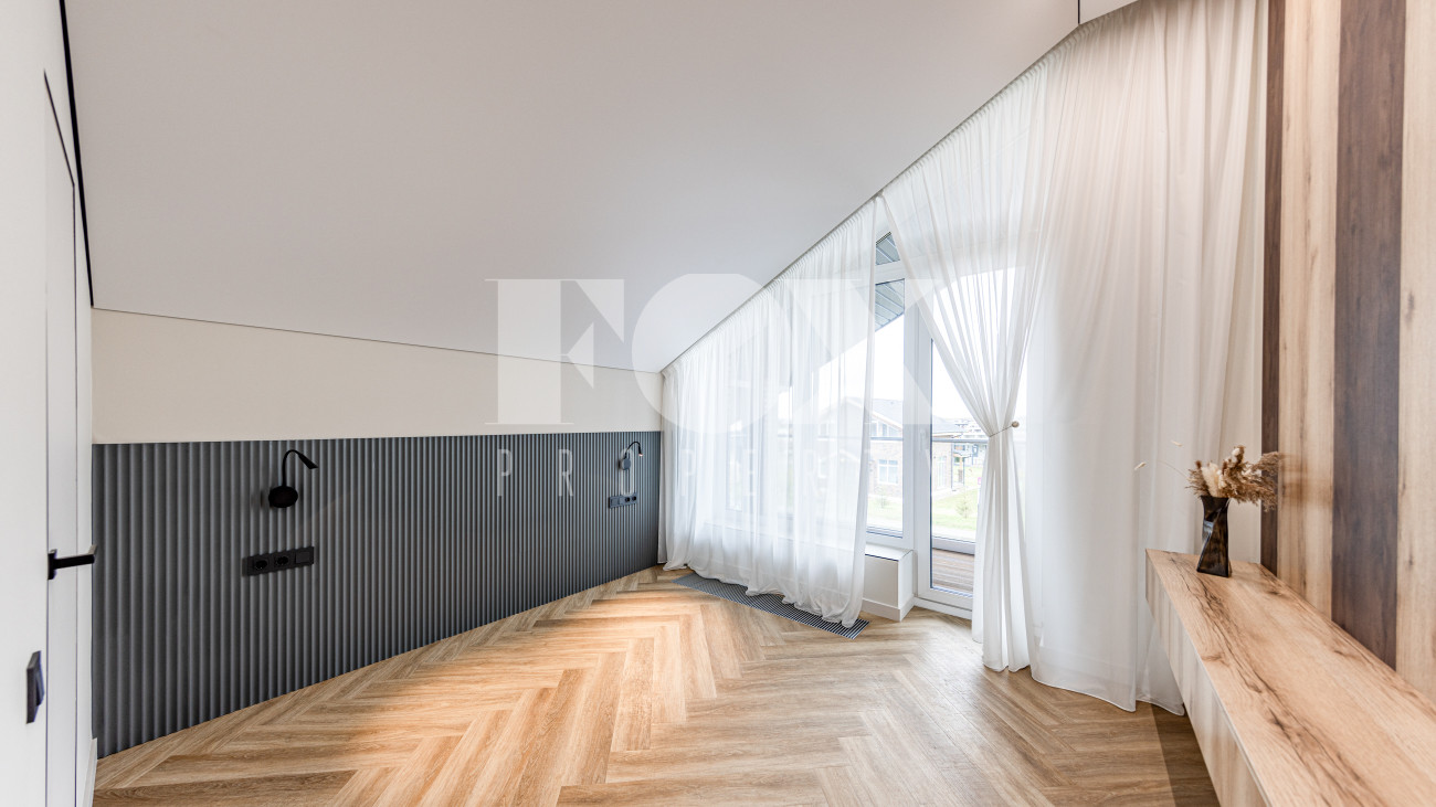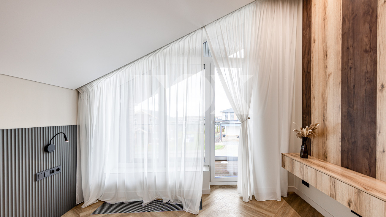- Портальные раздвижные двери, открывающий выход из гостиной на просторную террасу 37 м2.