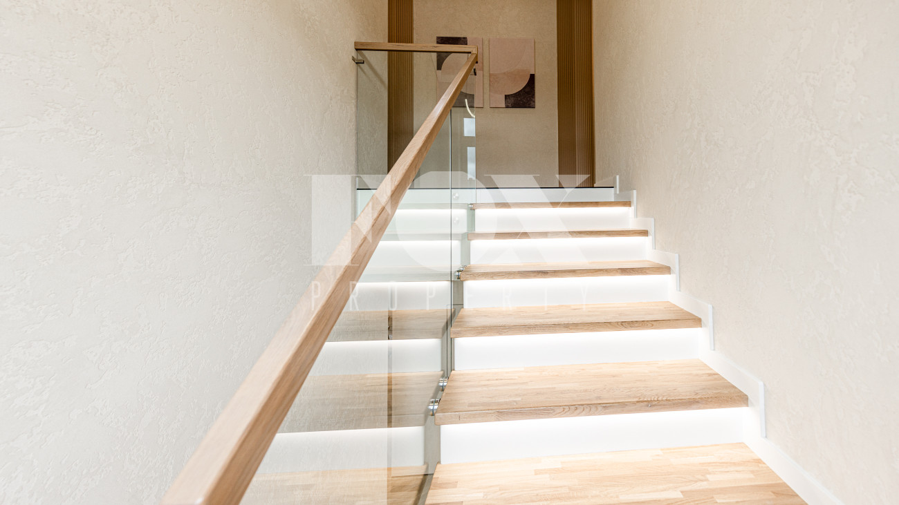 - Лестница с подсветкой и ограждение выполненное из закаленного стекла с деревянным поручнем.
