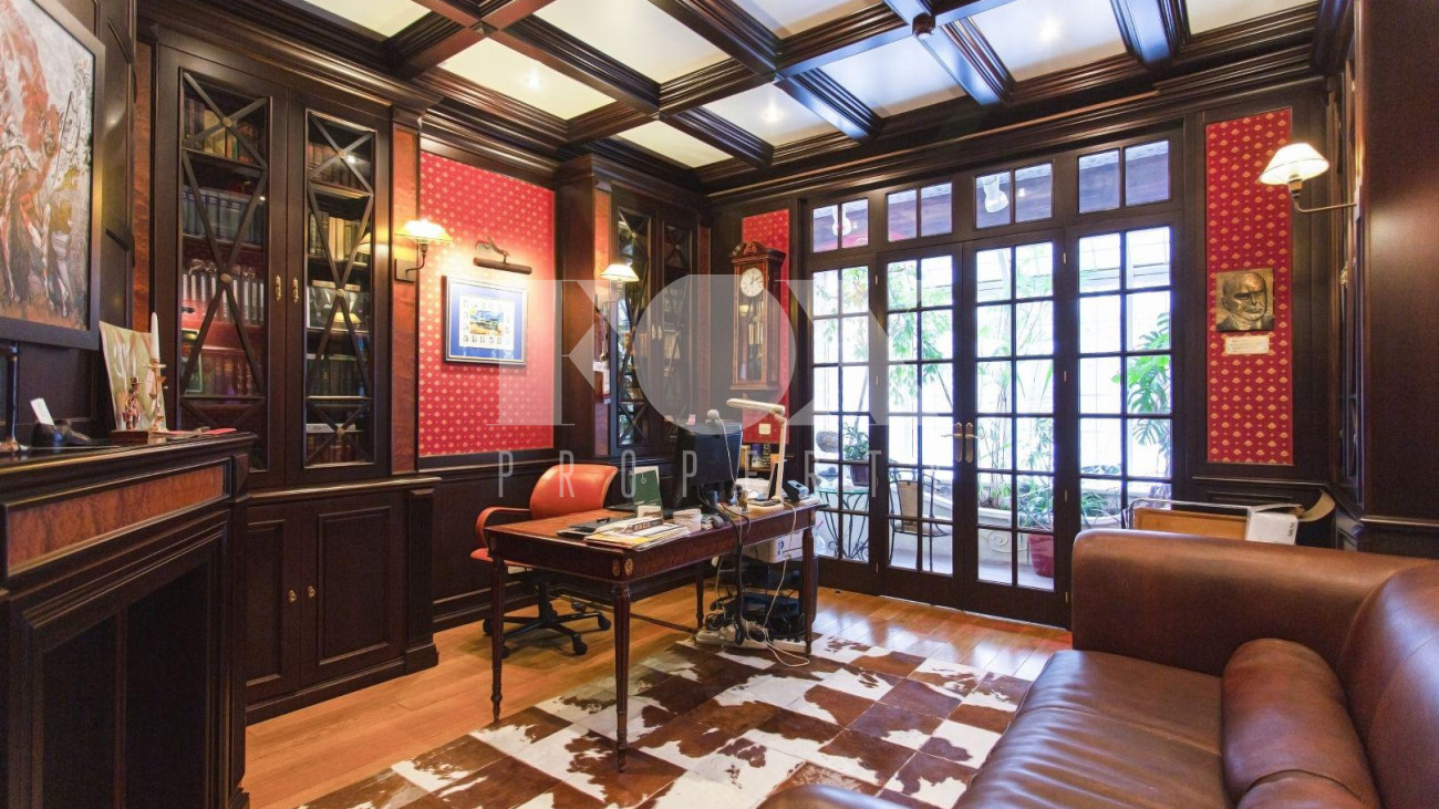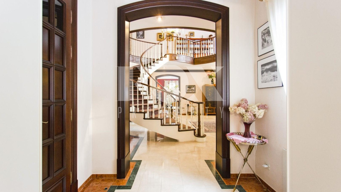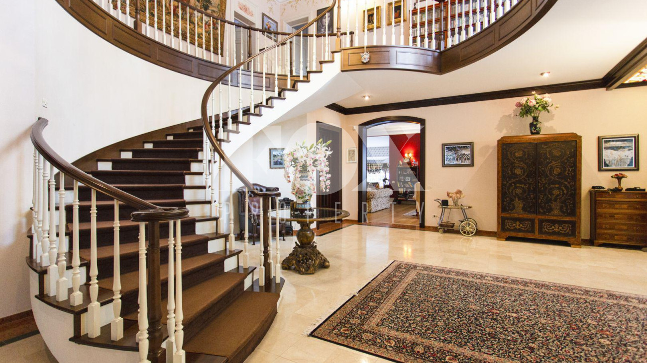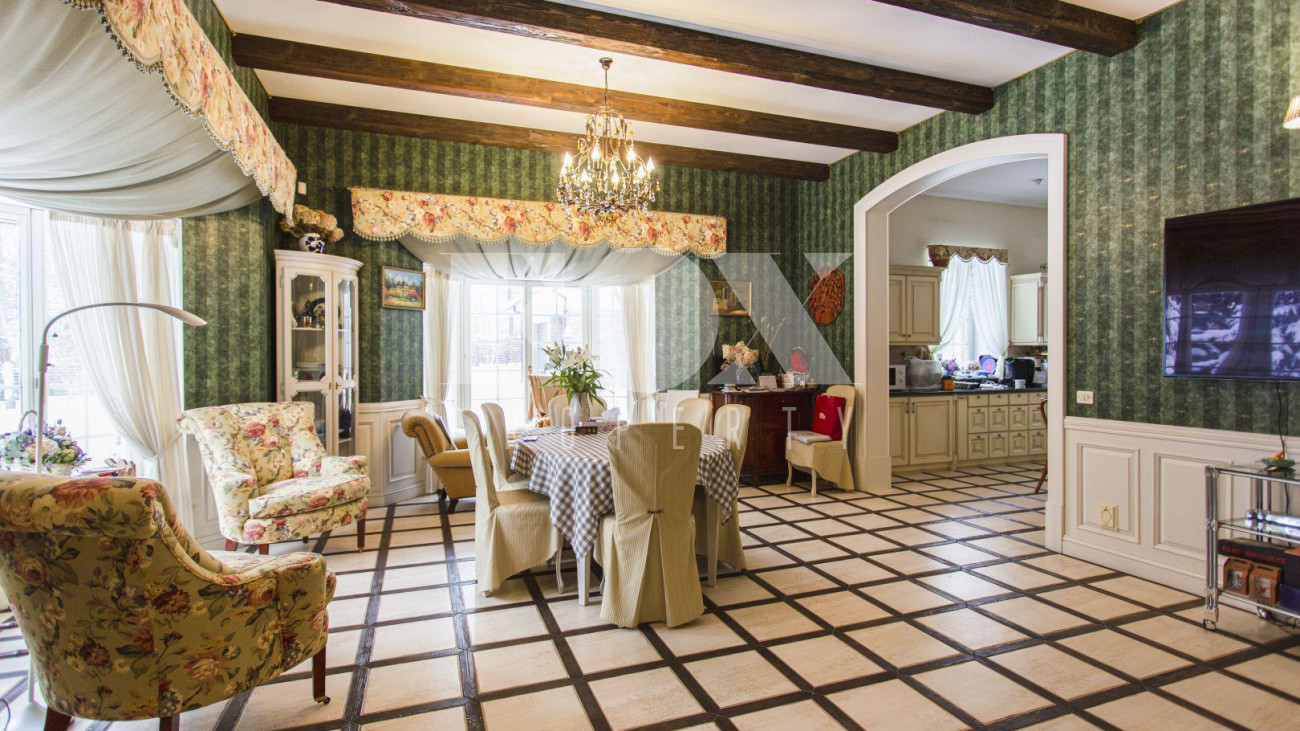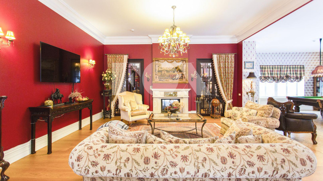 На участке с эксклюзивным ландшафтом, корабельными соснами, вековыми елями, канадскими клёнами и разнообразными хвойными деревьями и кустарниками располагается прекрасный дом в английском стиле, гараж с квартирой для персонала, пергола, в которой летом устанавливают бассейн, а также элегантности ландшафту придаёт изящный фонтан. Весь участок в собственности. За участком начинается лесной массив, далее протекает Москва- река. Дом построен по проекту европейского архитектурного бюро, планировки дома продуманные и комфортные для жизни, интерьер оформлен в современном классическом стиле, гармонично подобрана авторская мебель и предметы быта, состояние нового дома. В доме установлен встроенный пылесос. На первом этаже просторная гостиная с камином, бильярдной зоной и выходом в зимний сад с чудесными растениями и деревьями из разных уголков мира. Функциональная кухня оборудована современной надежной техникой, рядом с кухней есть прохладная кладовая для хранения продуктов и всего необходимого. Элегантная и удобная лестница ведет на второй этаж в зону просторной библиотеки с выходом на террасу и зоной спален. Все четыре спальни приватно расположены в разных сторонах дома, в мастер- спальне очень просторная гардеробная и ванная комната. Дом и участок уникальны, не имеют аналогов и являются жемчужиной дальней Рублёвки. Тишина, сосны, свежий воздух в окружении комфорта и роскоши.