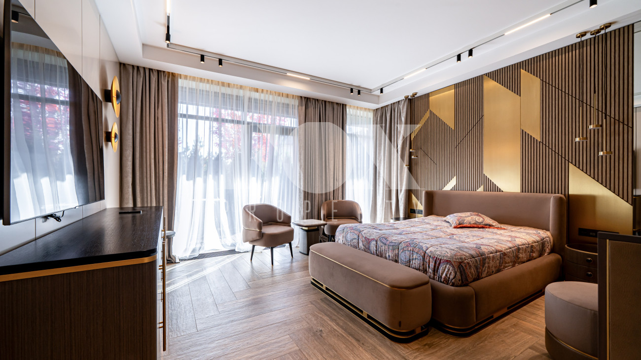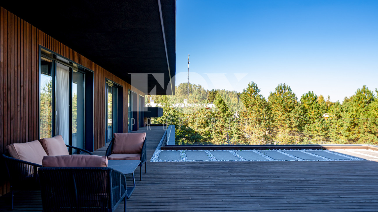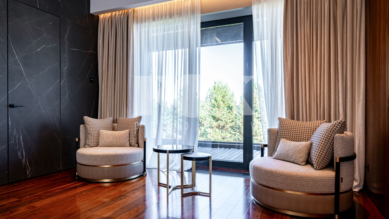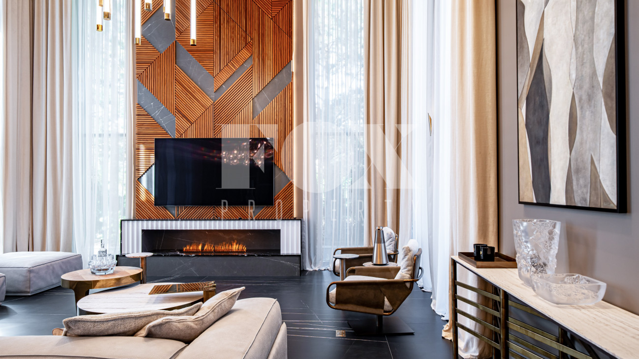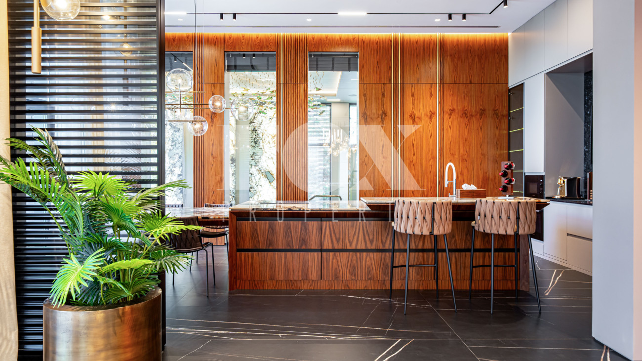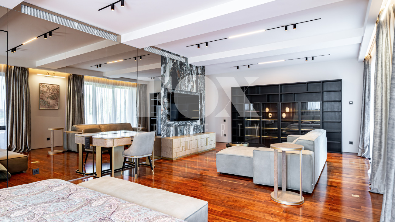 Дом площадью 745 м² с 6 спальнями расположен на видовом участке 22,2 сотки в одном из самых престижных поселков «Ренессанс Парк» на Новой Риги. Элегантная архитектура в духе Райта, идеальные пропорции и виды на зелёные аллеи создают атмосферу простора и покоя. Дом полностью готов к проживанию и впечатляет продуманным планировочным решением.Интерьер создан студией Prosvirin Design и сочетает натуральные материалы и высокие технологии. В отделке использованы кварцит, редкие породы дерева, итальянская сантехника CEA и Antonio Lupi, свет от Центрсвет и ведущих итальянских брендов.