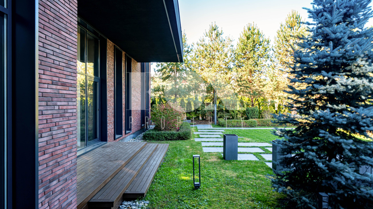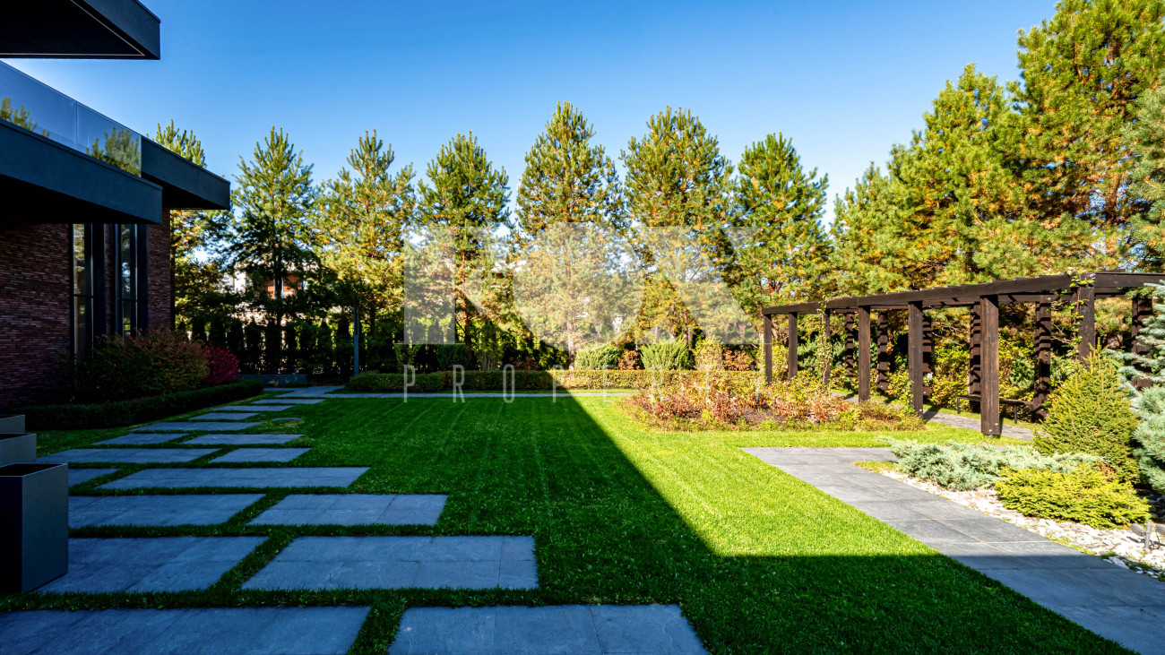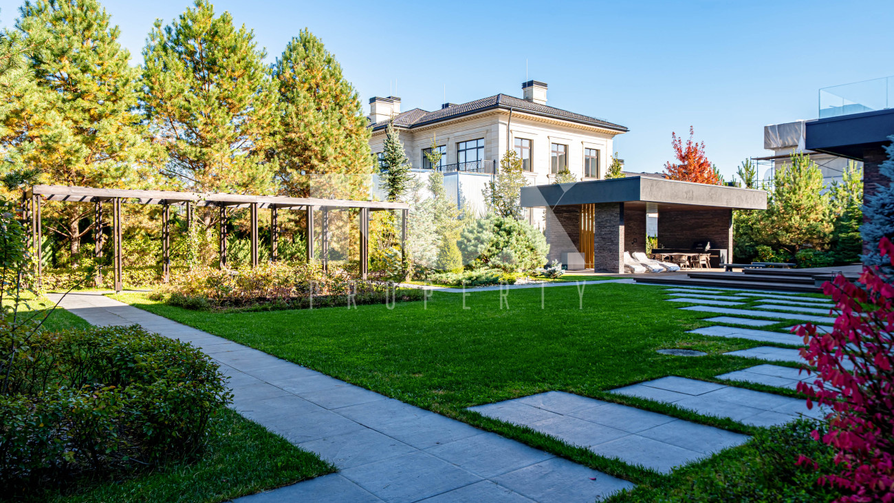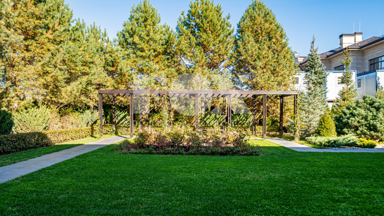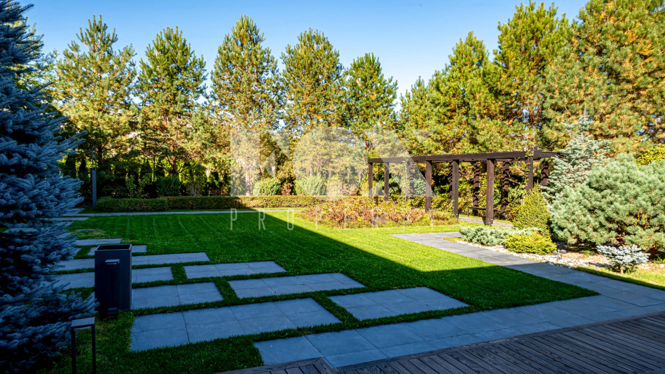 На участке выполнен ландшафтный дизайн с перголами, зелёными изгородями и уютными дорожками.