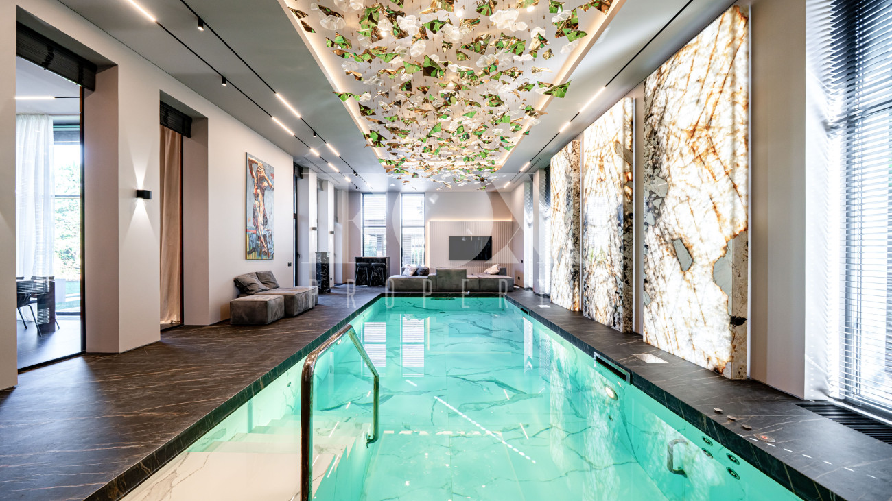 СПА-зона — сердце дома. Бассейн размером 3,6×8 м с системой противотока Aquamaster и зоной гидромассажа дарит ощущение полного расслабления. Панорамное остекление наполняет пространство светом, позволяя наслаждаться видом на участок и природой за окном.