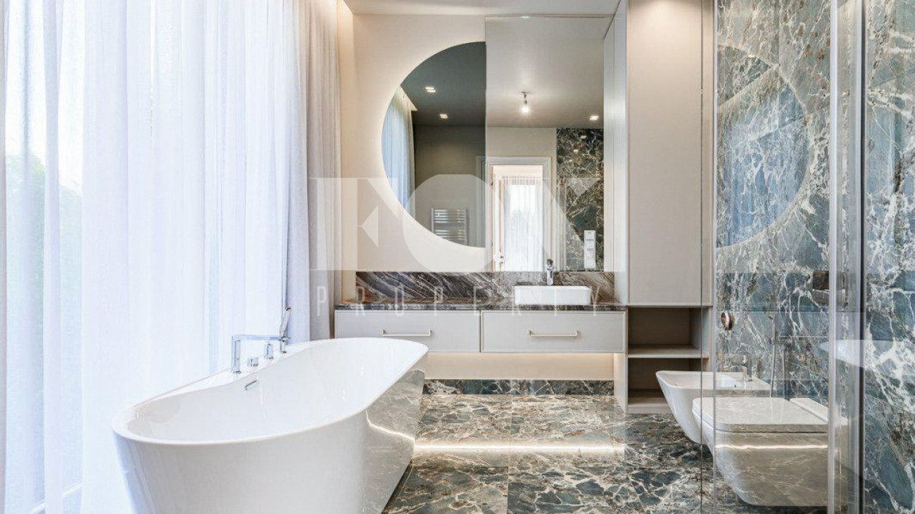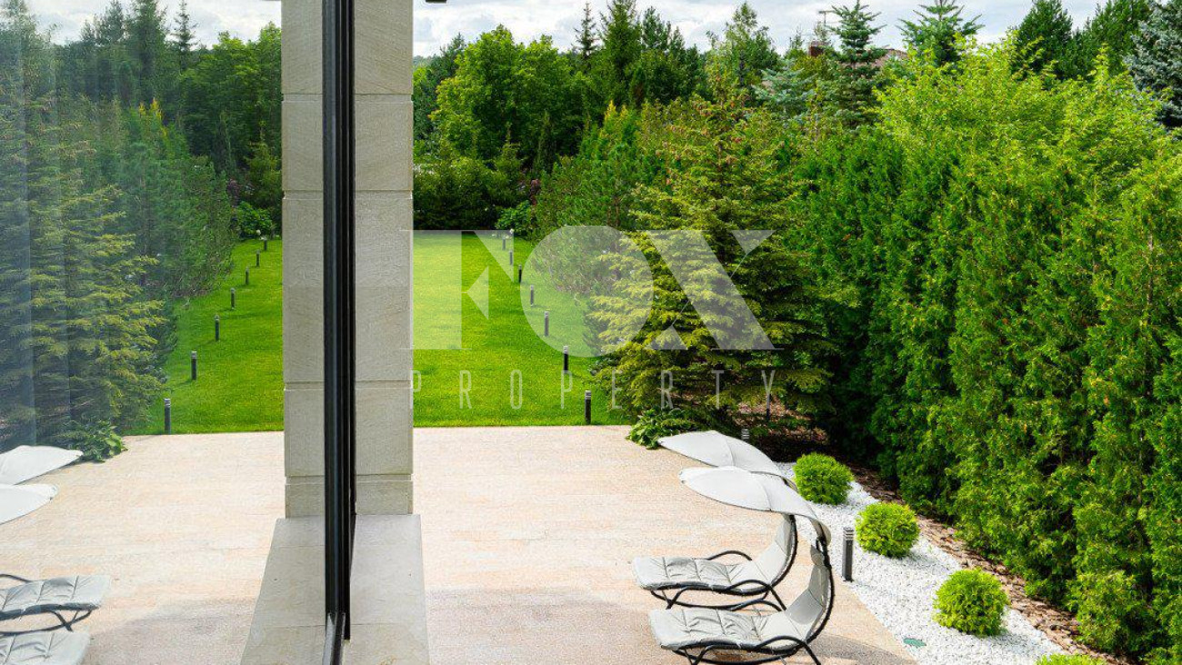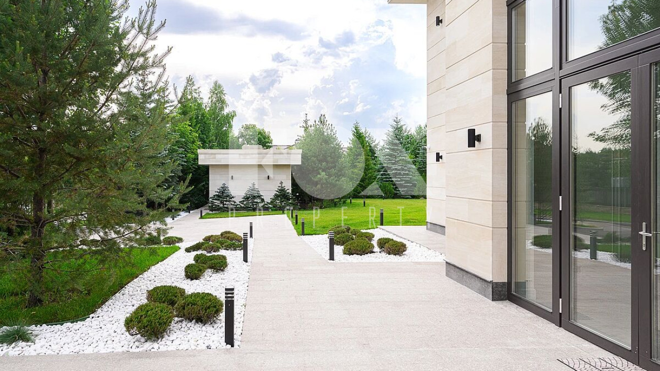 Ландшафт включает в себя эксклюзивные виды растений, автоматический полив, уличное освещение. Въездная группа, терраса и дорожки вымощены из гранита с подогревом. На участке расположен отдельно стоящий гостевой дом с 2 спальнями.