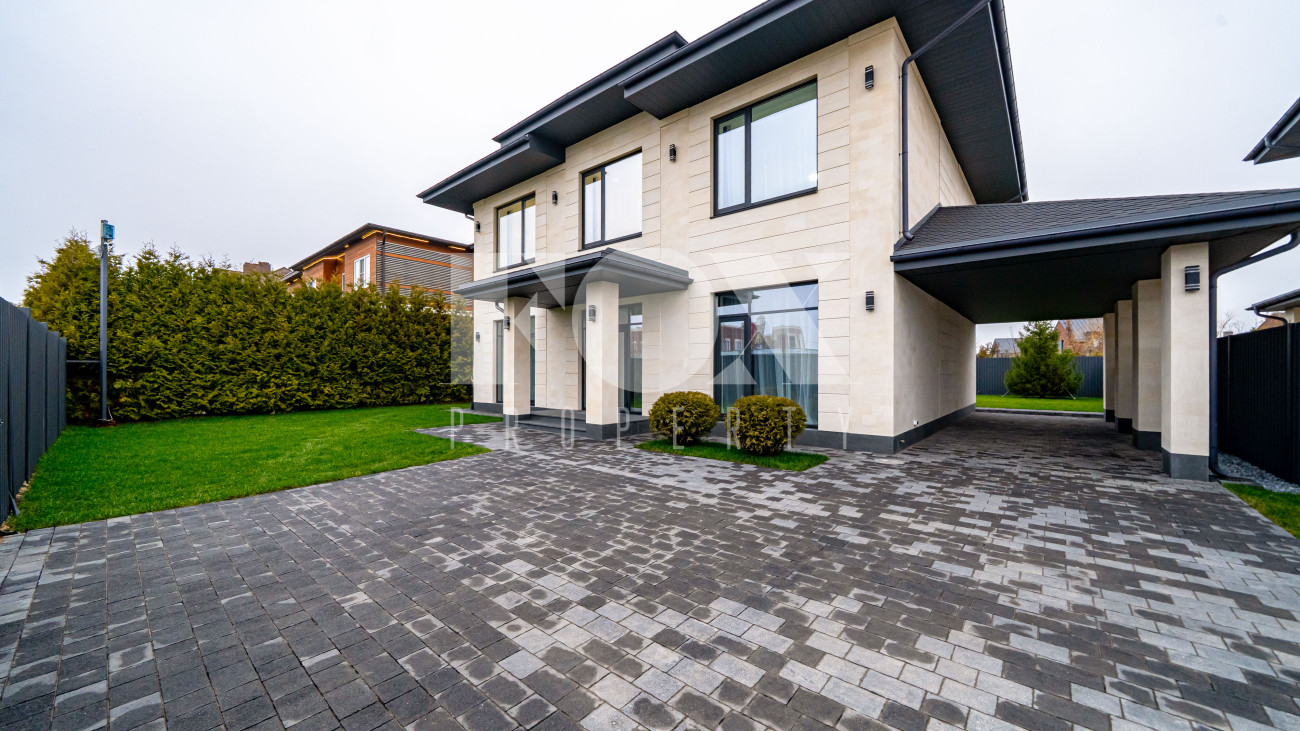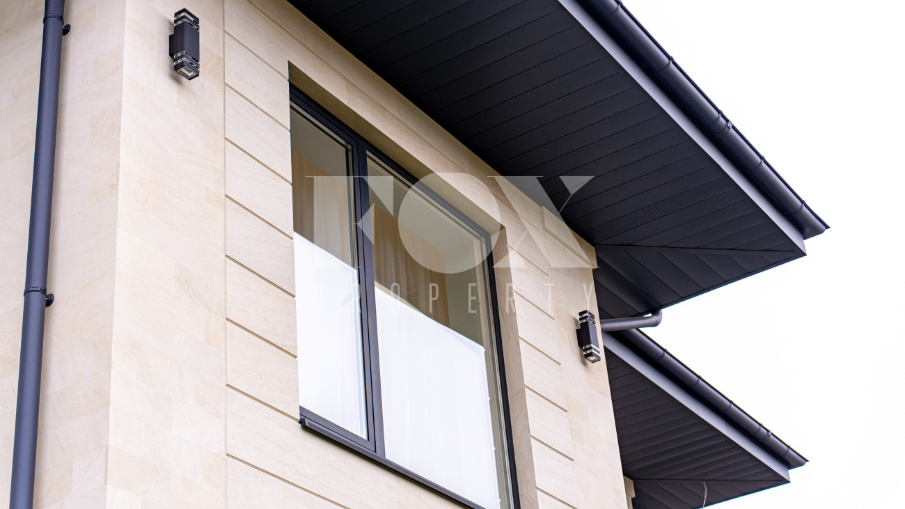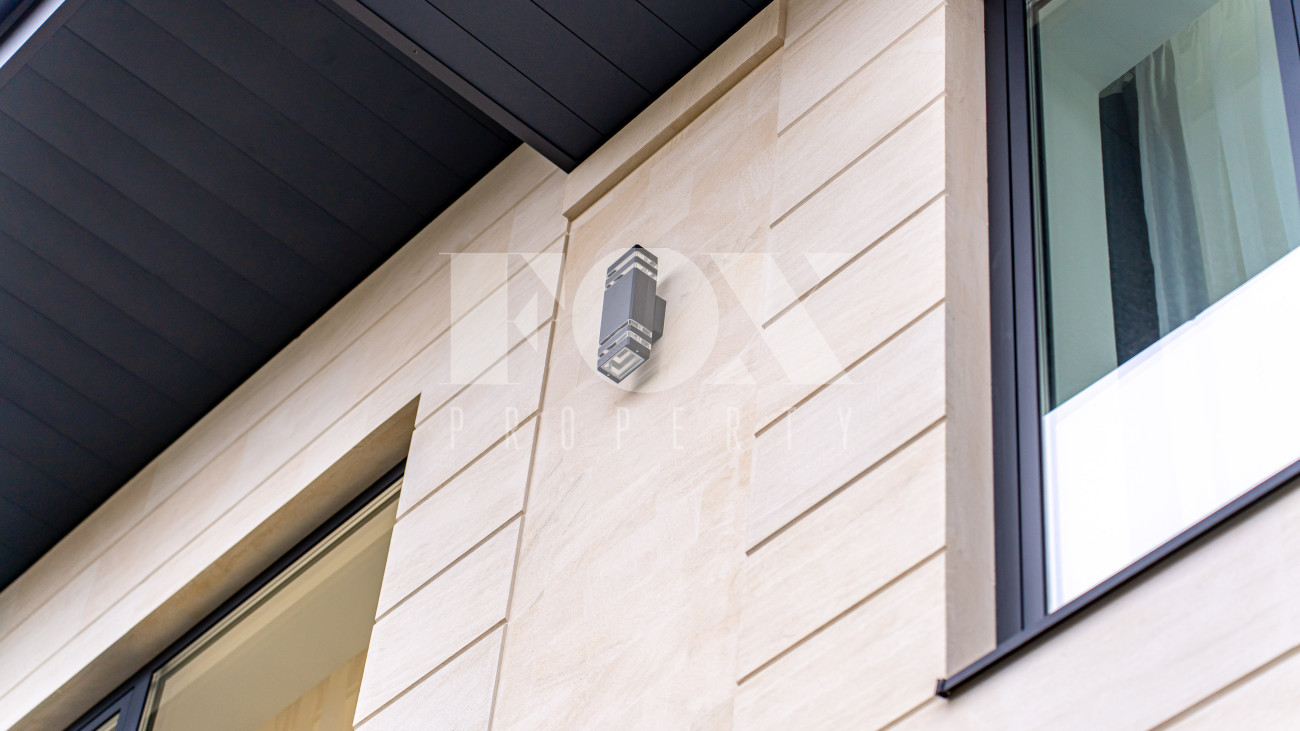 Архитектура дома выполнена в современном стиле с акцентом на выразительность и свободу планировки. Фасад облицован дагестанским камнем, установлены алюминиевые окна, уложена премиальная брусчатка Steingot. Забор оснащён электроприводом.