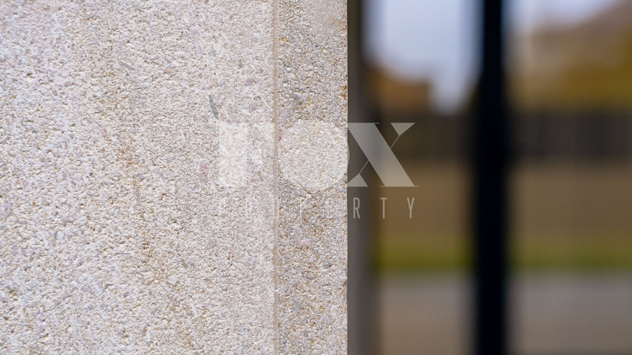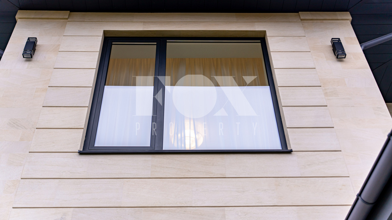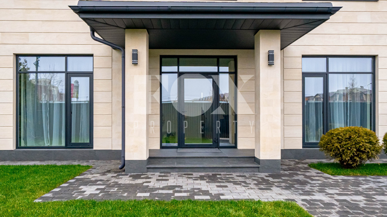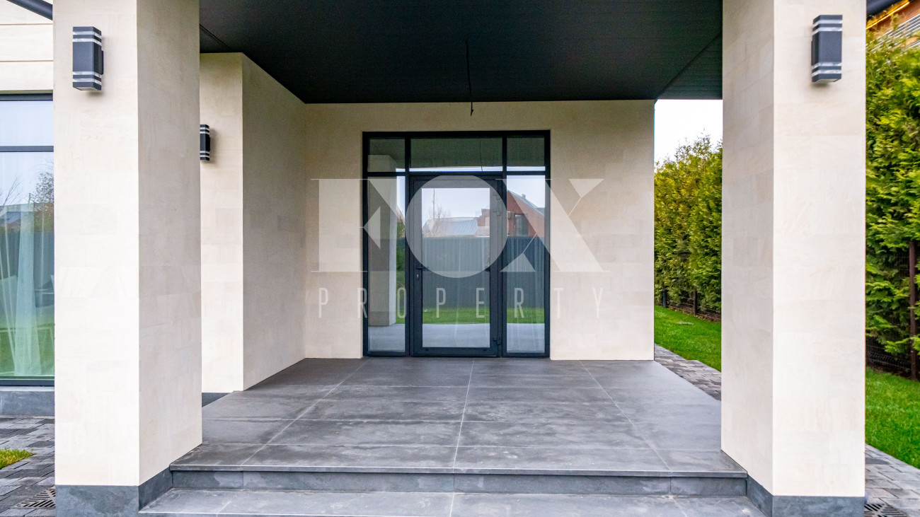 Архитектура дома выполнена в современном стиле с акцентом на выразительность и свободу планировки. Фасад облицован дагестанским камнем, установлены алюминиевые окна, уложена премиальная брусчатка Steingot. Забор оснащён электроприводом.