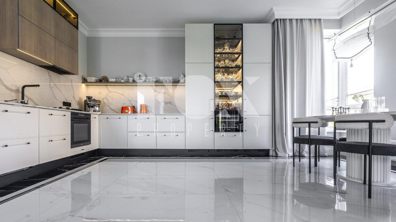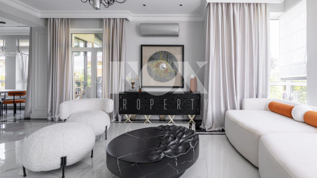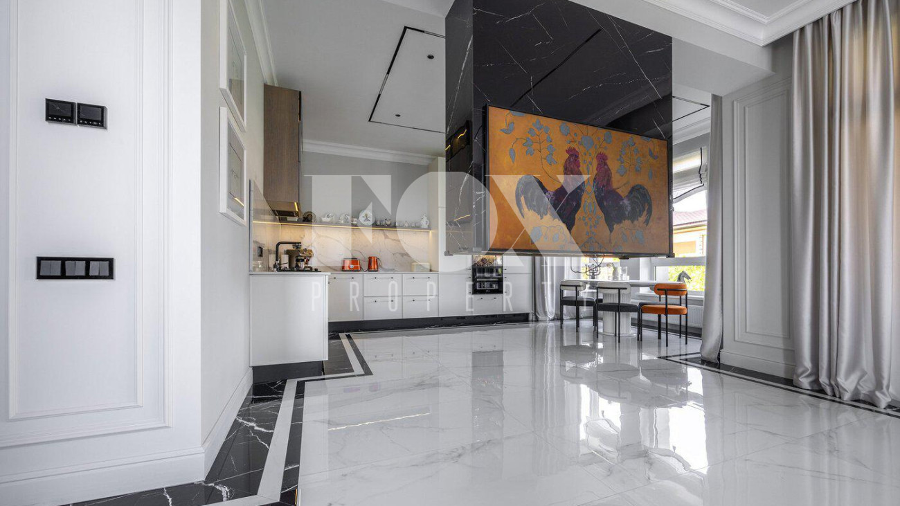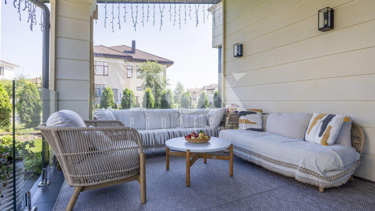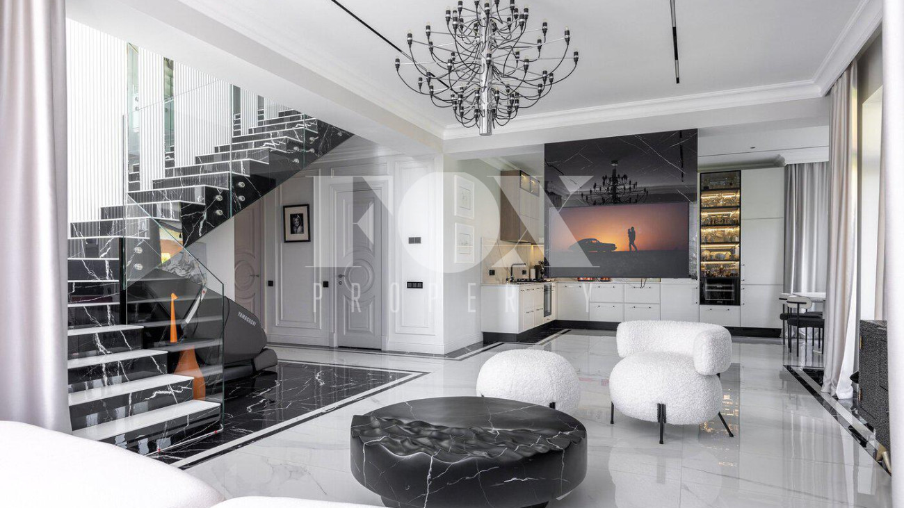 В доме выполнен дизайнерский ремонт, полностью меблирован и укомплектован всей необходимой мебелью, готов к проживанию. Кухня укомплектована профессиональной встроенной техникой Asko и Korting. Высокие потолки и панорамные окна создают атмосферу света и простора. Для безопасности установлена современная охранная система с датчиками движения и контроля доступа, а также климат-контроль с мультисплит-системой кондиционирования и автоматической регулировкой отопления. Также установлена профессиональная система очистки воды.