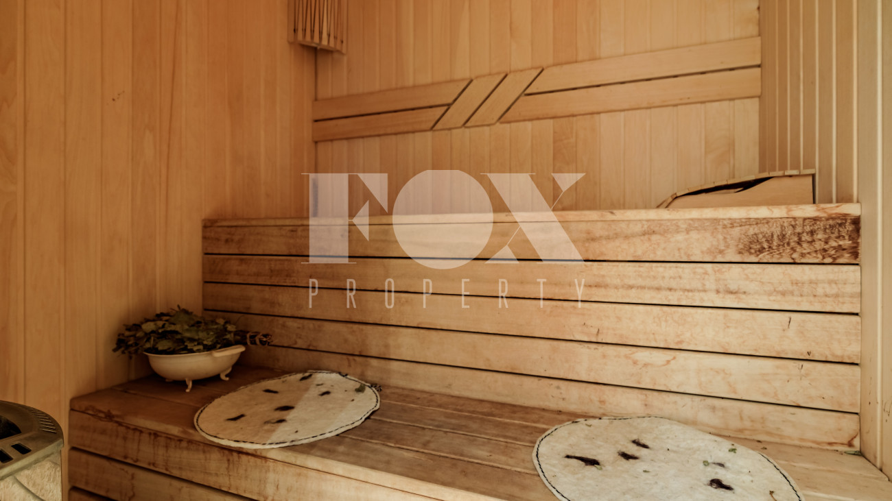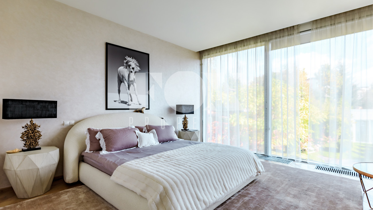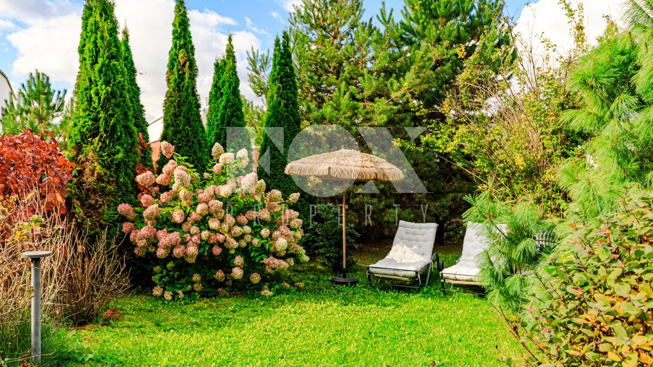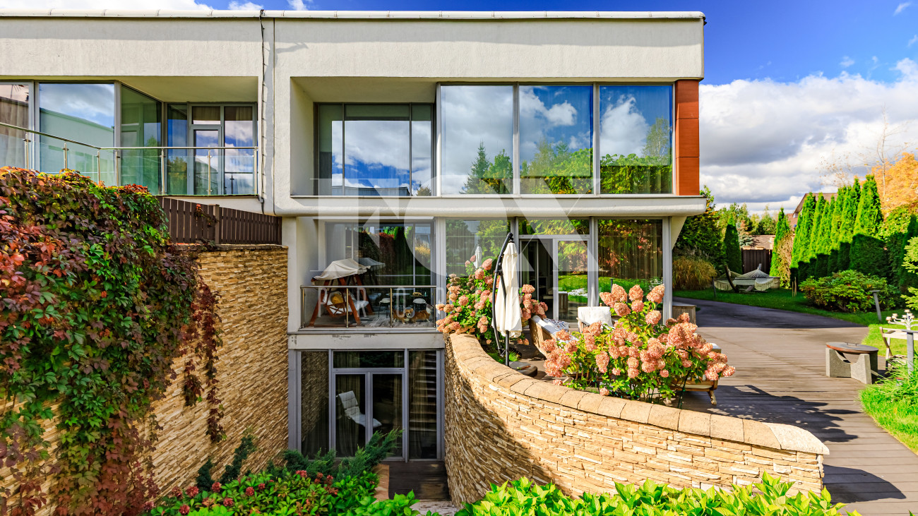 Второй уровень занимает гостиная с камином на биотопливе, кухня, совмещенная с обеденной зоной, гостевой санузел, холл, гардеробная, прихожая, лоджия. Третий уровень включает в себя две спальни с гардеробными и санузлами, спальню с гардеробной, еще одну спальню, холл, полноценный санузел. Предусмотрен встроенный гараж на два машино-места. Также на участке расположен гостевой домик с камином, зона барбекю, зона релаксации, высажены красивые парковые и садовые растения.