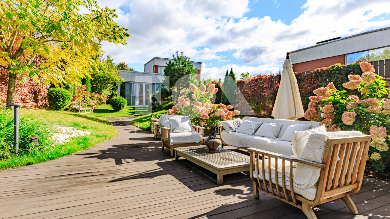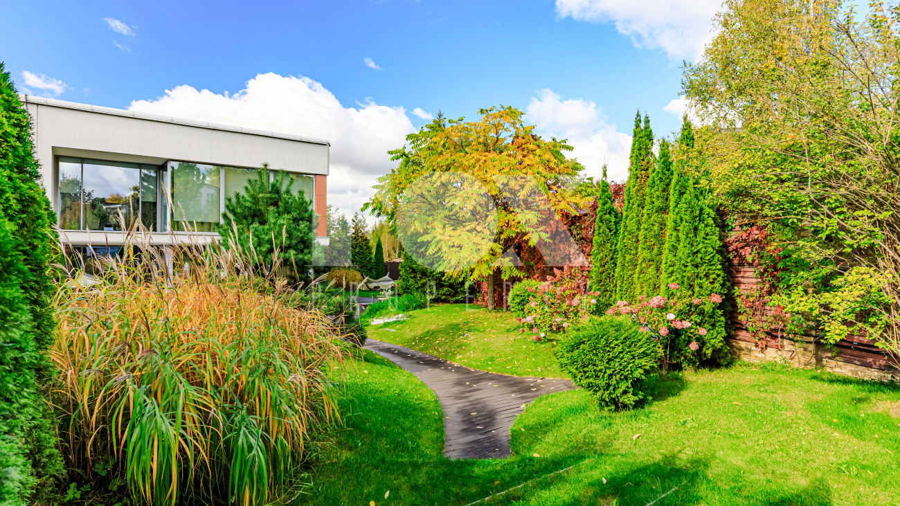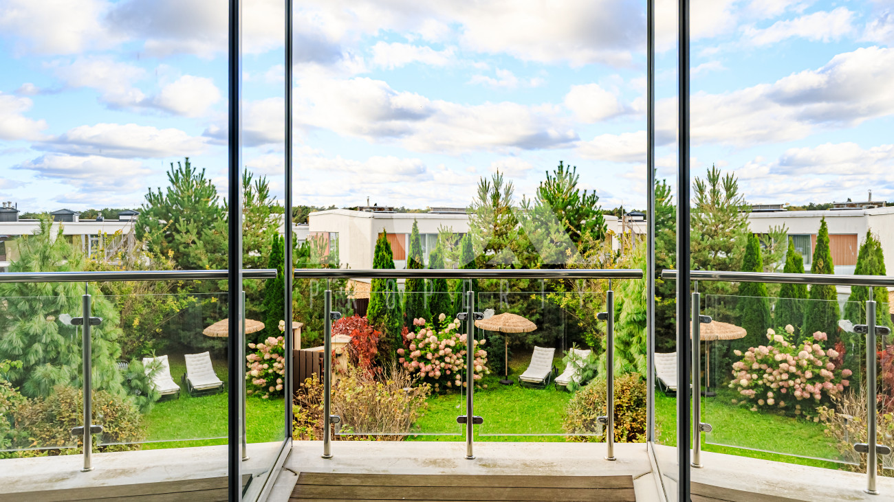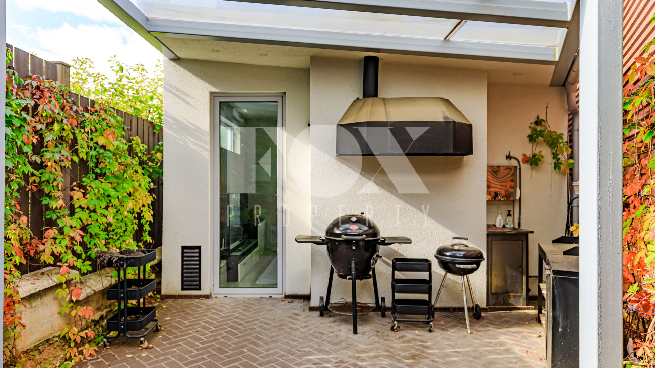 Второй уровень занимает гостиная с камином на биотопливе, кухня, совмещенная с обеденной зоной, гостевой санузел, холл, гардеробная, прихожая, лоджия. Третий уровень включает в себя две спальни с гардеробными и санузлами, спальню с гардеробной, еще одну спальню, холл, полноценный санузел. Предусмотрен встроенный гараж на два машино-места. Также на участке расположен гостевой домик с камином, зона барбекю, зона релаксации, высажены красивые парковые и садовые растения.