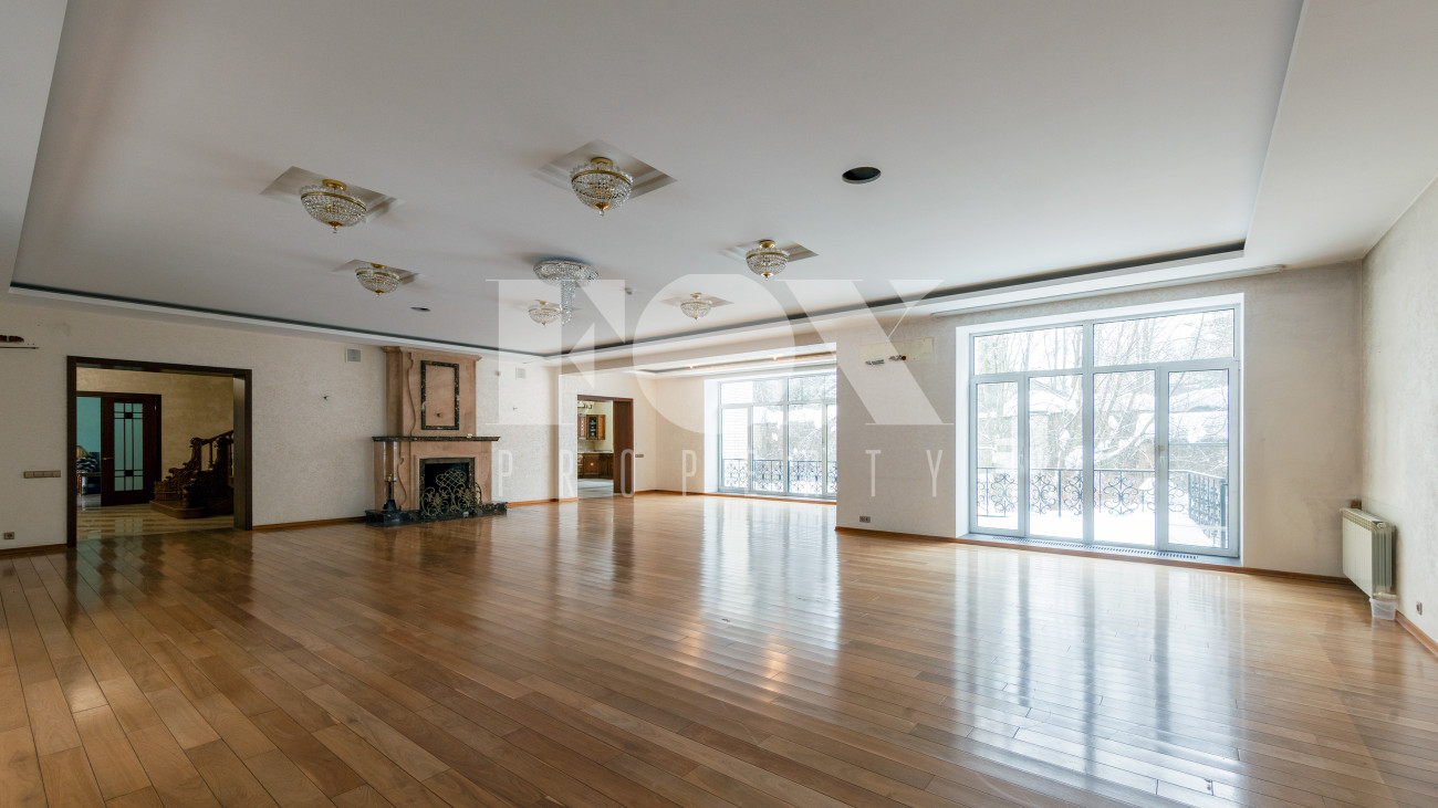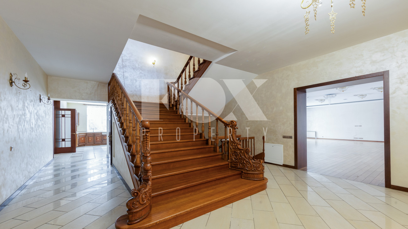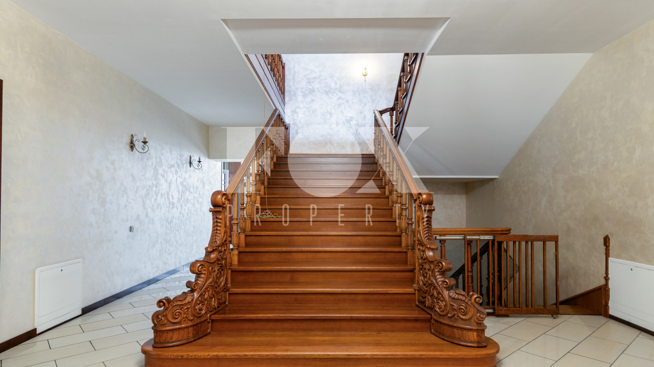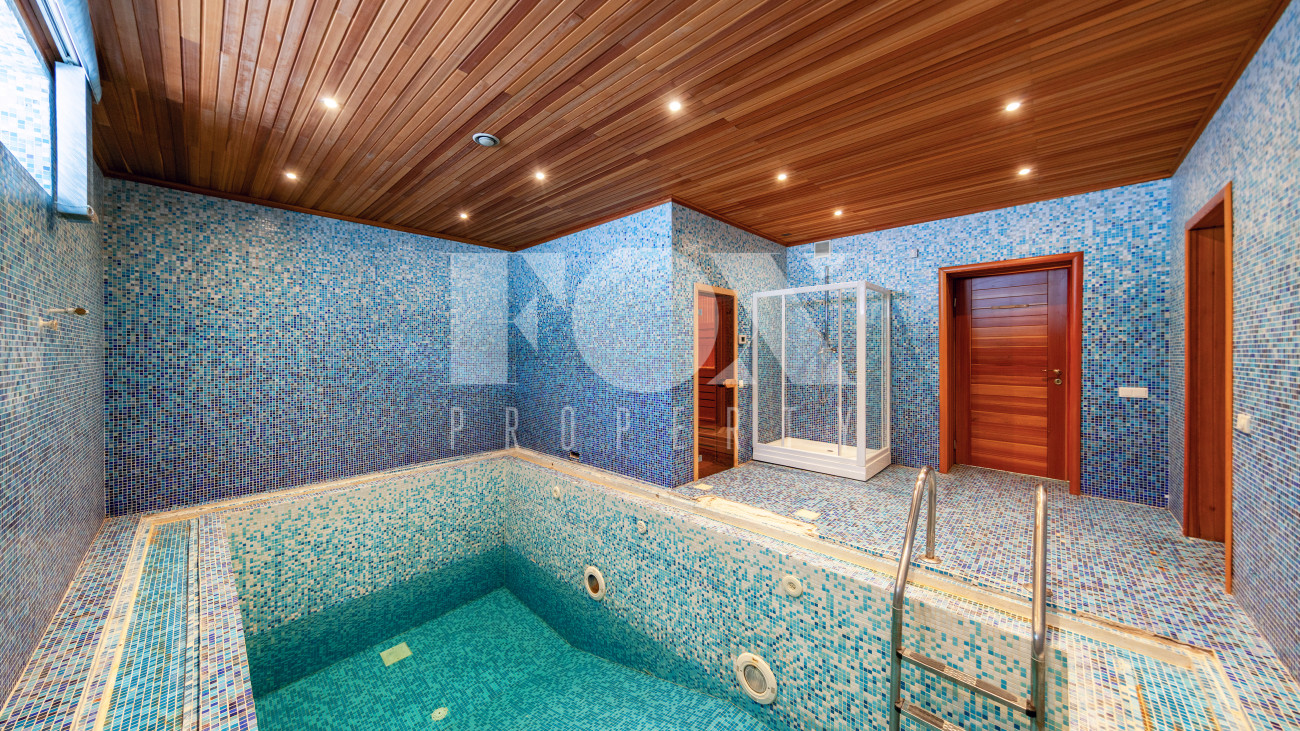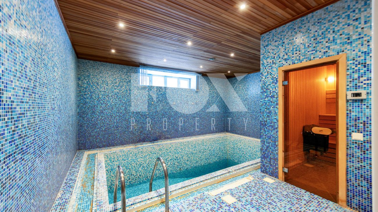 В доме собственная зона отдыха и спорта, просторная гостиная с камином, кабинет и библиотека, зимний сад, кухня – столовая, тренажерный зал, бильярдная, СПА зона с бассейном, сауной и комнатой отдыха, 5 спален, 8 с/у. Цокольный этаж предусматривает отдельные помещения для персонала и гараж на 4 м/м. Отдельно стоящий дом для охраны обеспечивает дополнительный уровень приватности. Статус земли ИЖС. Все коммуникации централизованные.