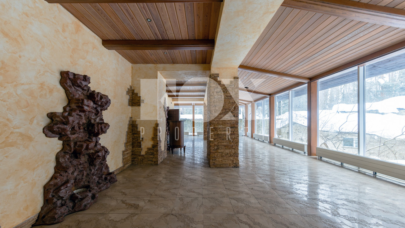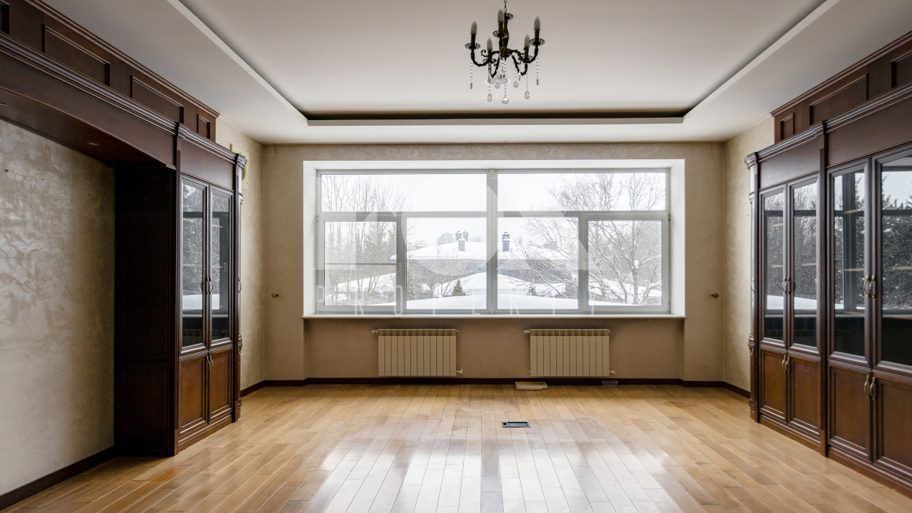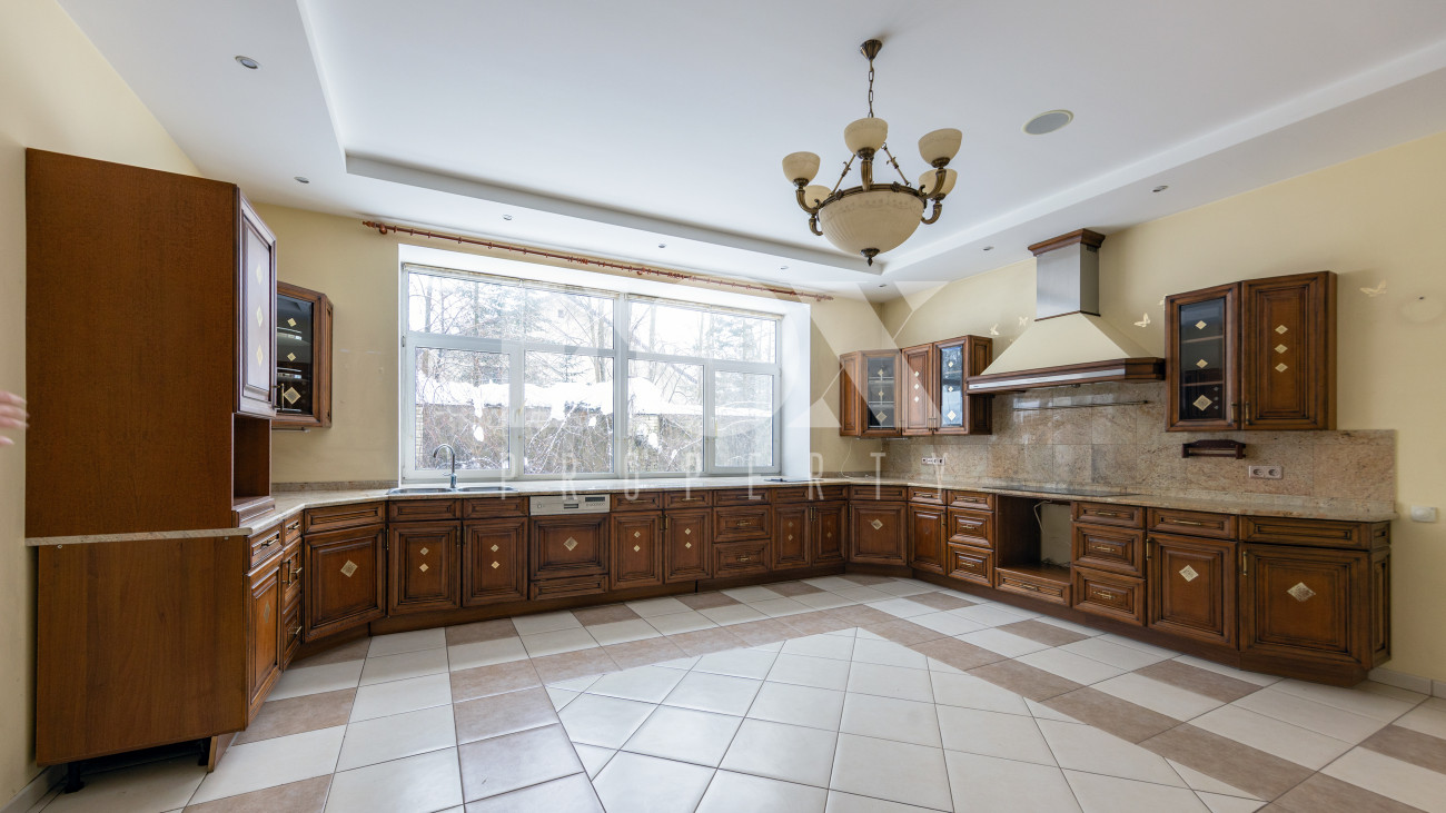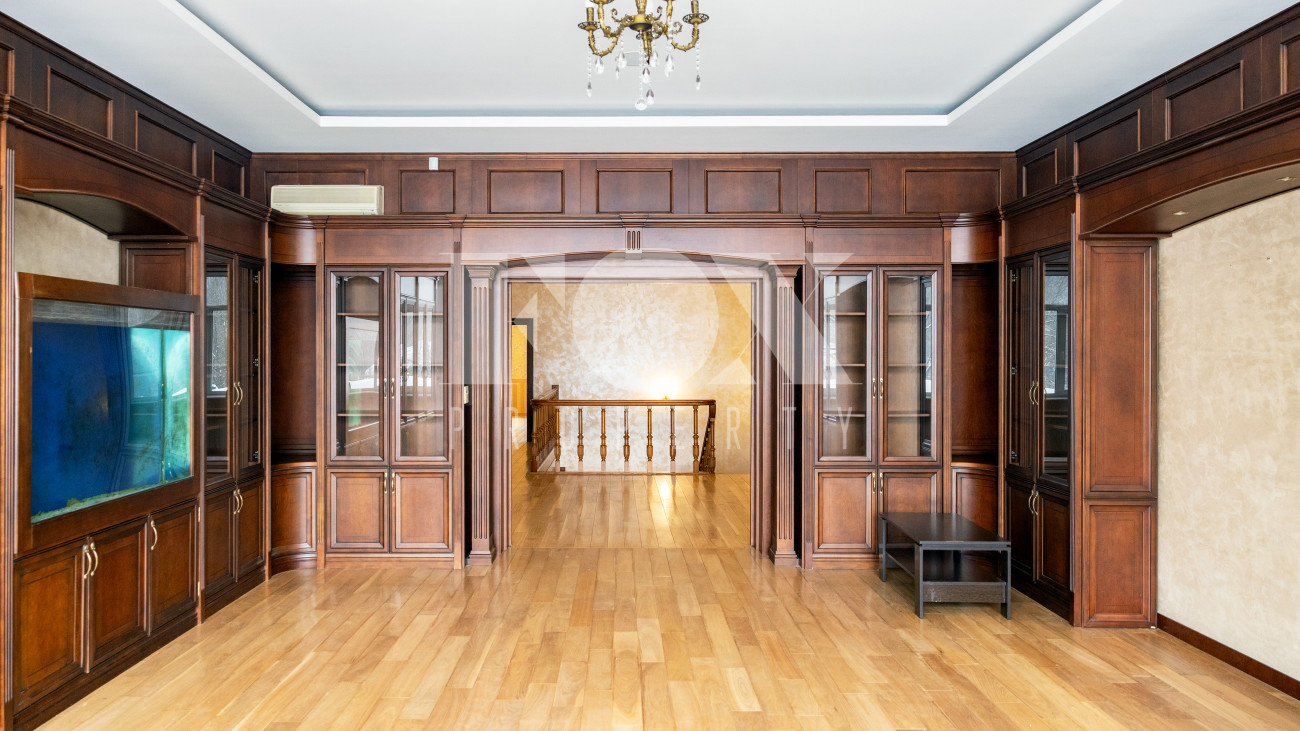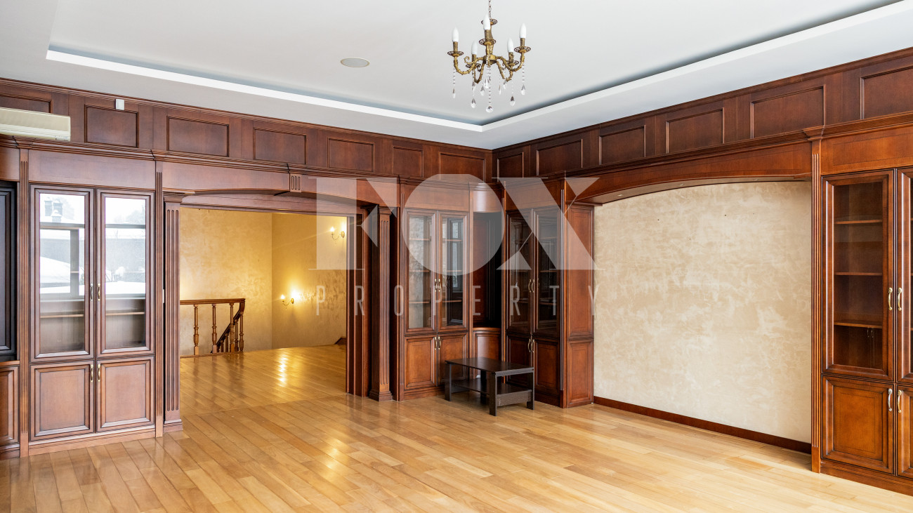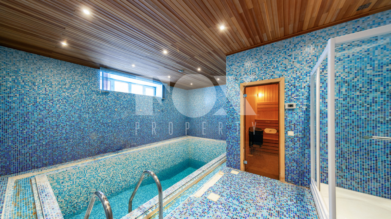 В доме собственная зона отдыха и спорта, просторная гостиная с камином, кабинет и библиотека, зимний сад, кухня – столовая, тренажерный зал, бильярдная, СПА зона с бассейном, сауной и комнатой отдыха, 5 спален, 8 с/у. Цокольный этаж предусматривает отдельные помещения для персонала и гараж на 4 м/м. Отдельно стоящий дом для охраны обеспечивает дополнительный уровень приватности. Статус земли ИЖС. Все коммуникации централизованные.