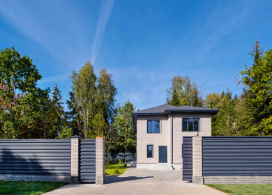Въезд в поселок через шлагбаум и пост охраны. Рядом супермаркет 'перекресток', сбербанк, химчистка, школа, лес.