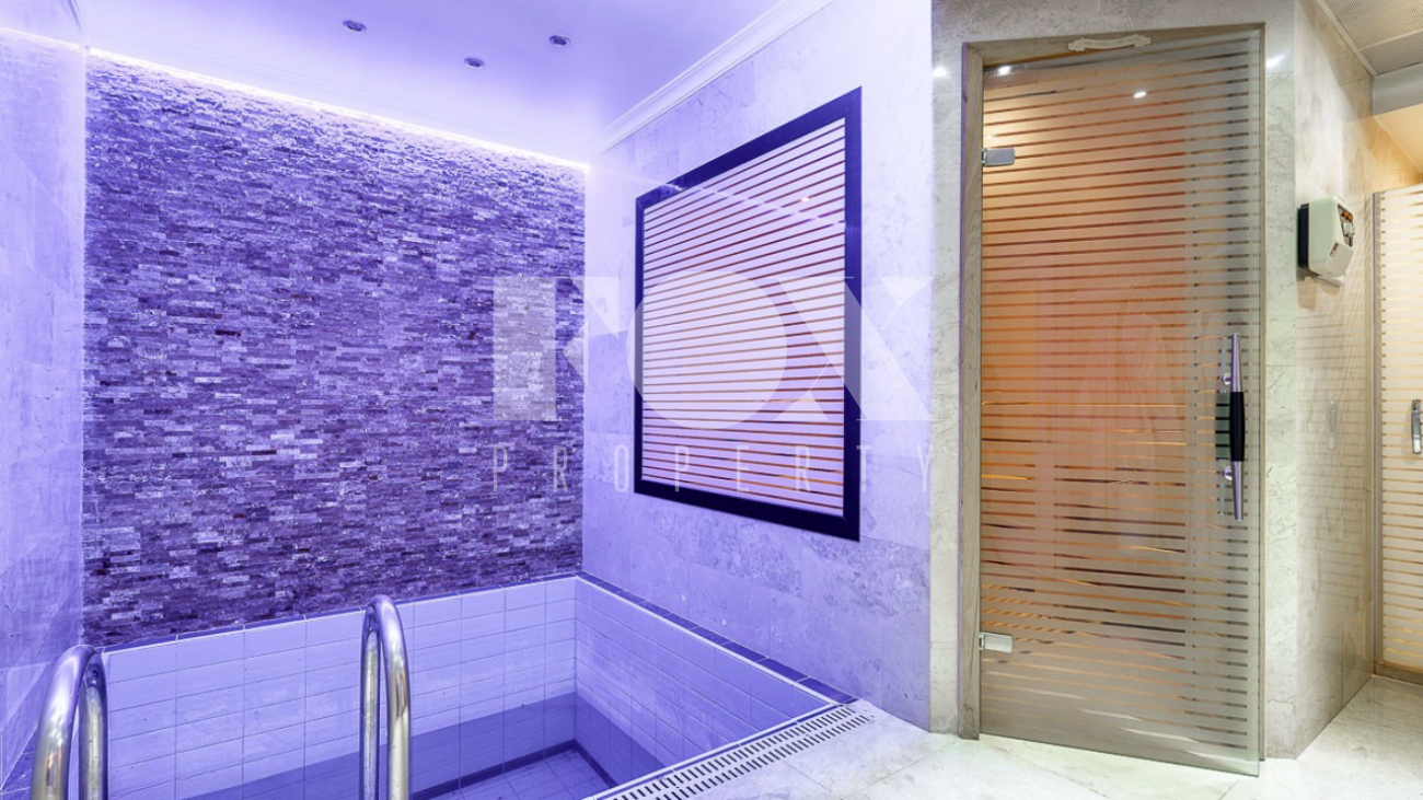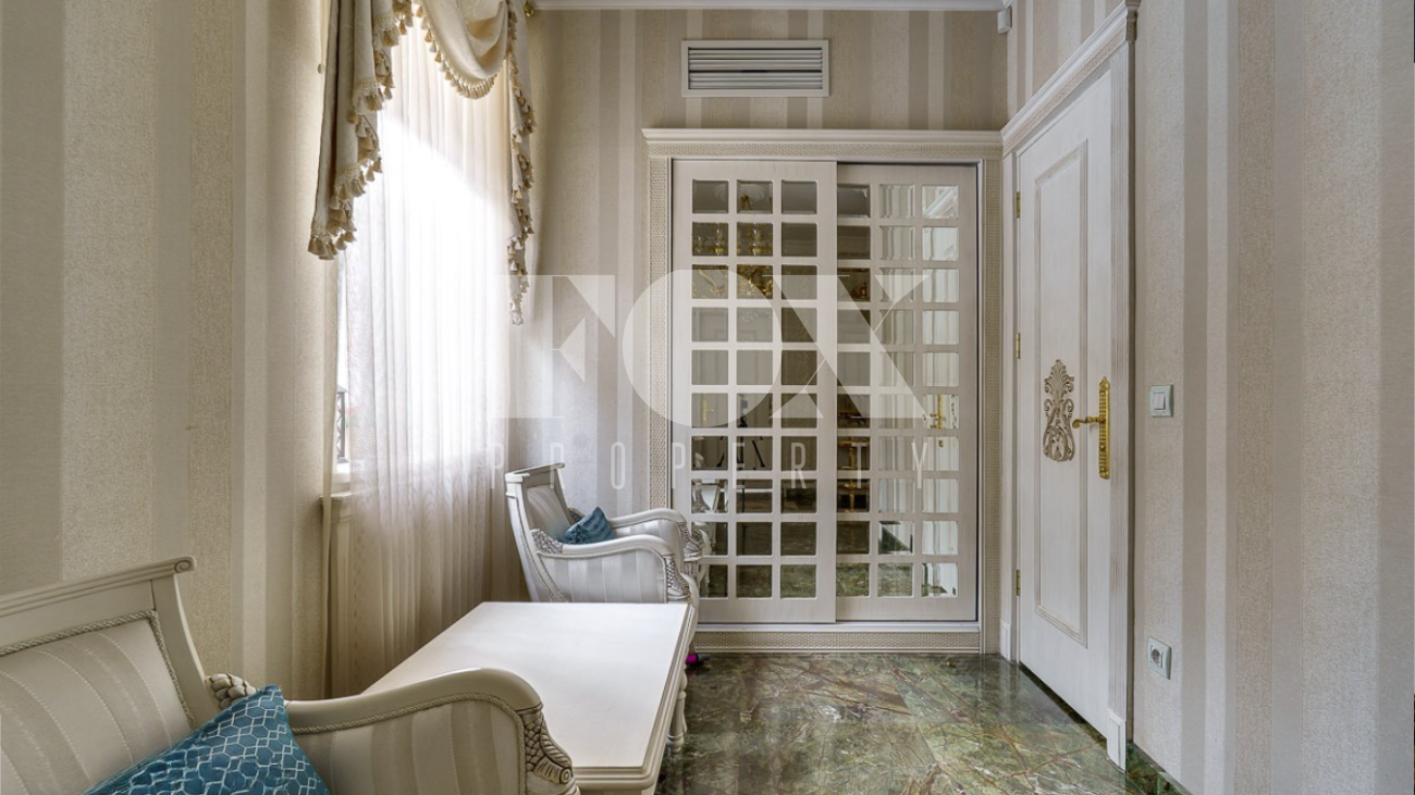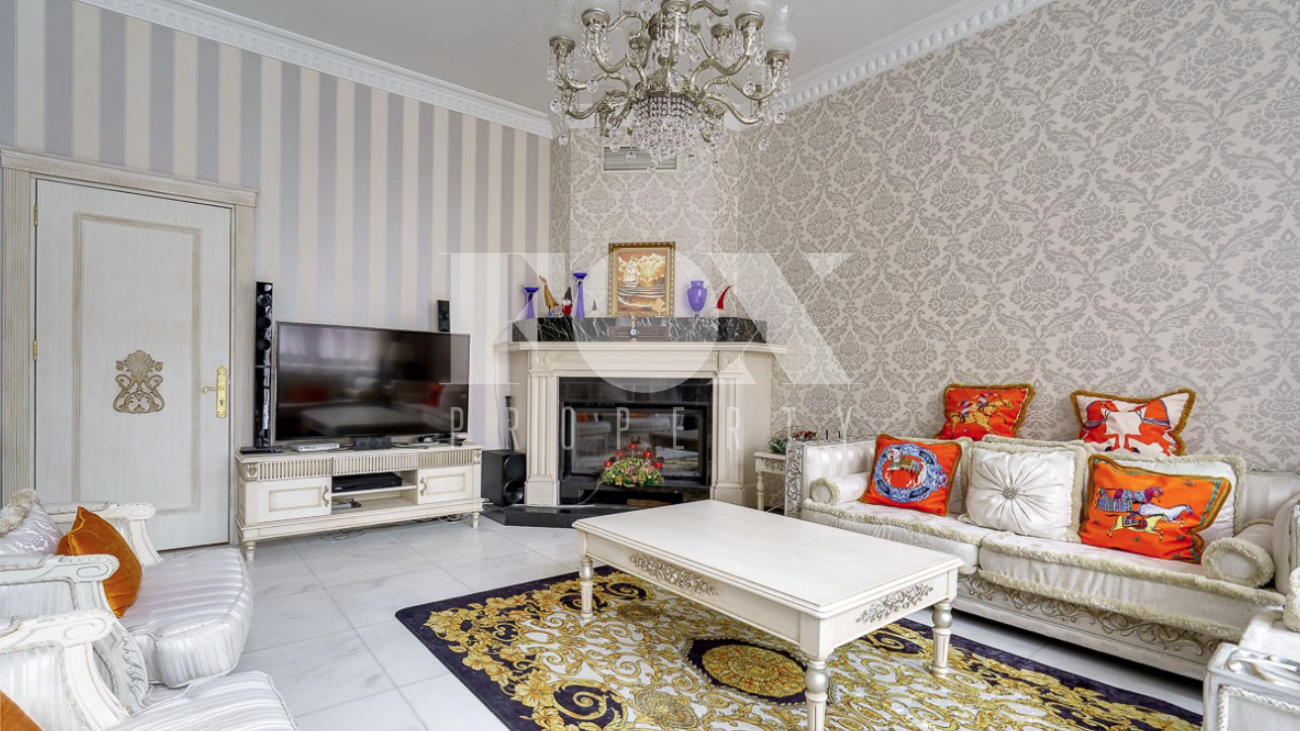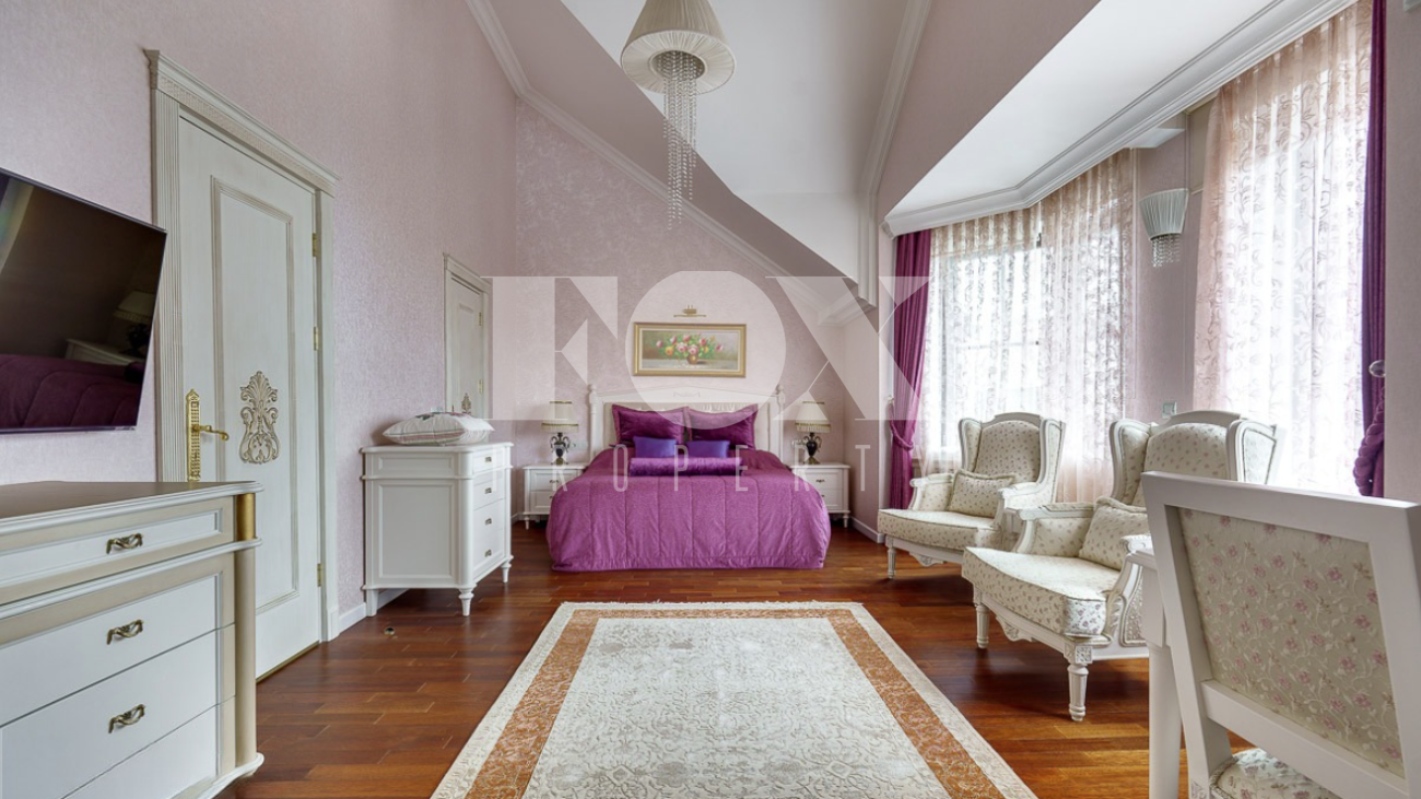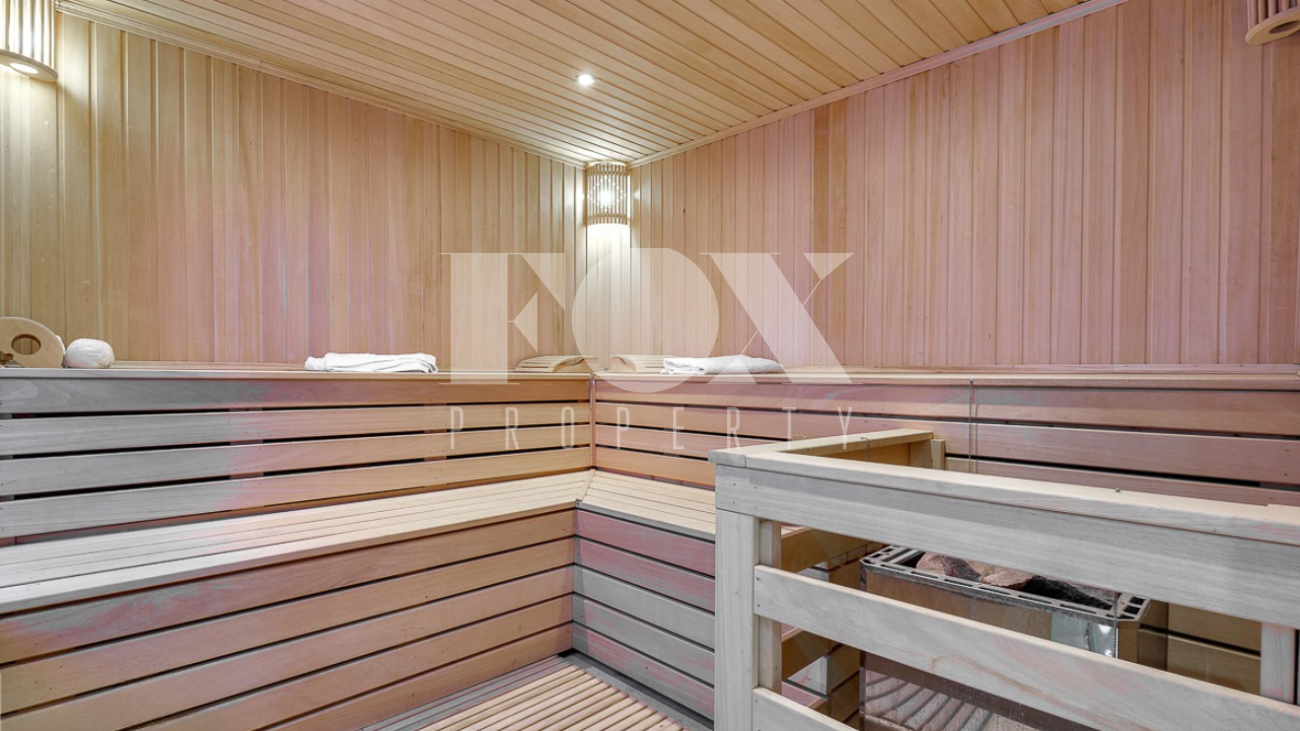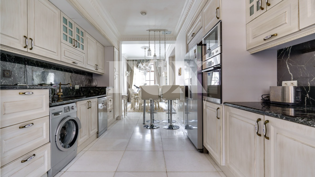 Таунхаус площадью 400 кв.м расположен на небольшом участке в коттеджном поселке "Горки-8". В таунхаусе предусмотрены: 4 спальни, 5 с/у, гостиная, кухня, столовая, сезонная гардеробная, хаммам, купель и сауна. На участке также есть 2 паковочных места и небольшая летняя беседка.
